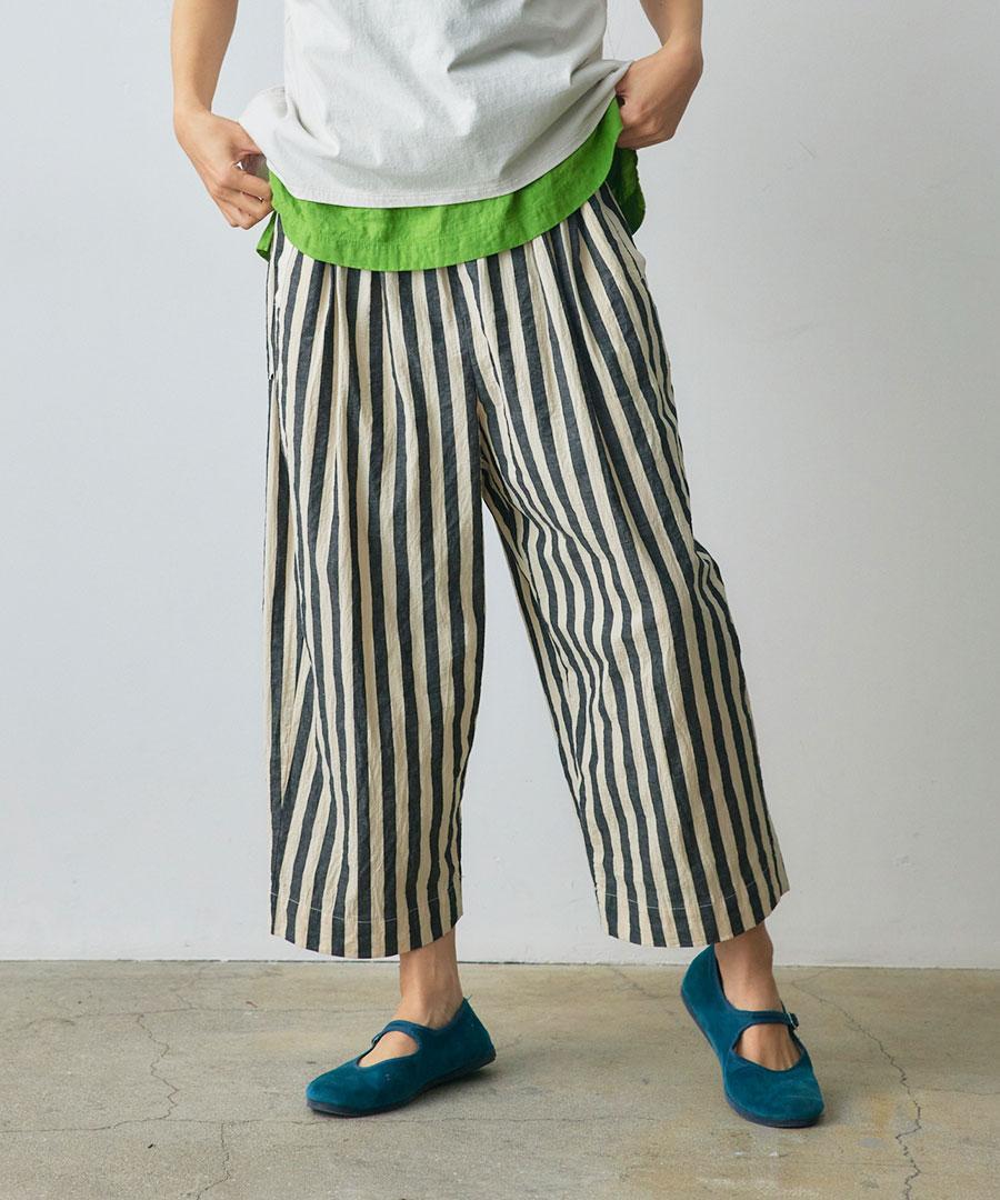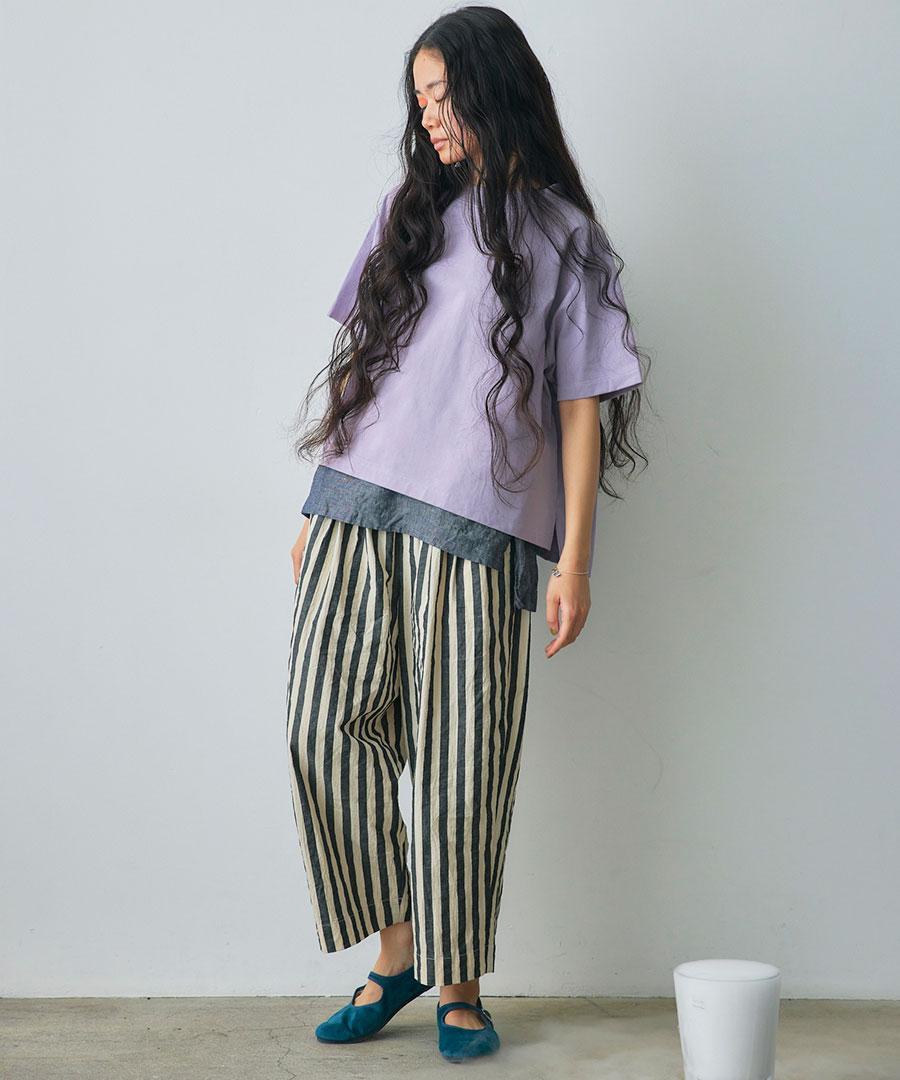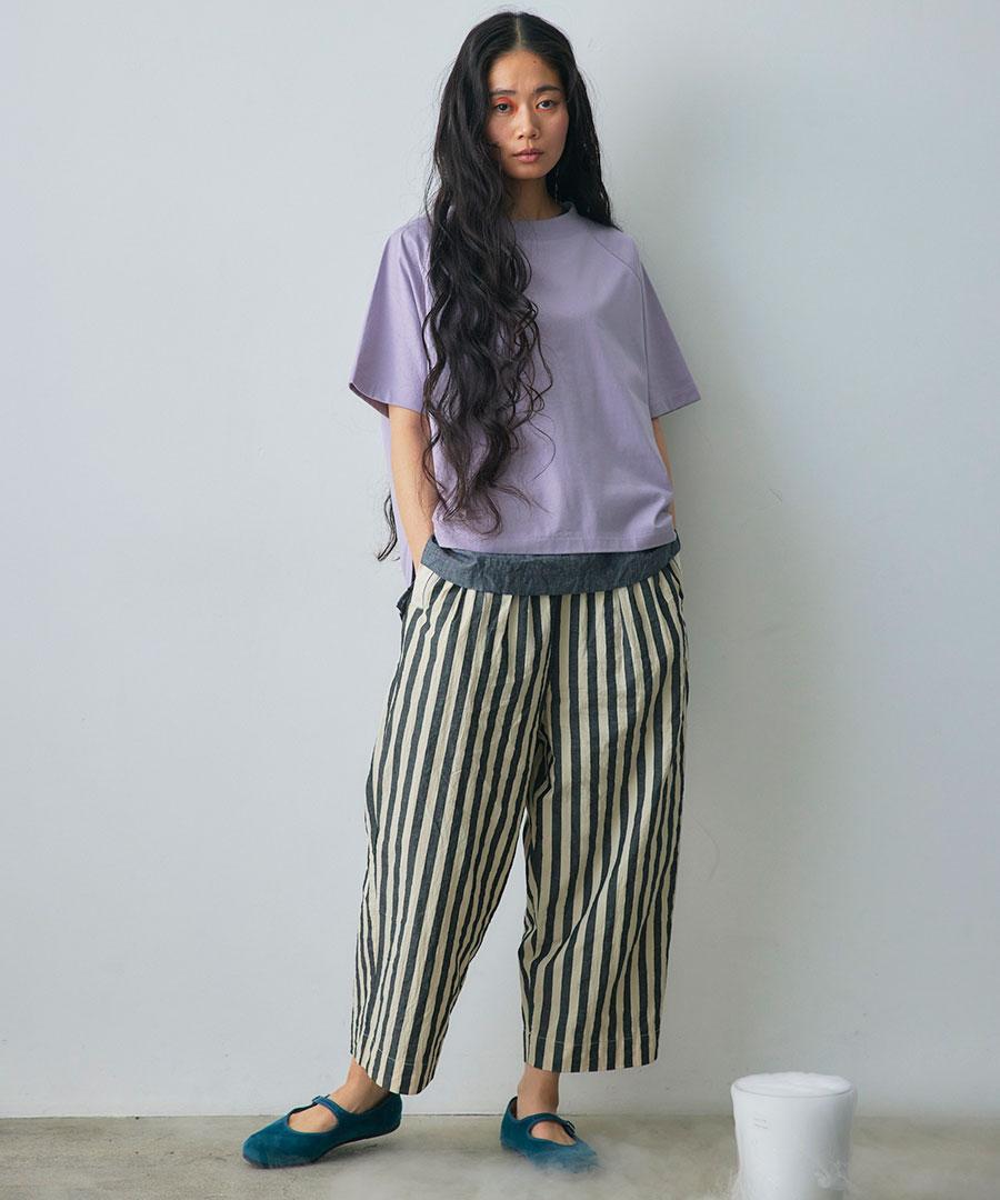 ワッシャー加工を施した肌離れのよい生地で仕立てたパンツ。