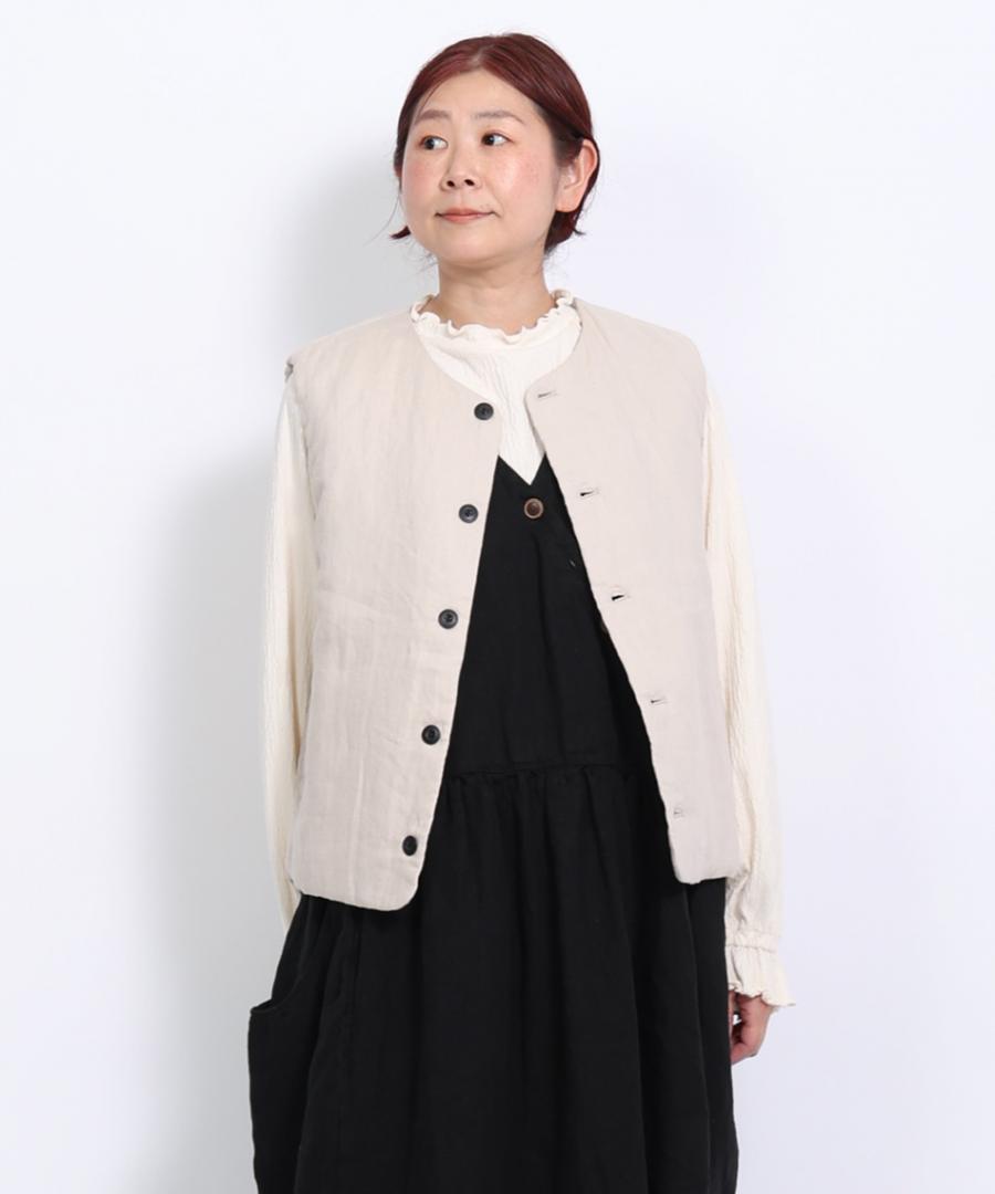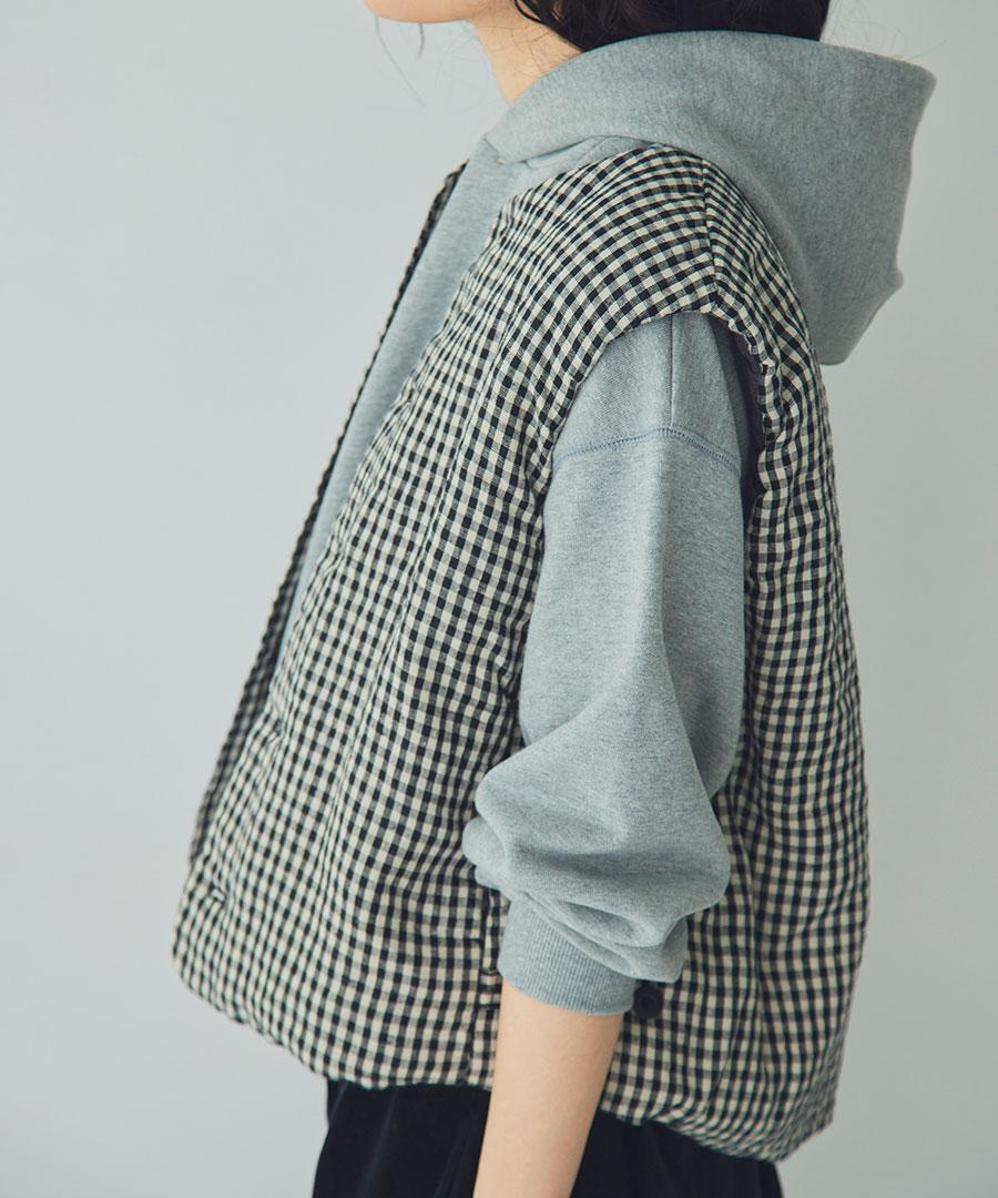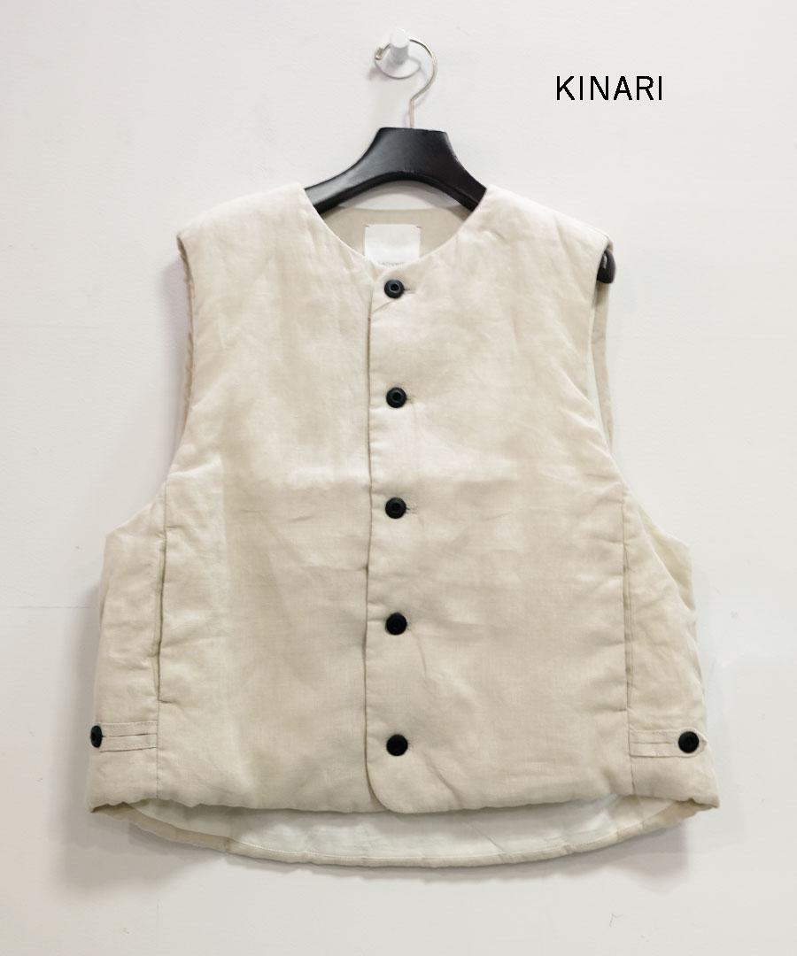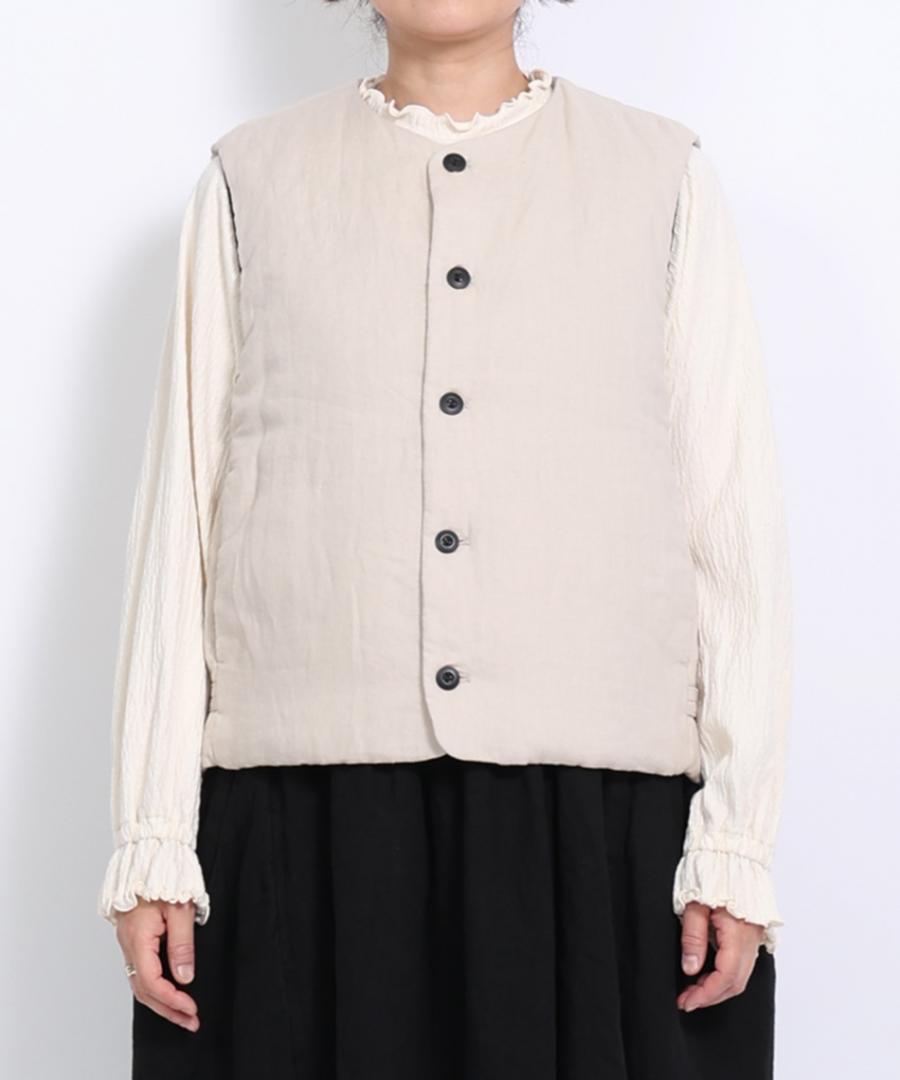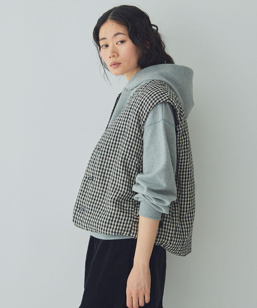 ジャケットよりも薄手の中綿入りで、着ぶくれする事なく防寒性もあるベストです。