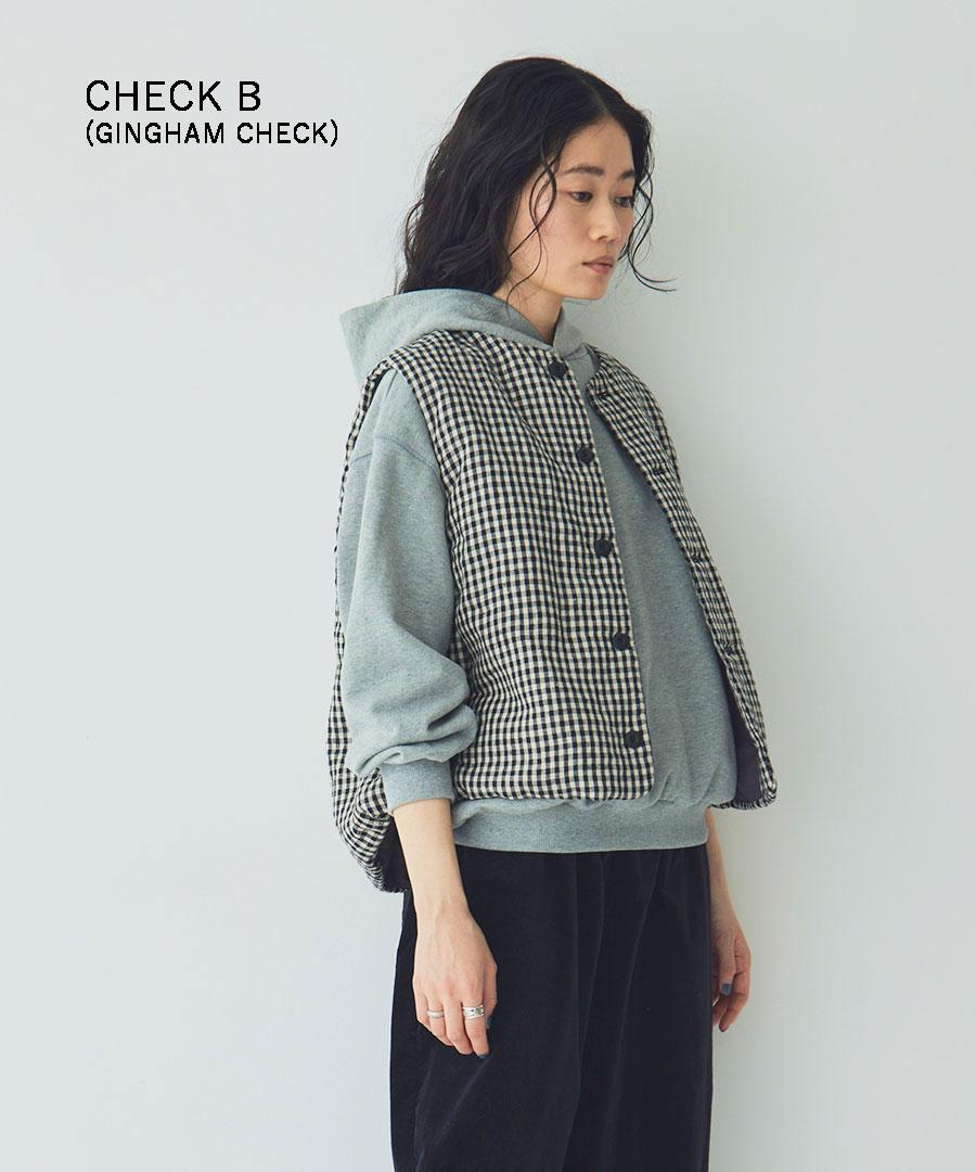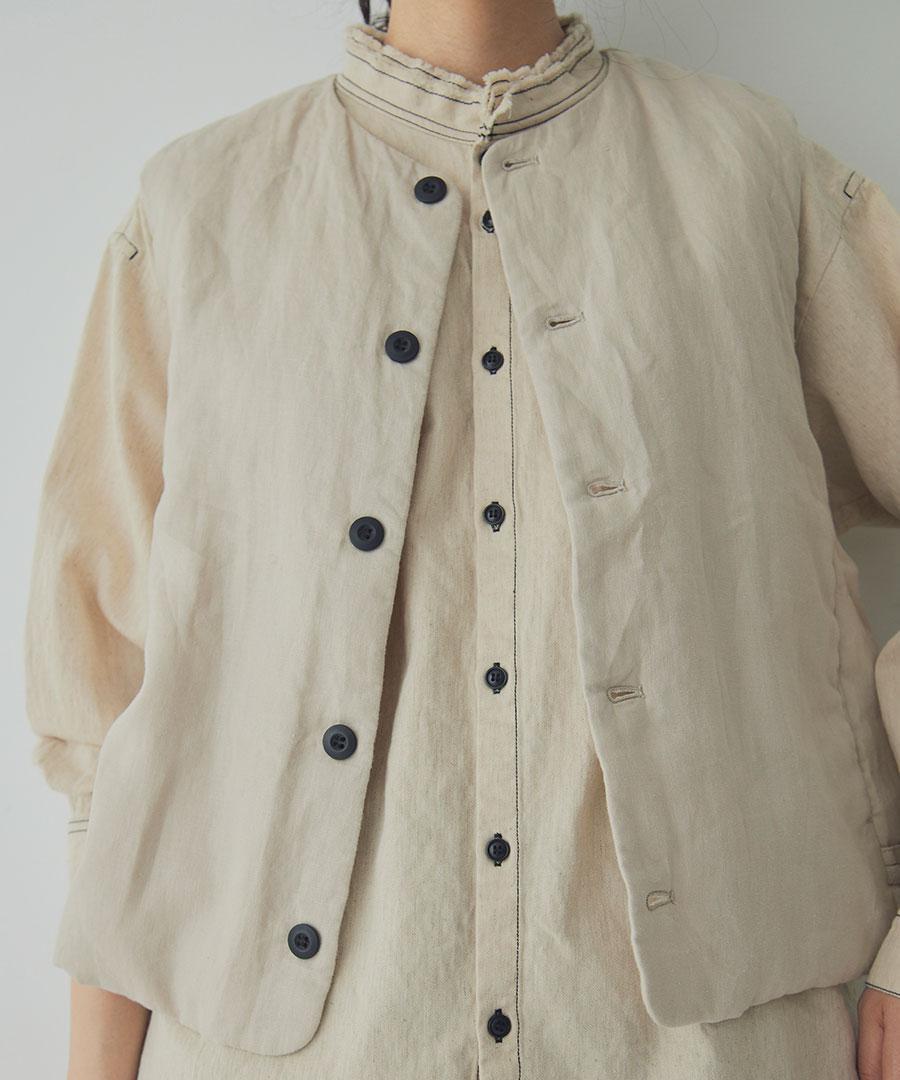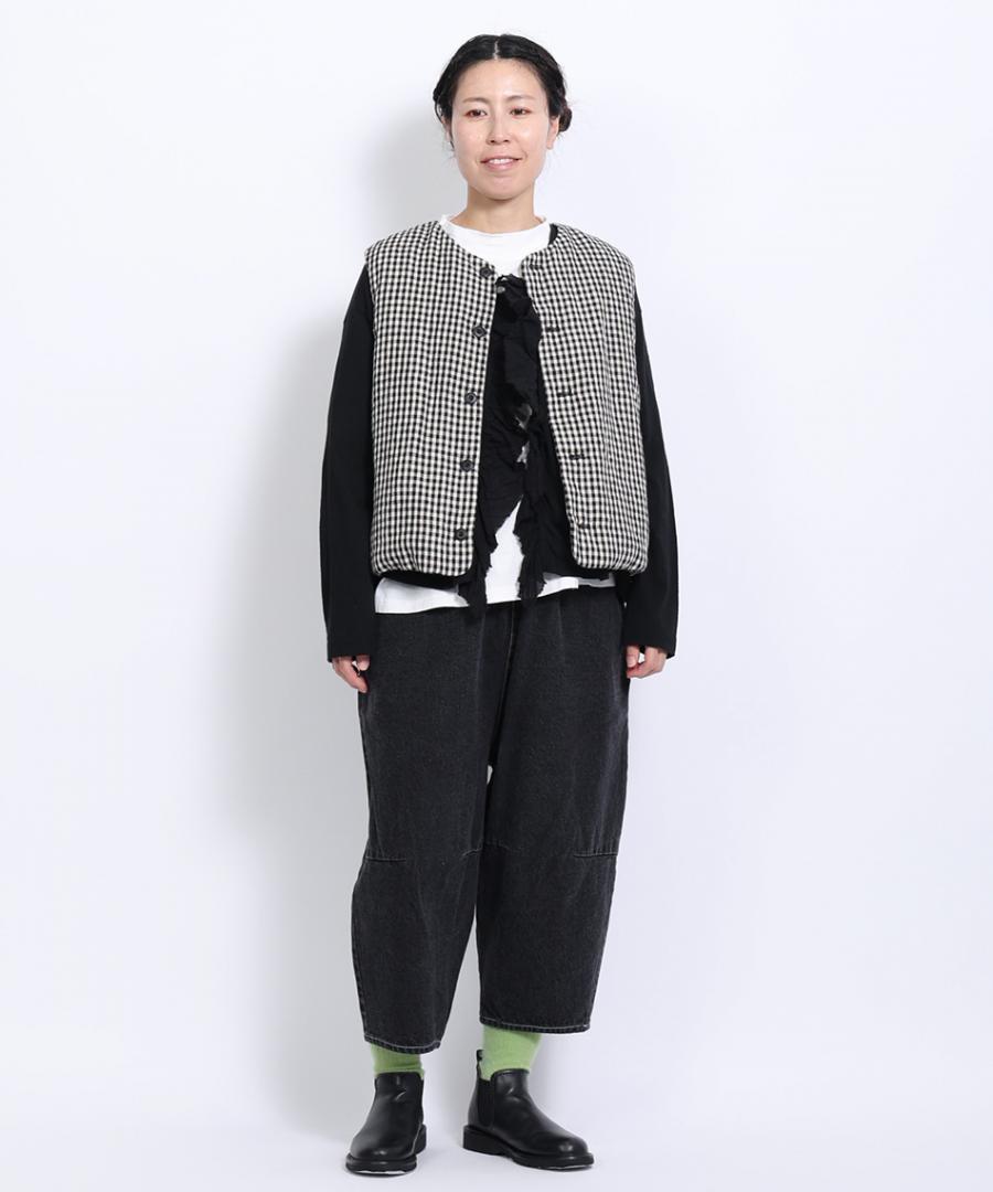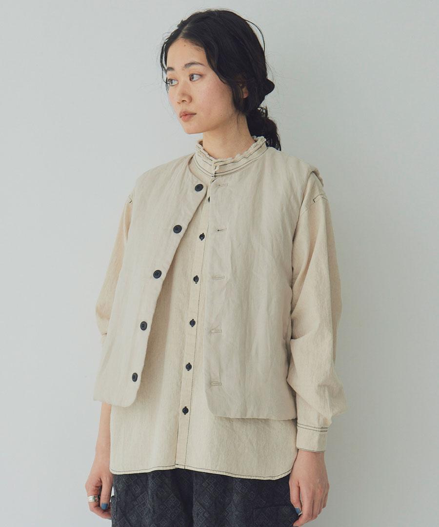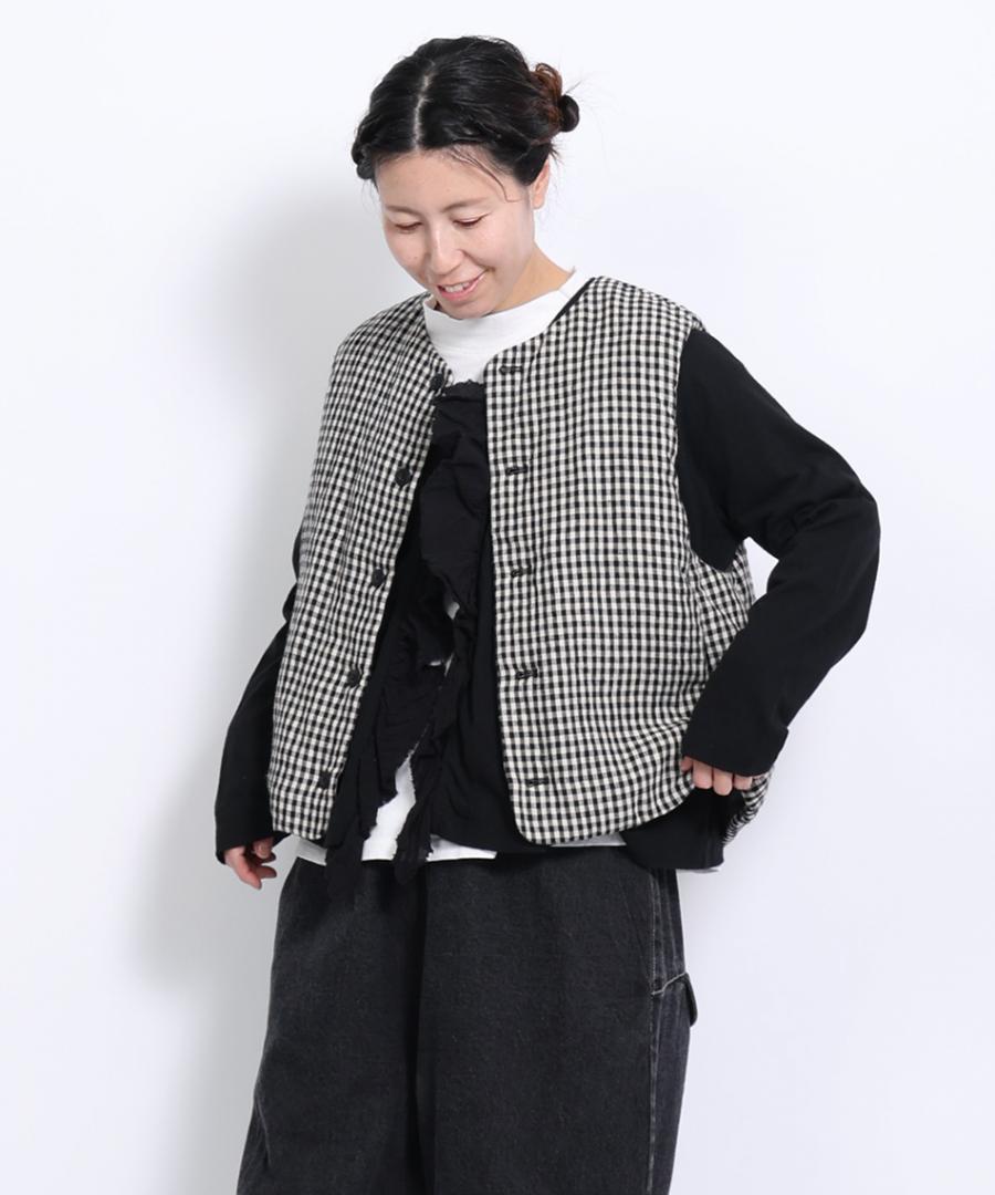 ジャケットよりも薄手の中綿入りで、着ぶくれする事なく防寒性もあるベストです。