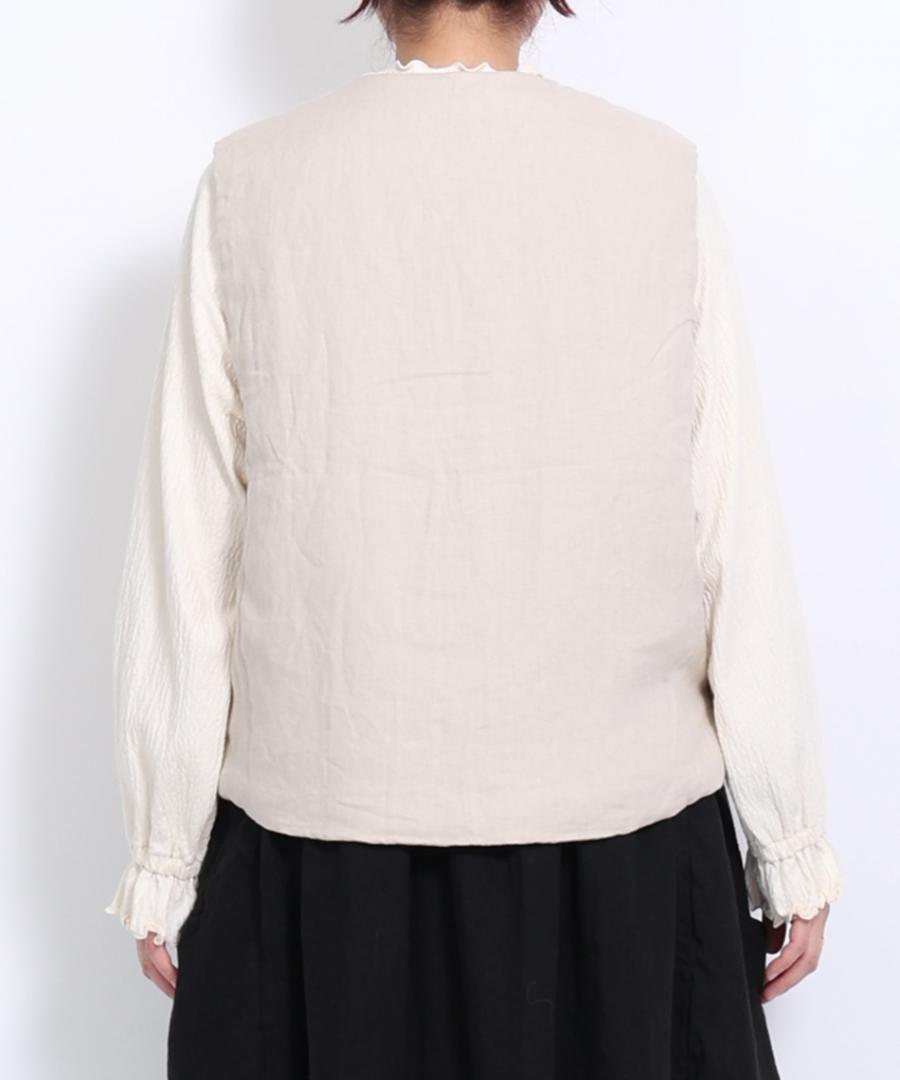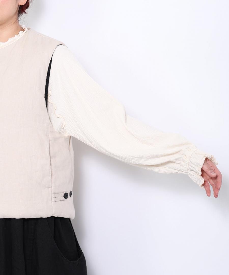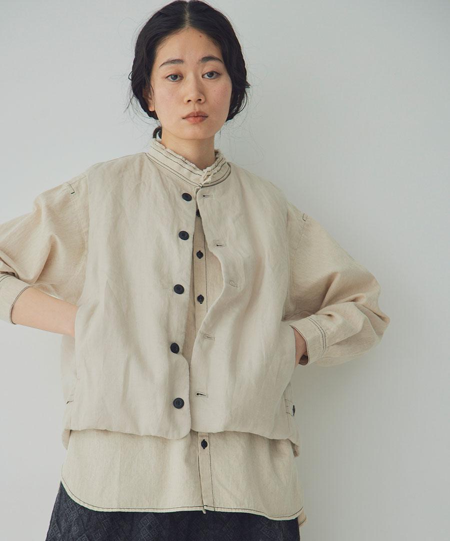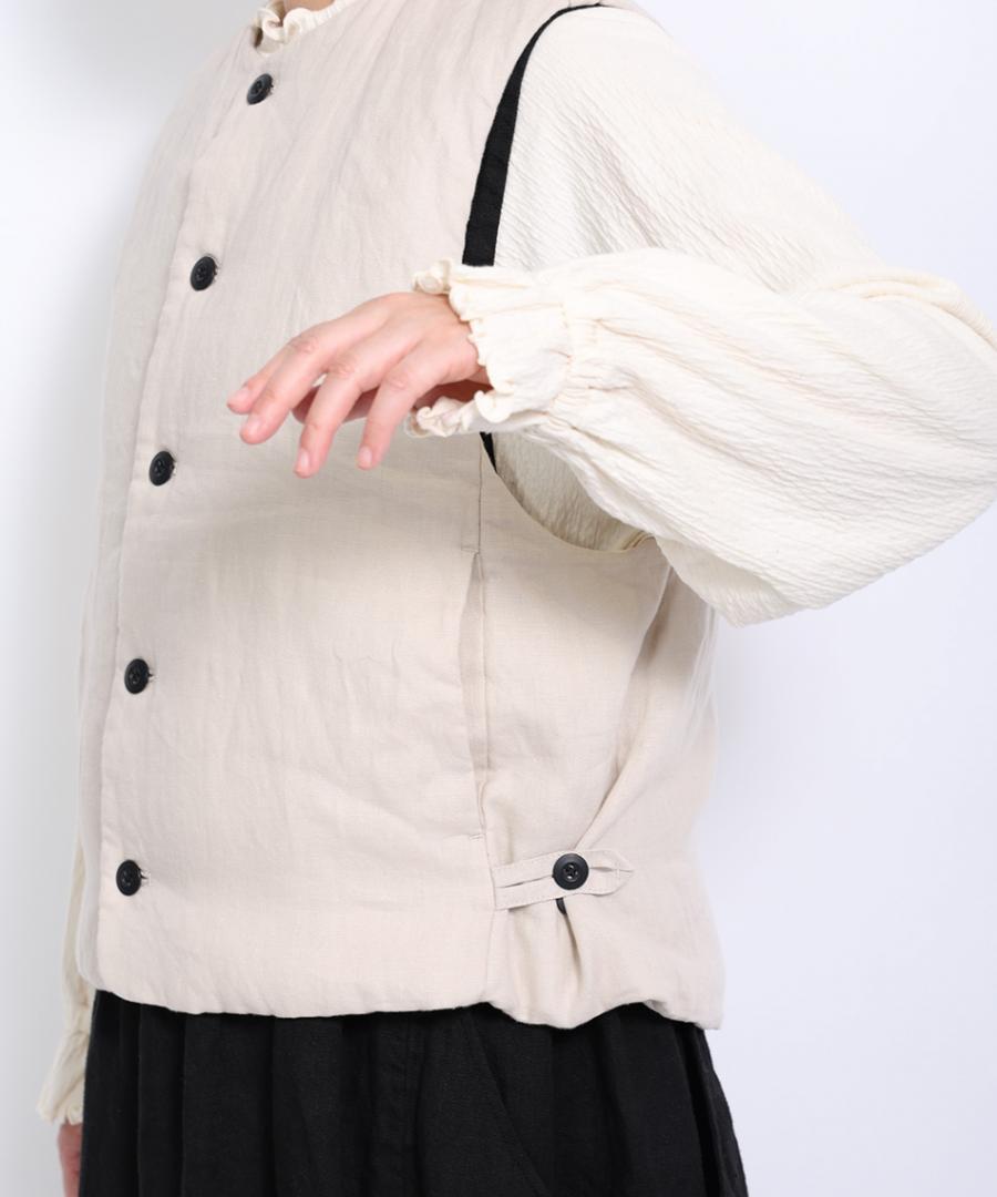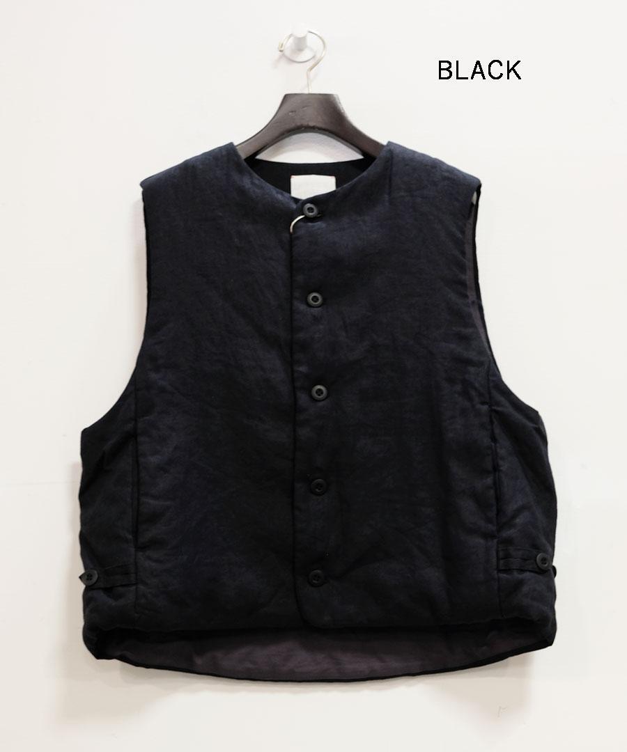 ジャケットよりも薄手の中綿入りで、着ぶくれする事なく防寒性もあるベストです。