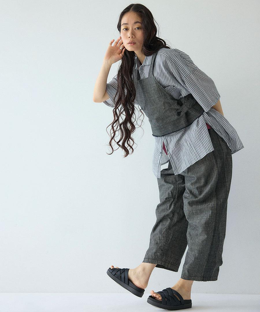 個性的なディテールが魅力の綿麻スラブデニムで仕立てたパンツ。