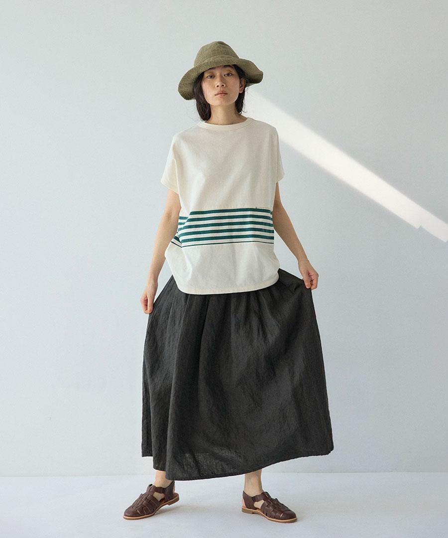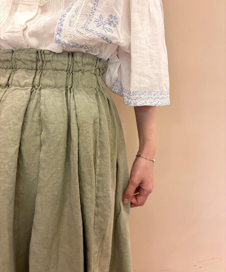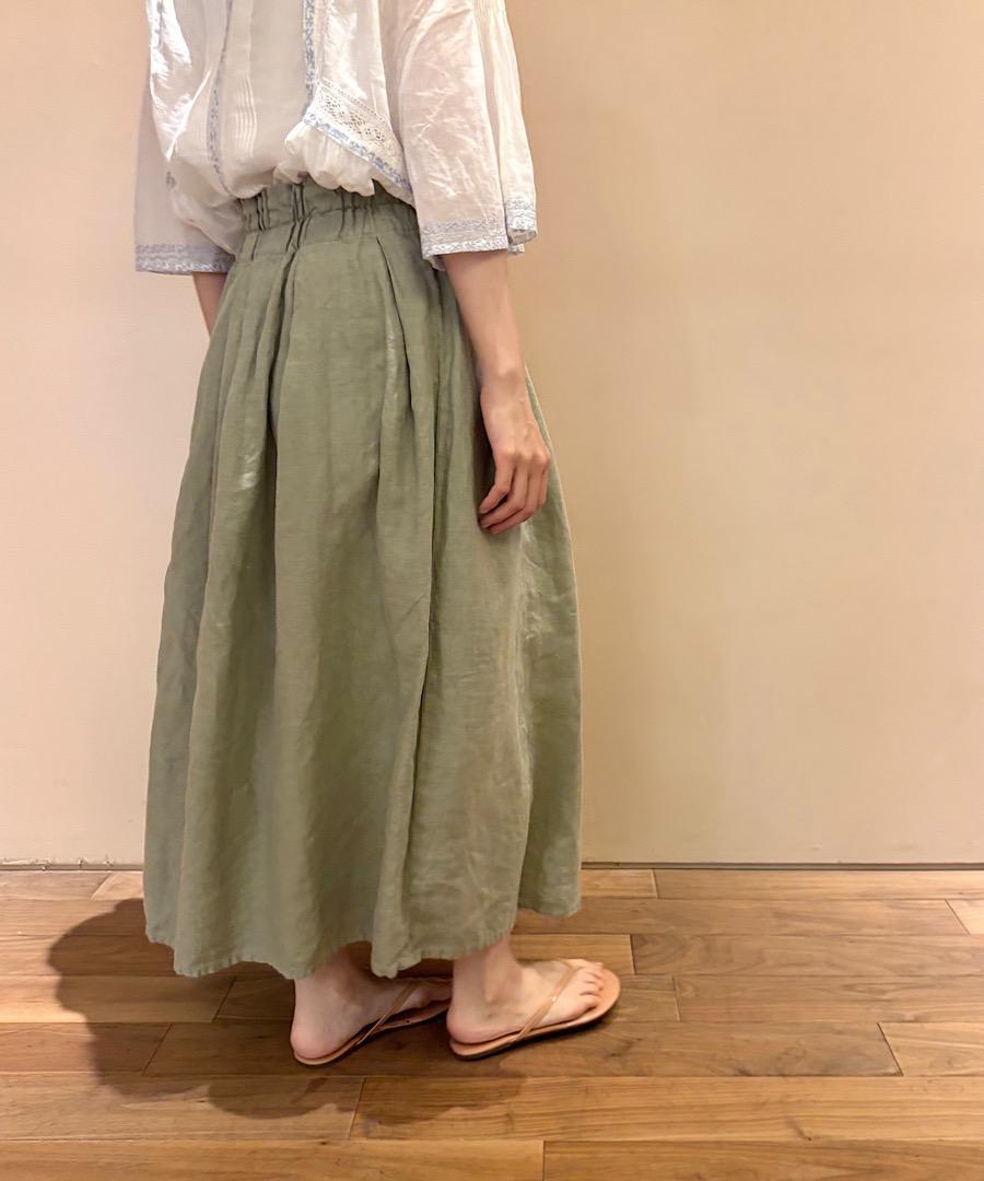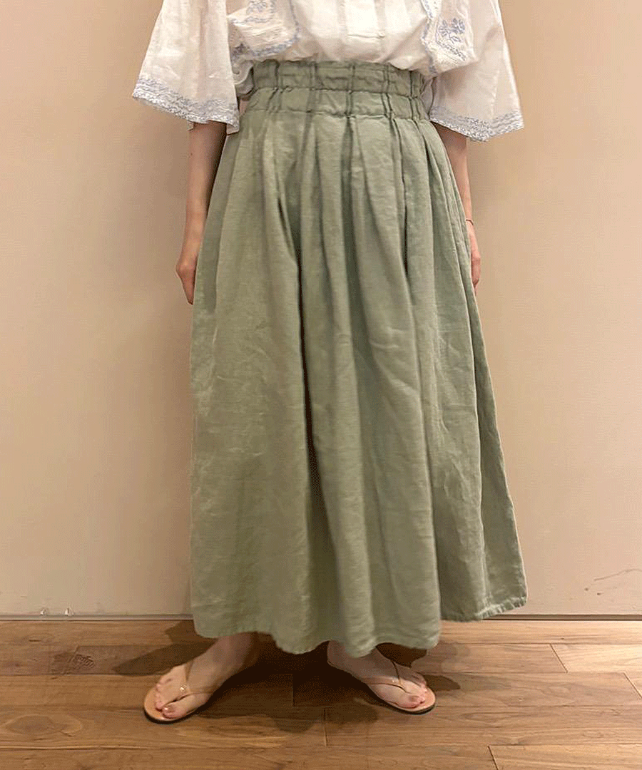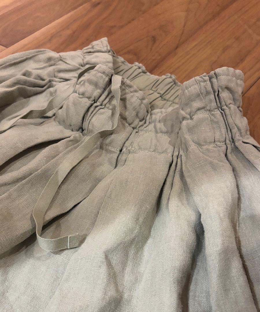 ウエストからタックが入っているので、膨らみが抑えられ、すっきりと着こなせます。