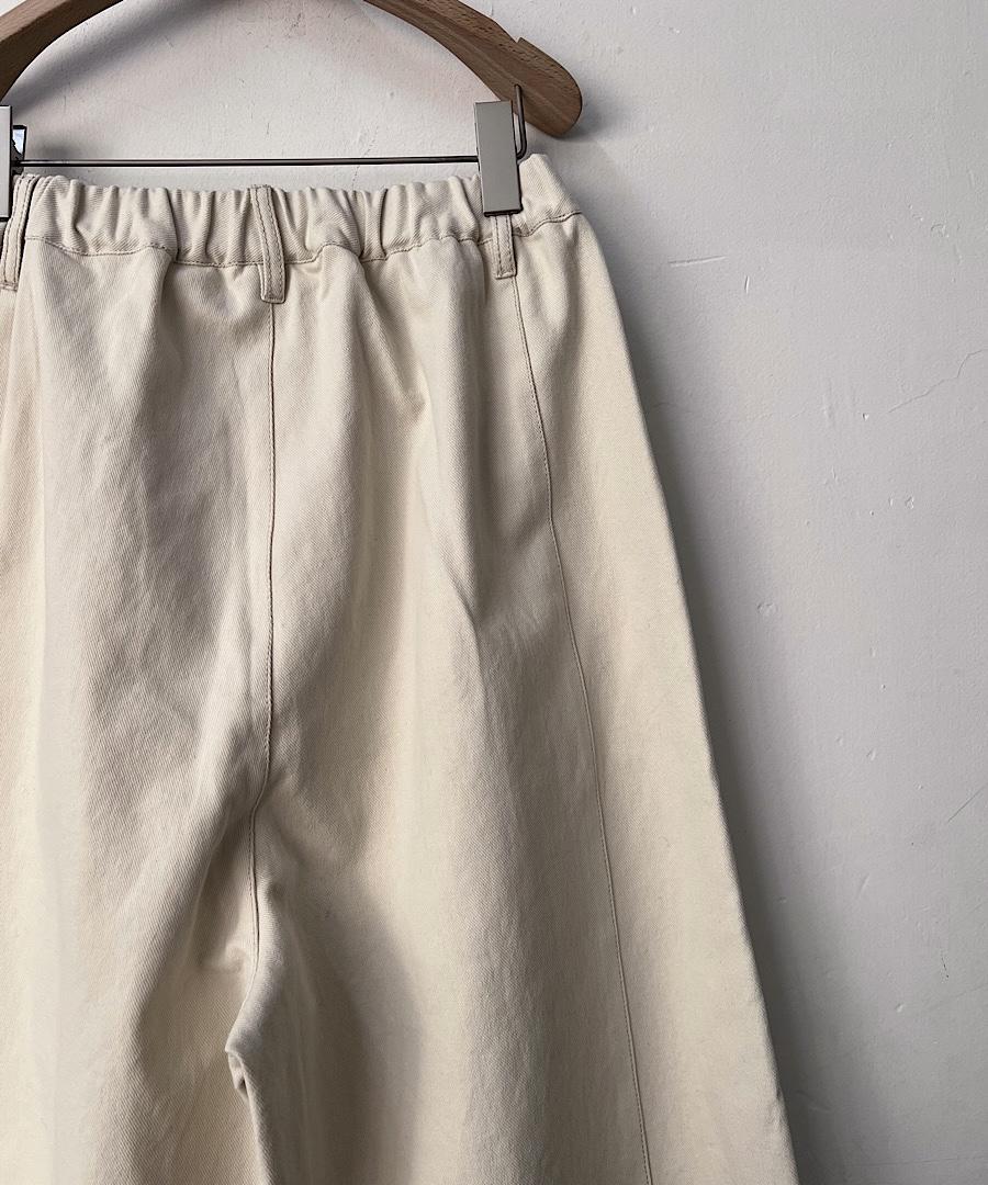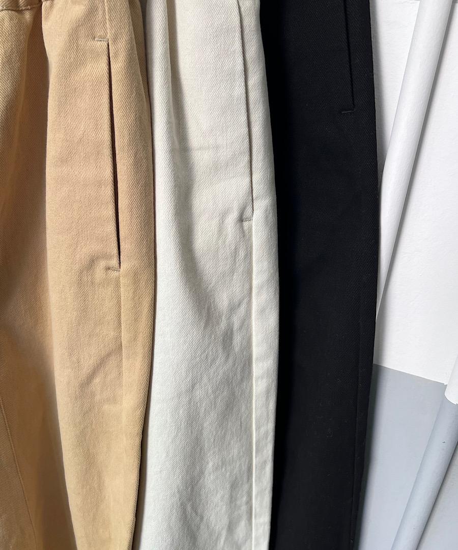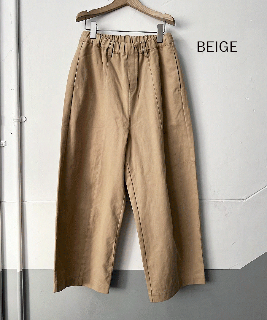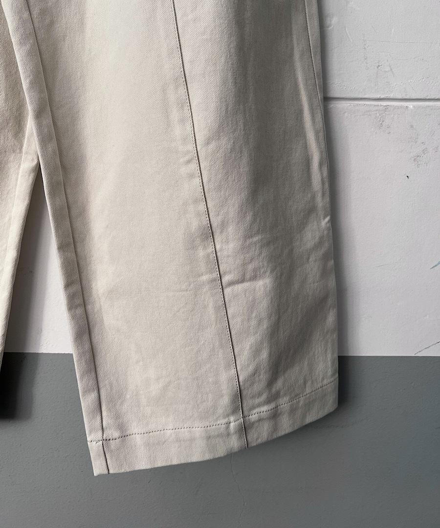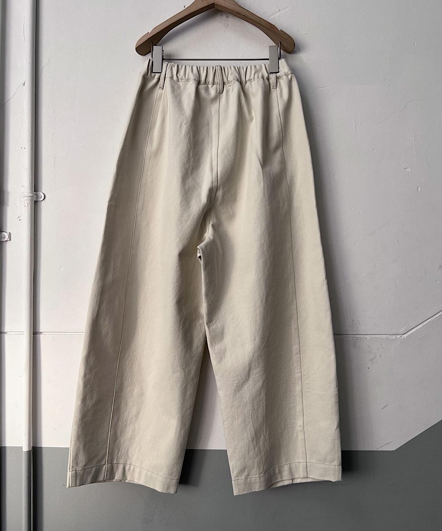 高密度に織り上げたコットンツイル素材で仕立てたカーブパンツ。
