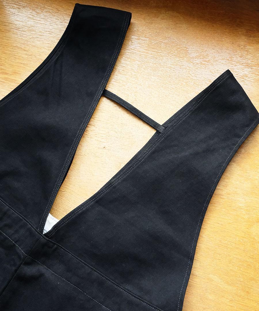 高密度に織り上げたコットンツイル素材で仕立てたサロペット。