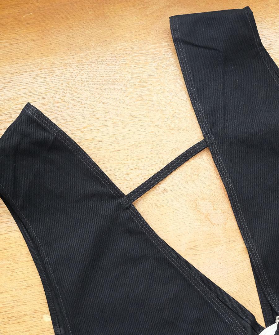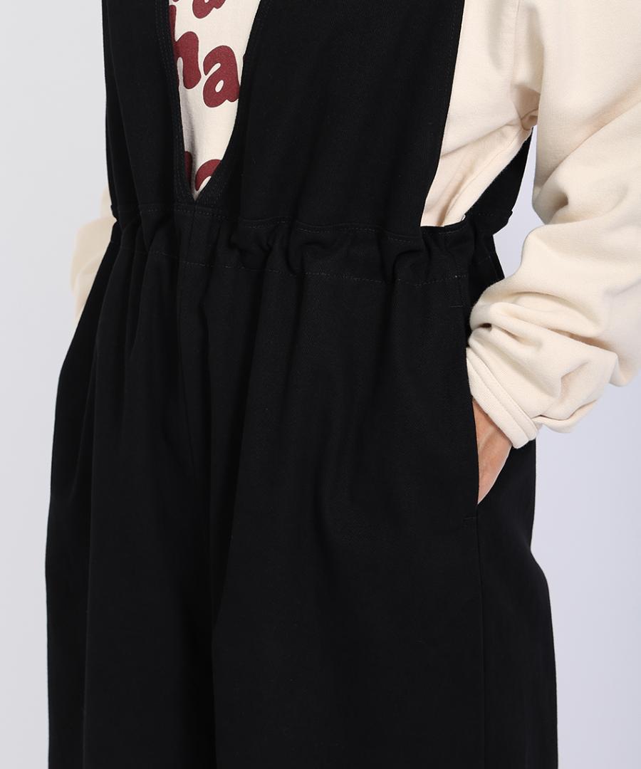 ウエスト部分に紐が通っていて、シルエットを変化して着用できるサロペットです。