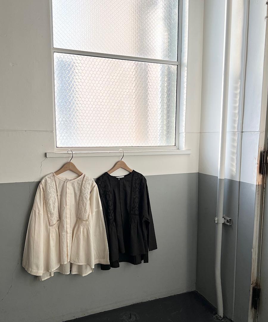 隠しボタンとノーカラーを採用し、甘さをおさえました。
