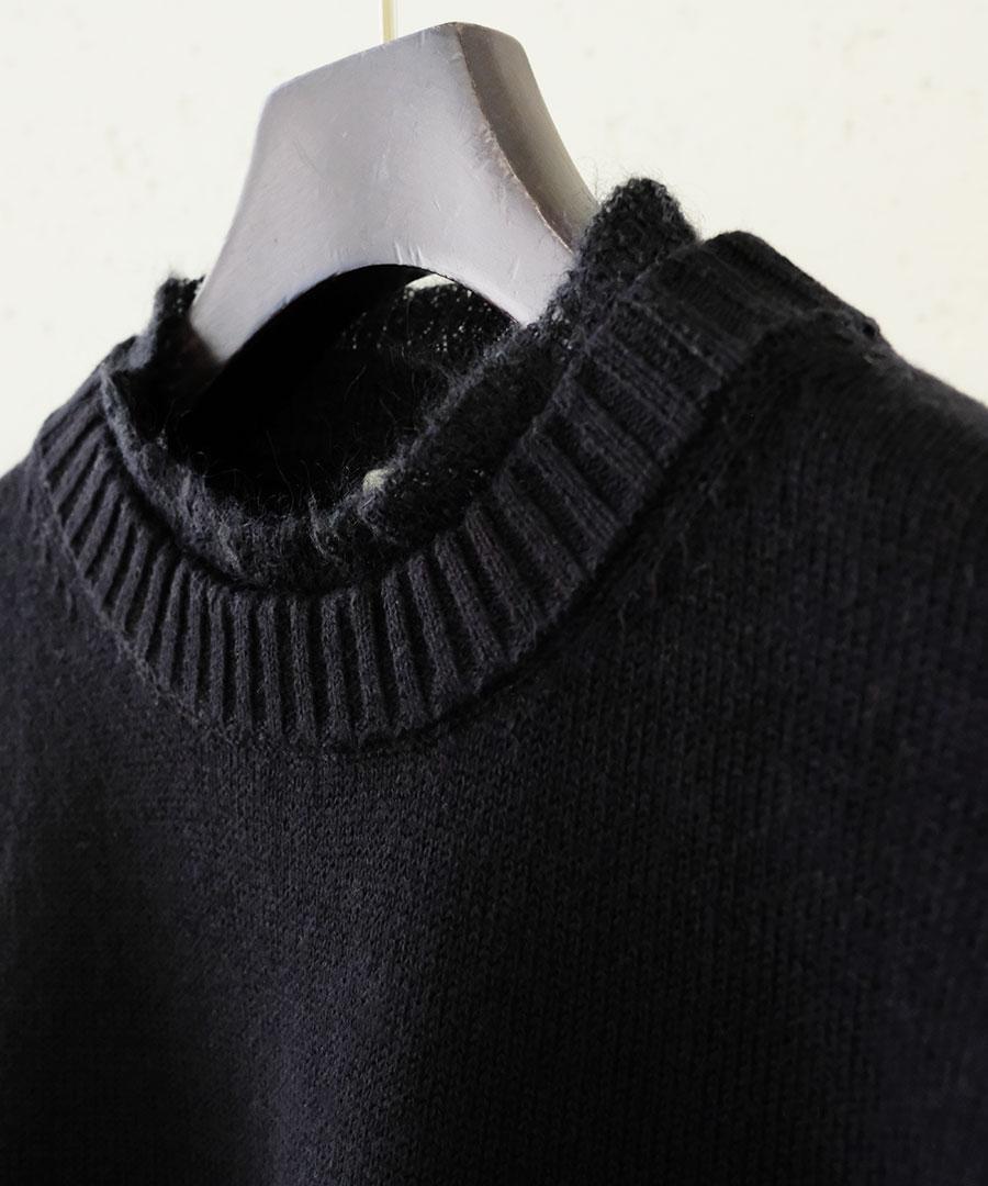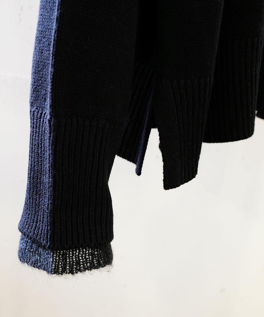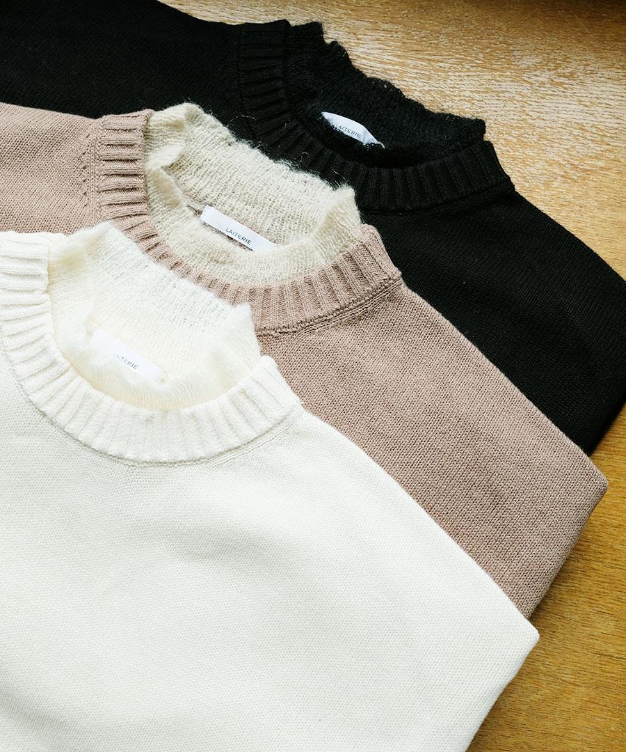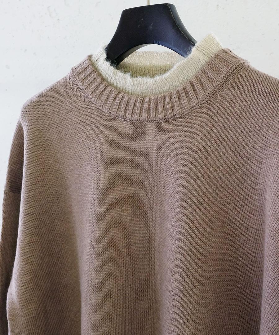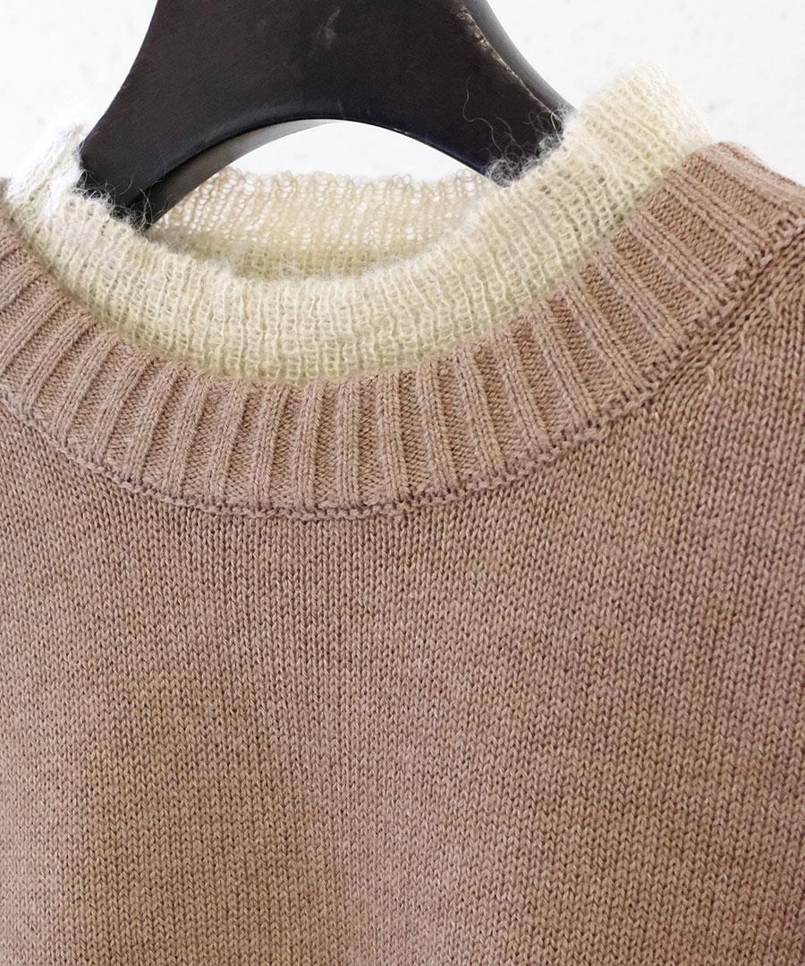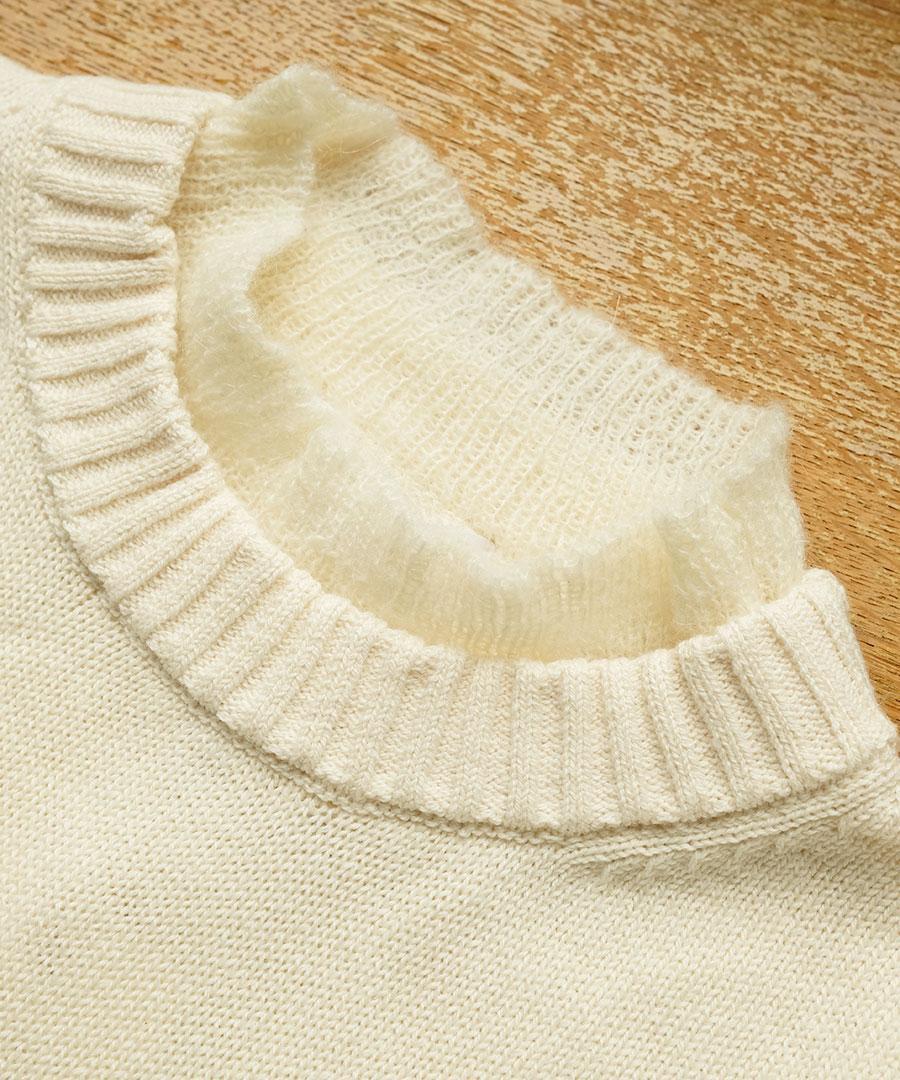 レイヤード風のWネックデザイン、袖口にもモヘアをあしらい、