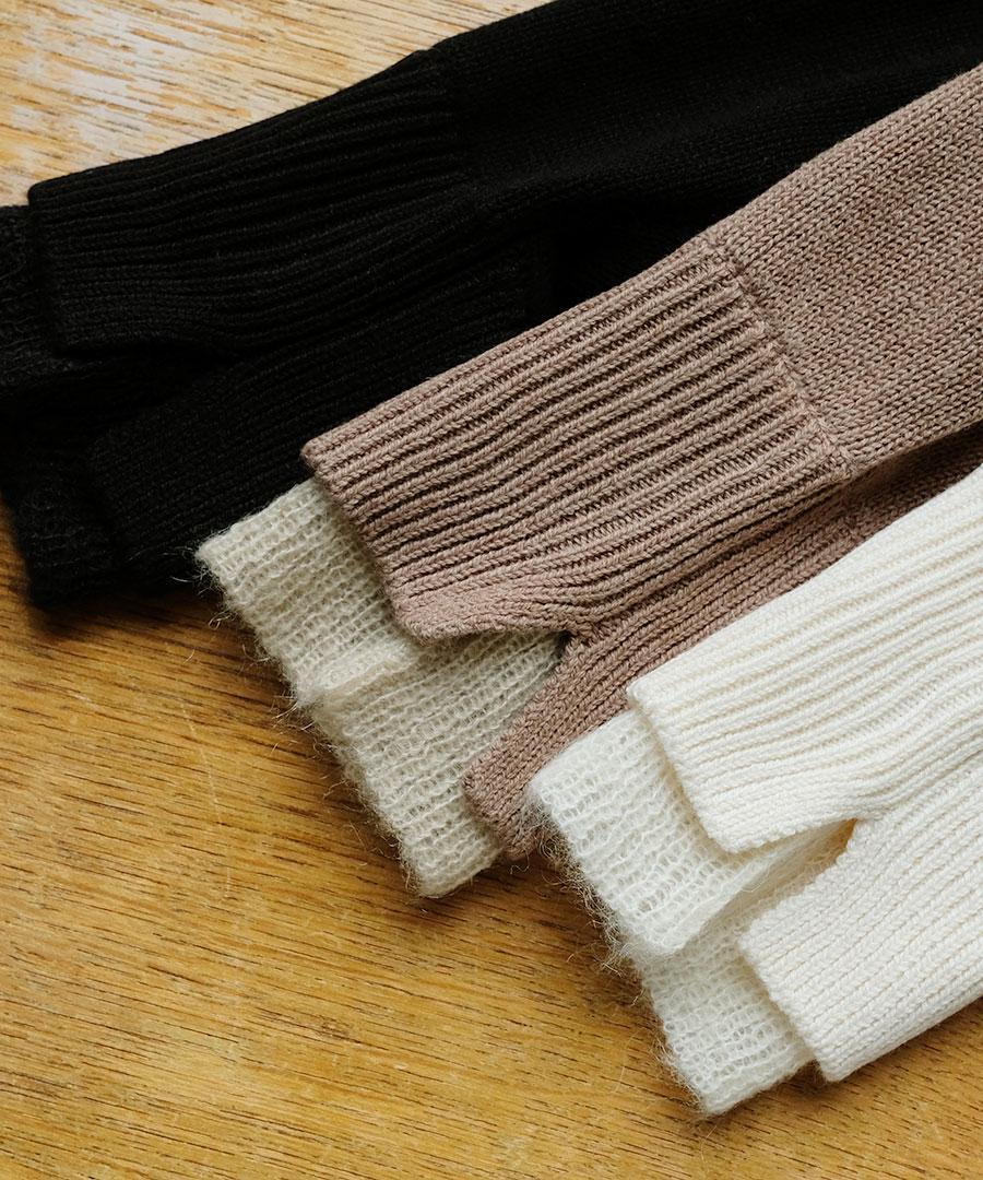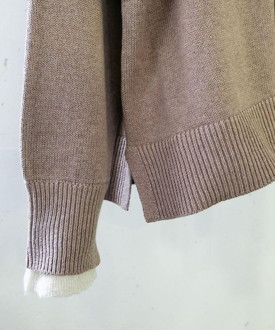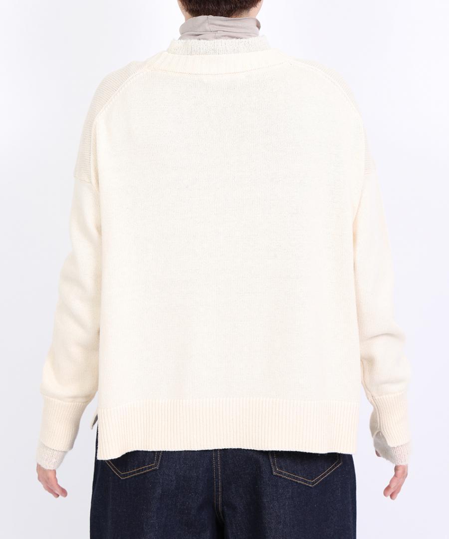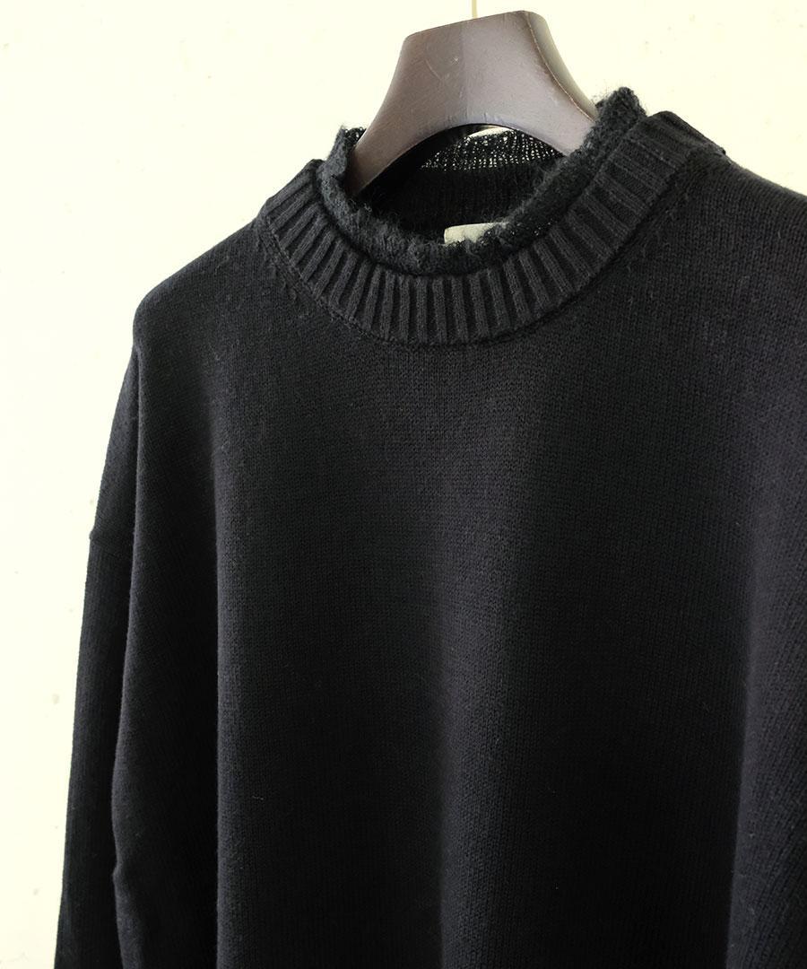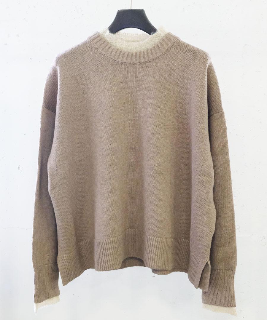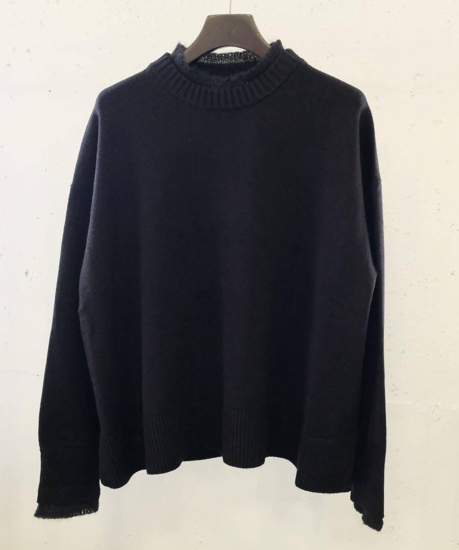レイヤード風のWネックデザイン、袖口にもモヘアをあしらい、