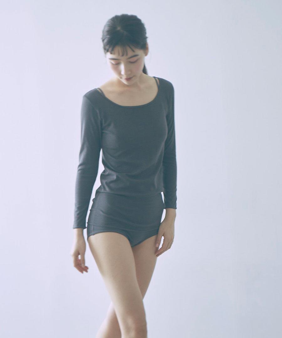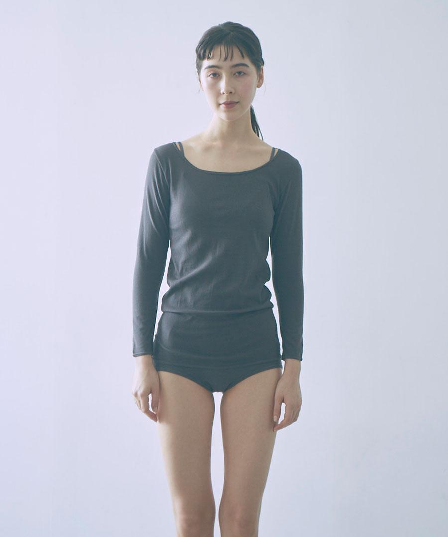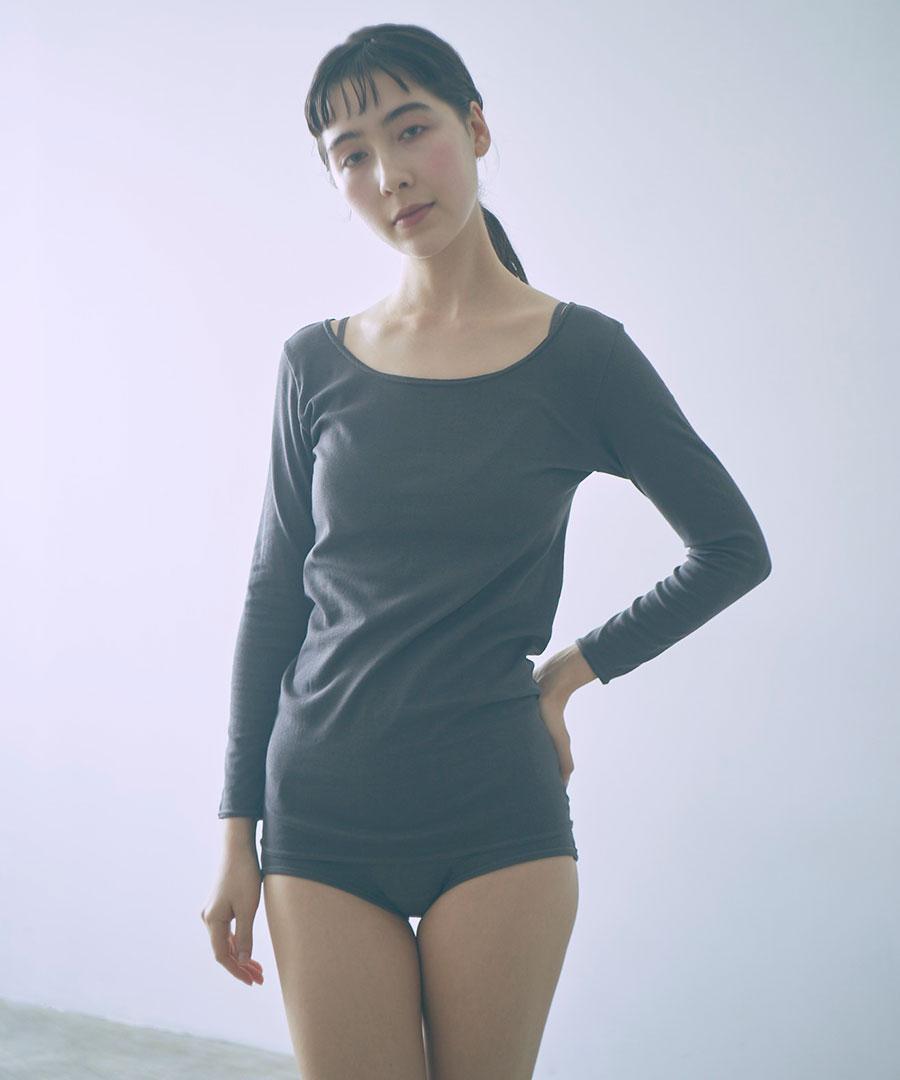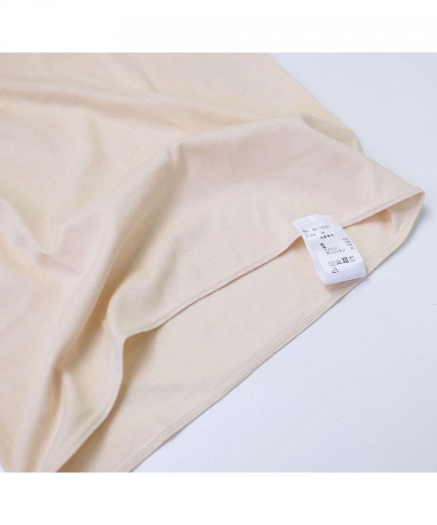 <me.のインナーウェア> コットンシルクシリーズは、繊維長の長いスーピマコットンとシルクを混紡した糸から編まれた布地を採用しました。 伸びが良く、優しいストレッチ感がある2層構造の生地は、表地に伸縮性のある糸、肌側にコットンシルクの糸の編地があたる仕様で、肌触り良く着用いただけます。