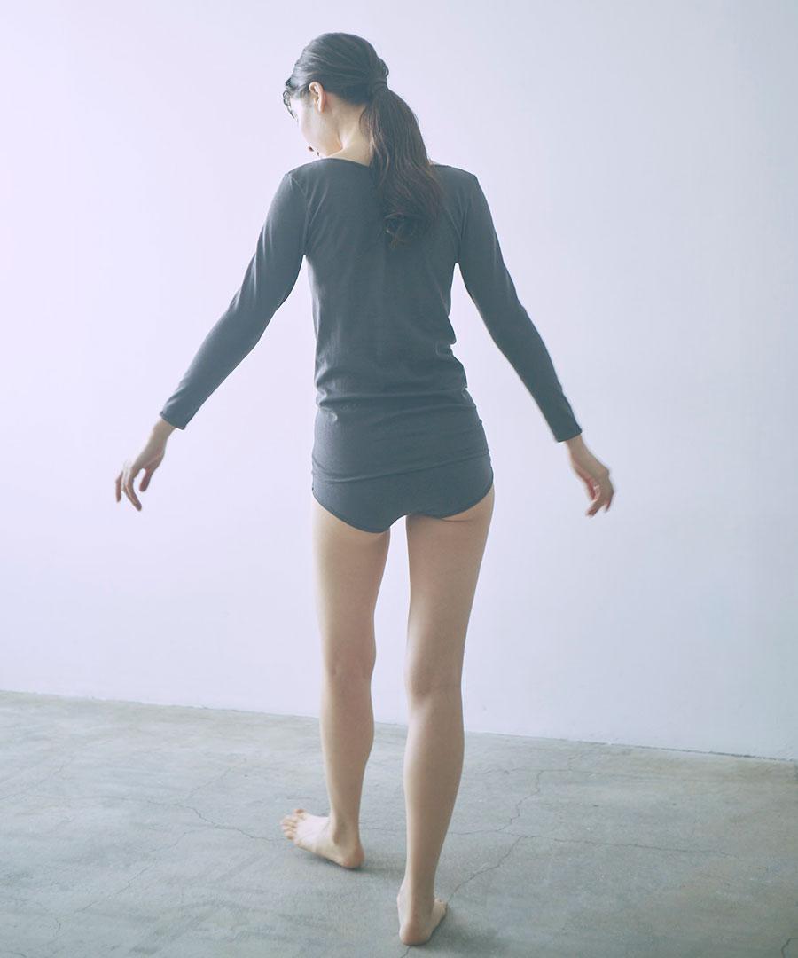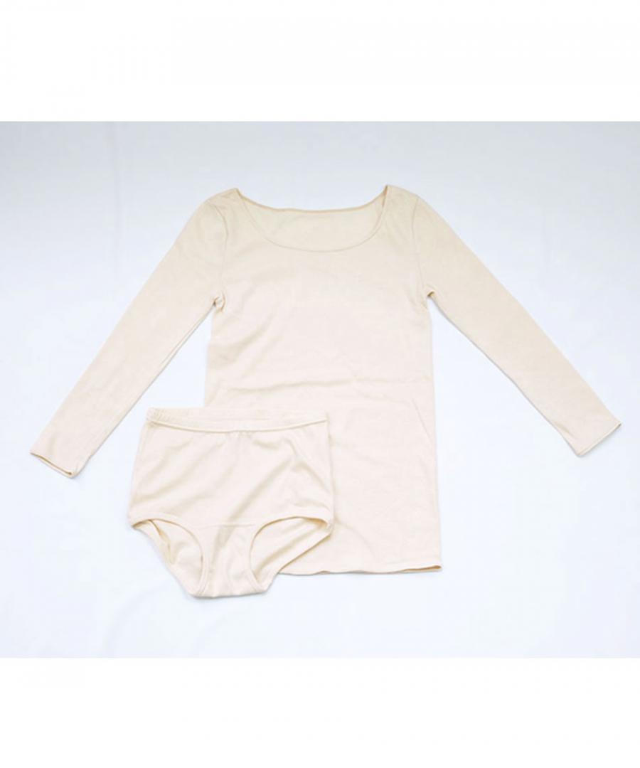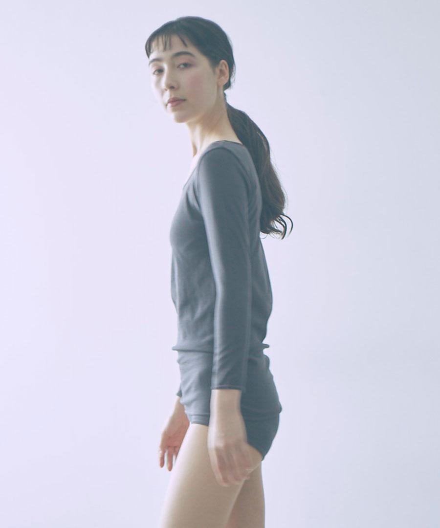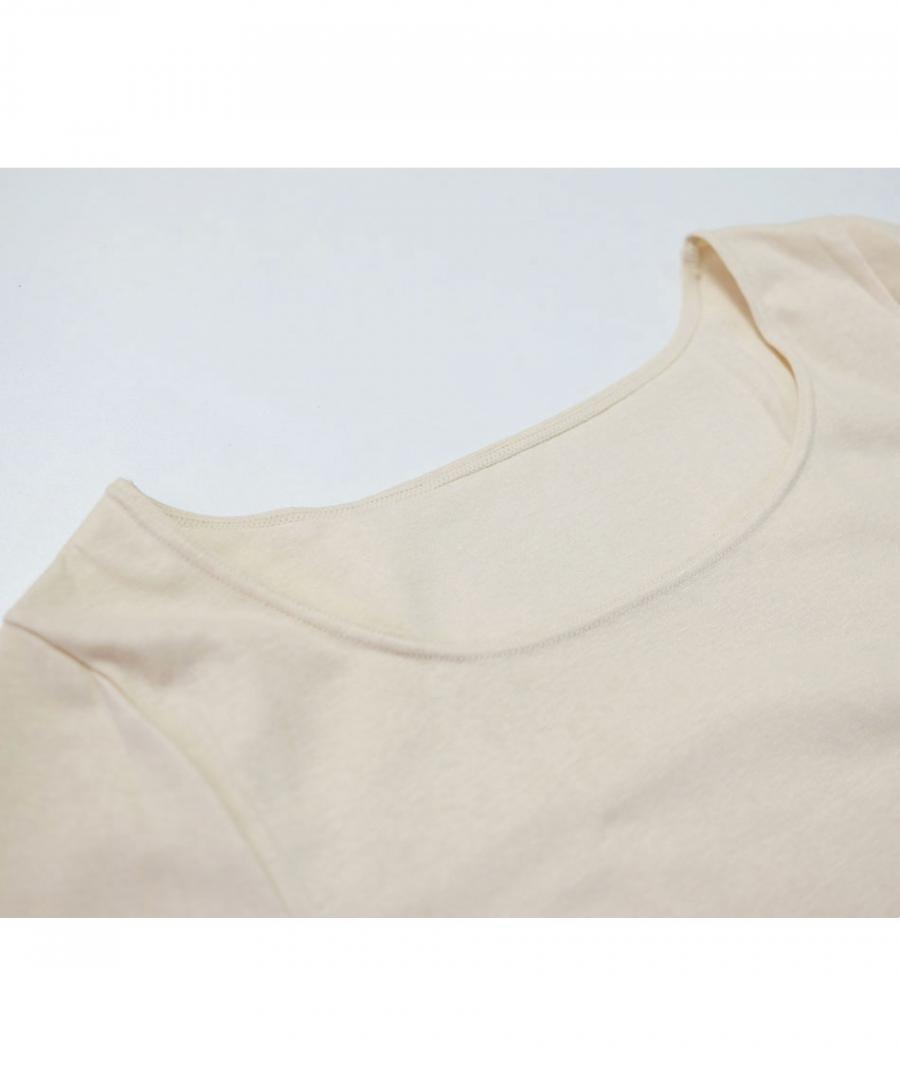 <me.のインナーウェア> コットンシルクシリーズは、繊維長の長いスーピマコットンとシルクを混紡した糸から編まれた布地を採用しました。 伸びが良く、優しいストレッチ感がある2層構造の生地は、表地に伸縮性のある糸、肌側にコットンシルクの糸の編地があたる仕様で、肌触り良く着用いただけます。