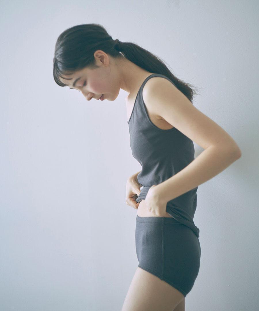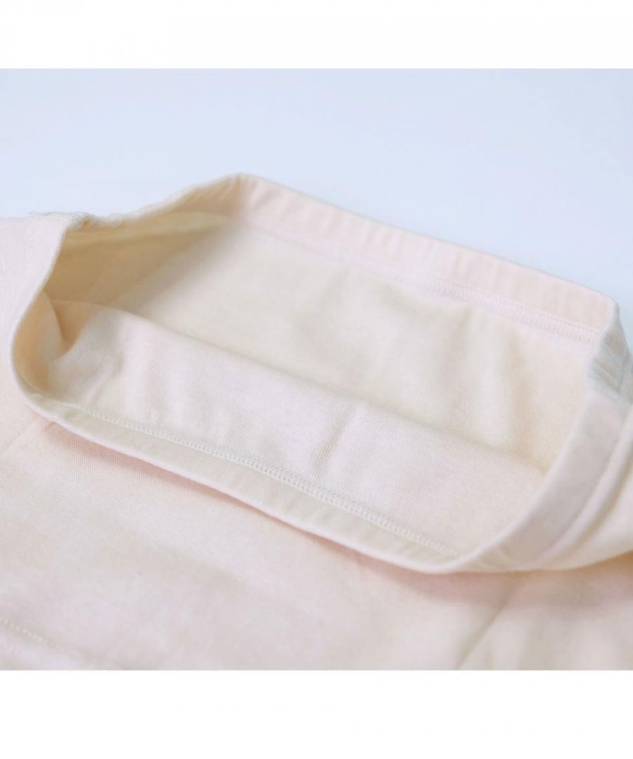 <me.のインナーウェア> コットンシルクシリーズは、繊維長の長いスーピマコットンとシルクを混紡した糸から編まれた布地を採用しました。 伸びが良く、優しいストレッチ感がある2層構造の生地は、表地に伸縮性のある糸、肌側にコットンシルクの糸の編地があたる仕様で、肌触り良く着用いただけます。