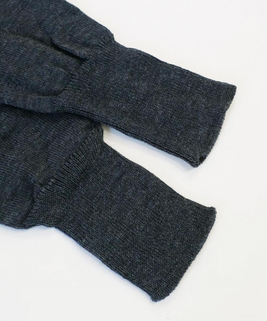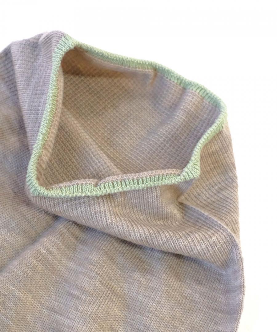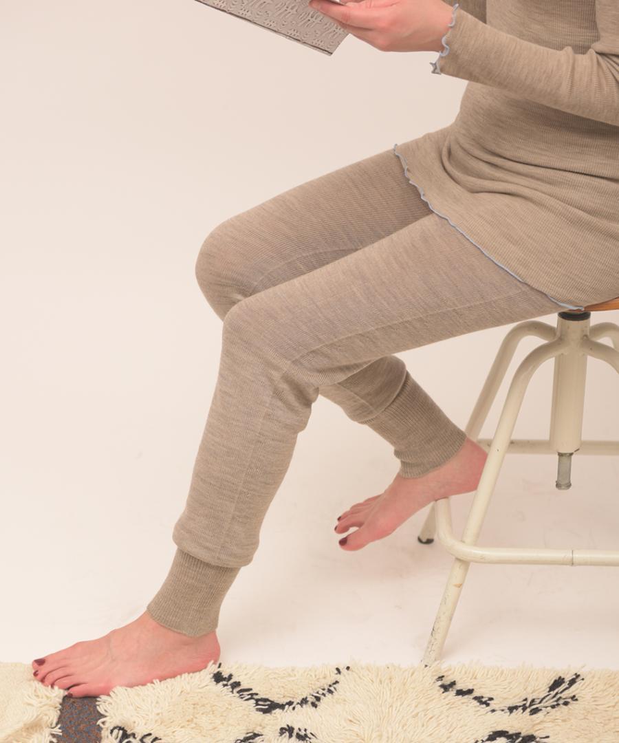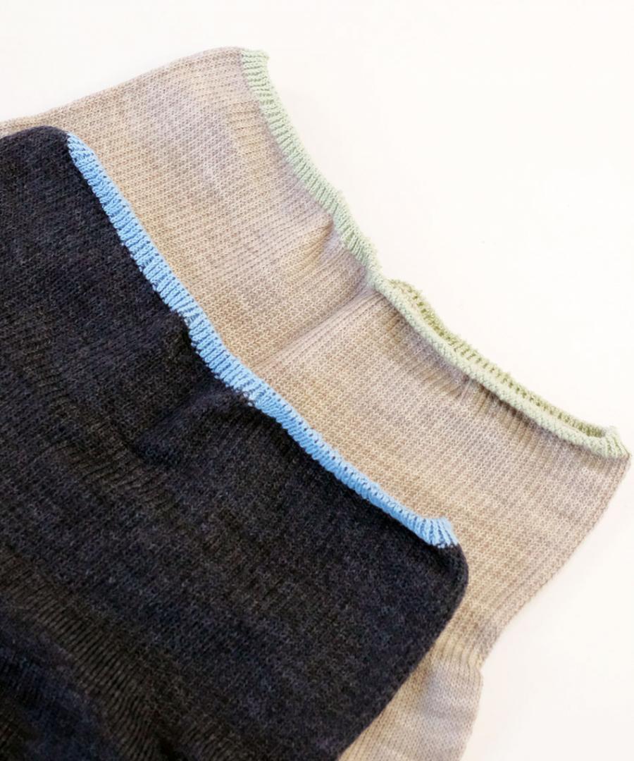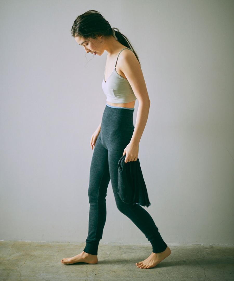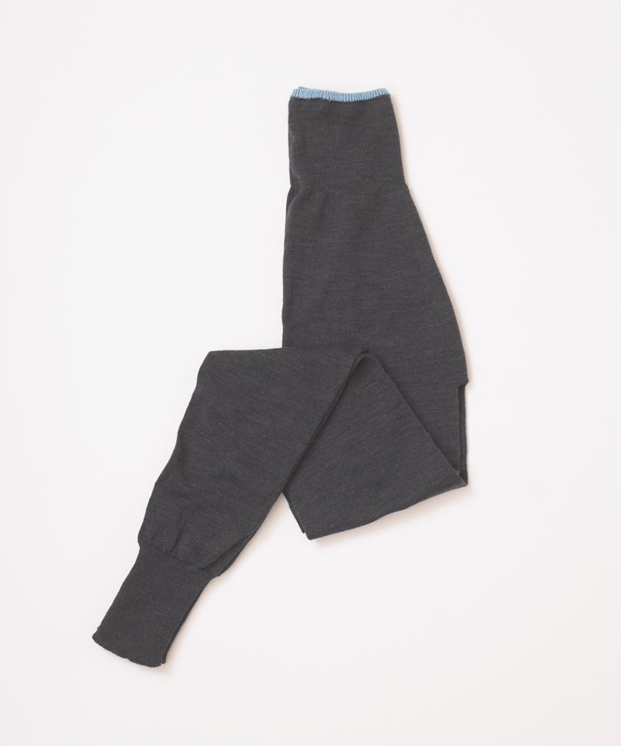トップスより少し太目の19.5マイクロンのメリノウールをホールガーメント機でひと続きに編み上げました。ウェスト丈を長めにして腹巻のようにお腹を包んでくれるパンツです。