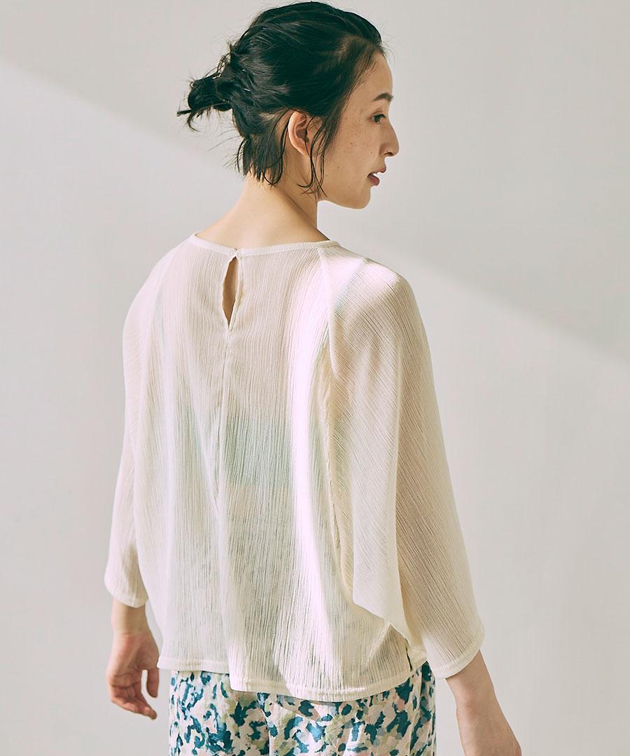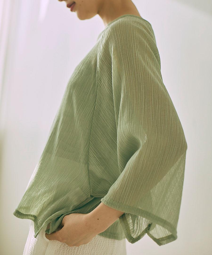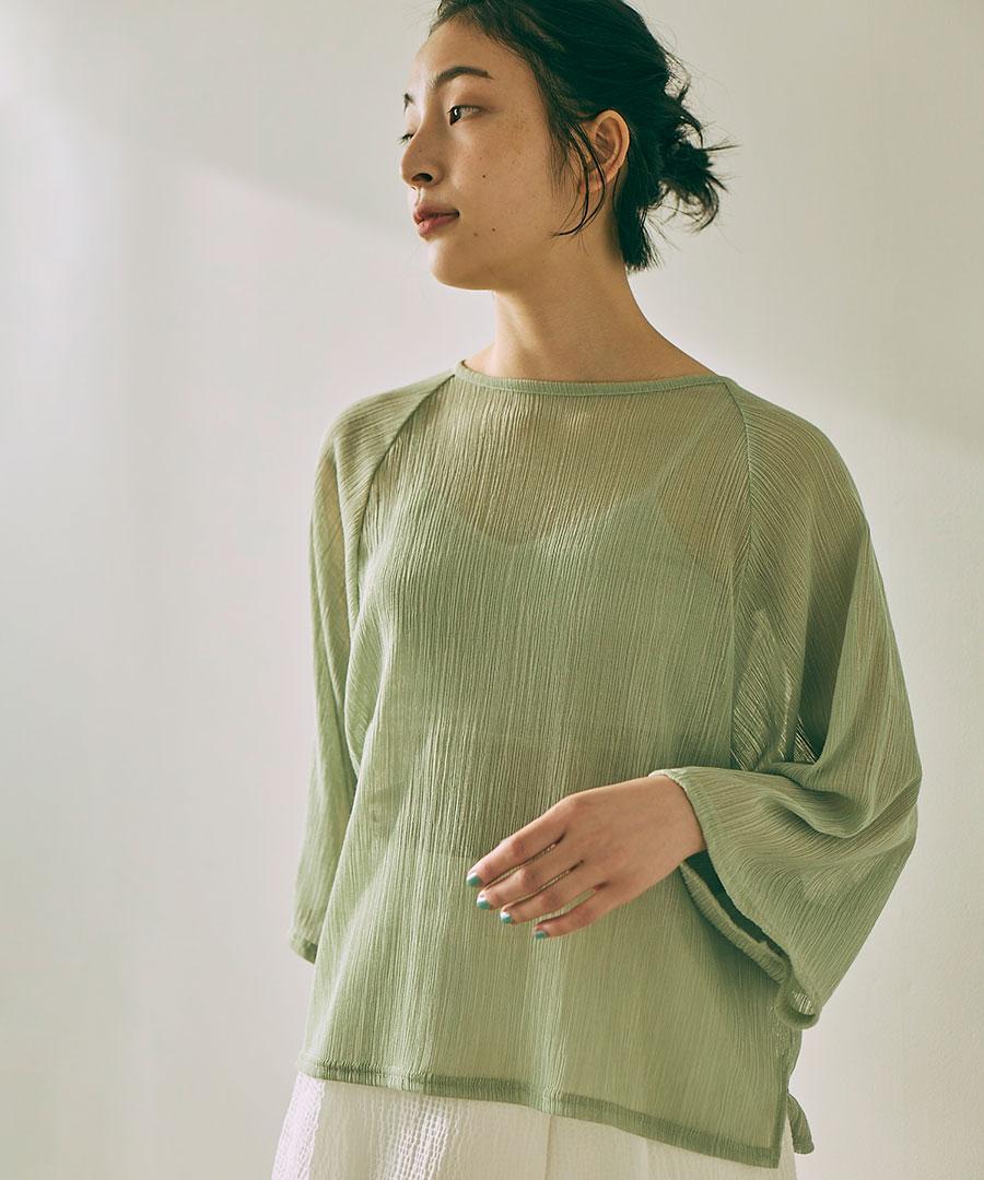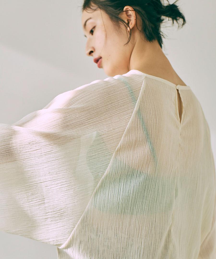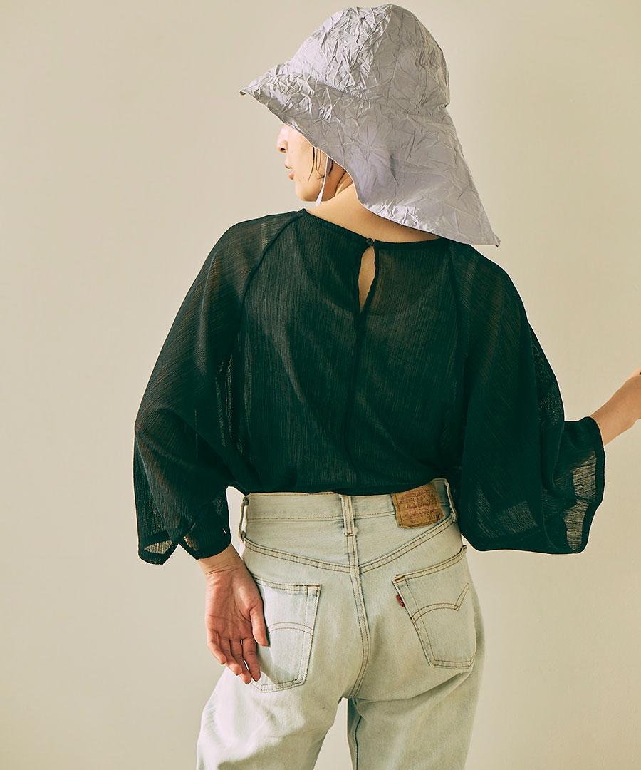 ワイドなラグランスリーブに、透け感をプラスすることで女性らしく。