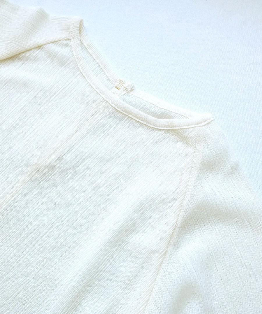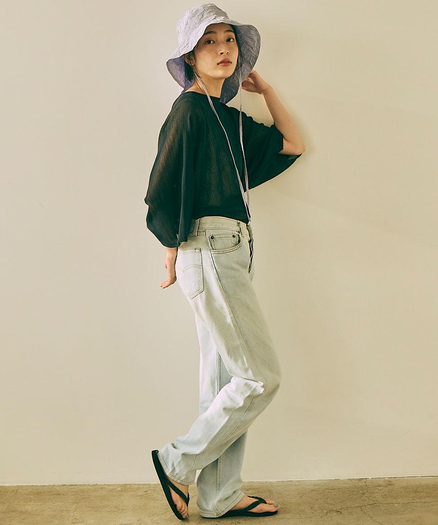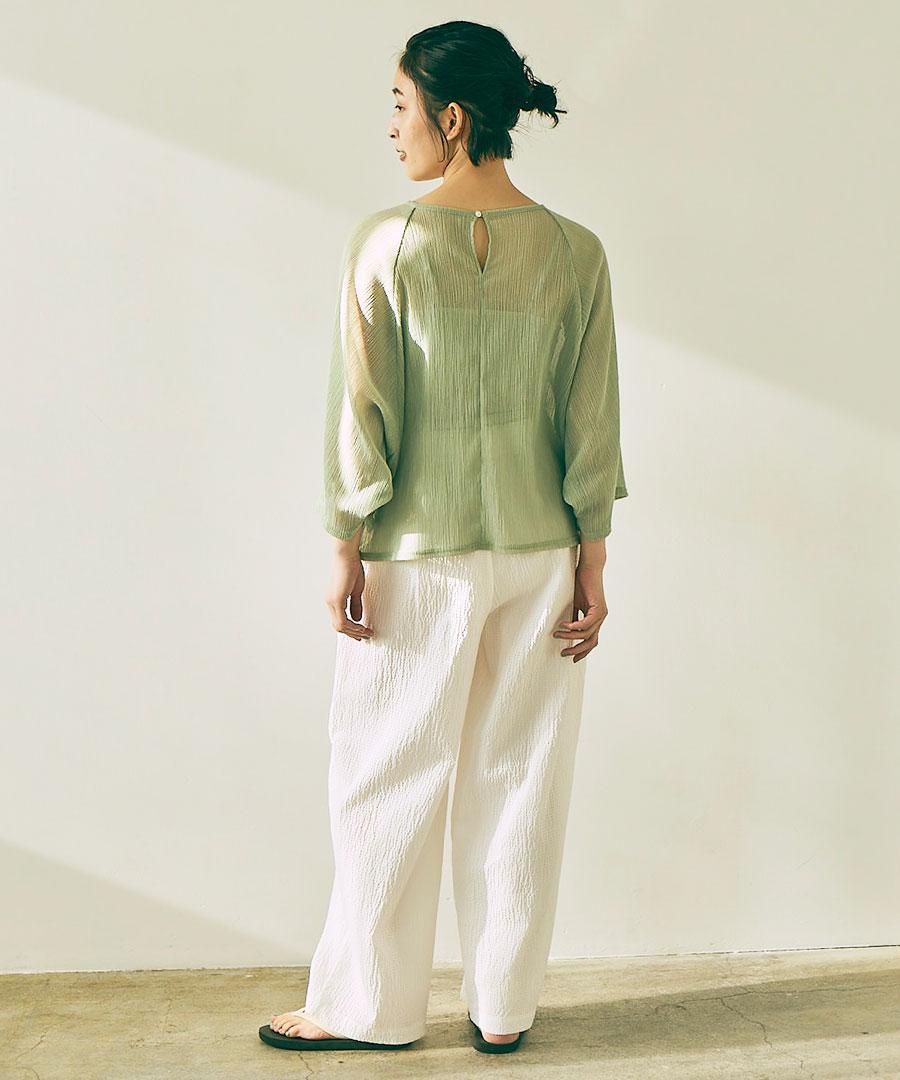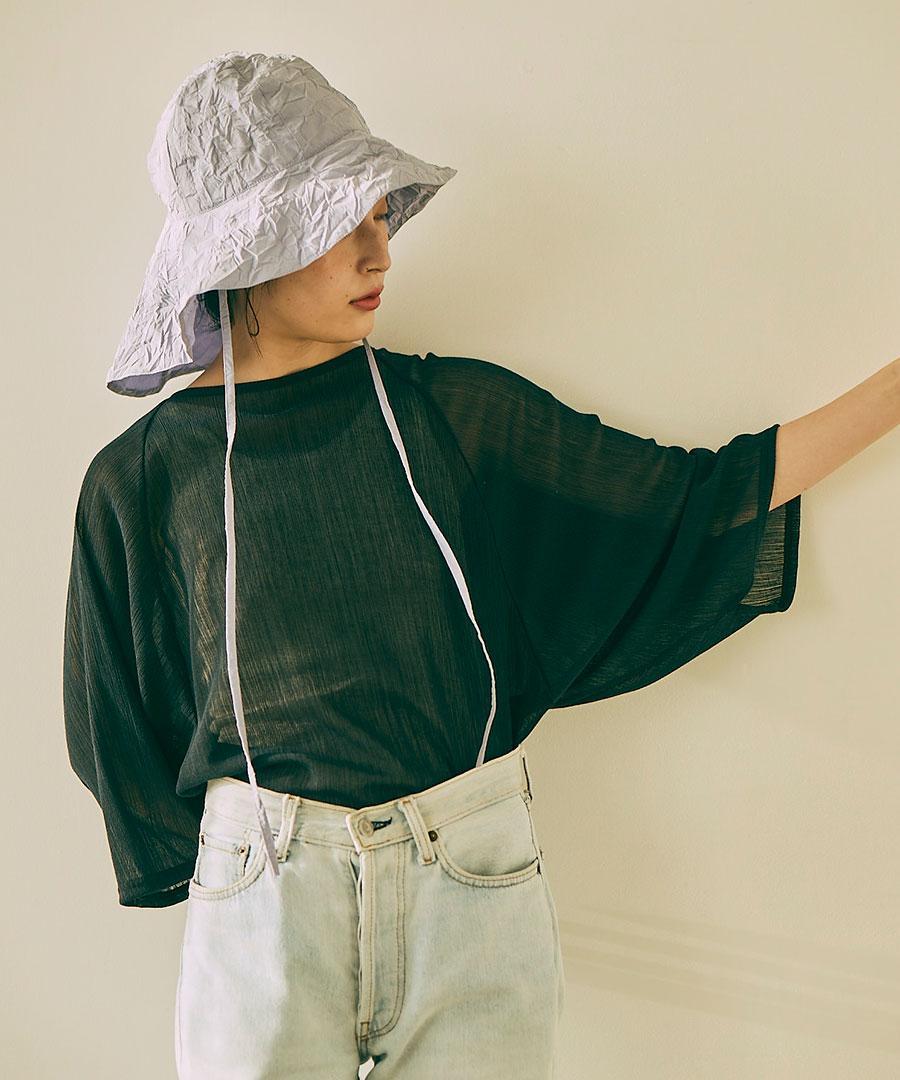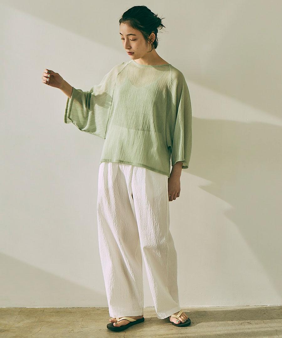 ワイドなラグランスリーブに、透け感をプラスすることで女性らしく。