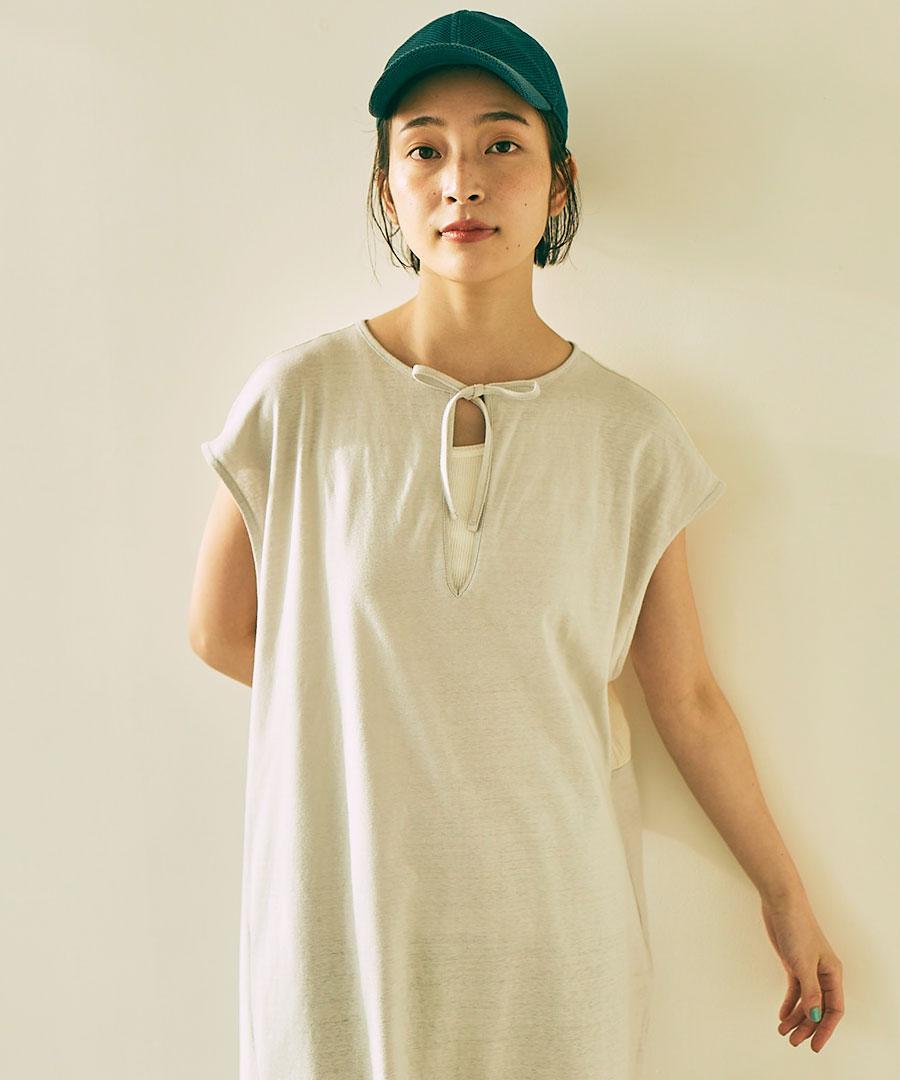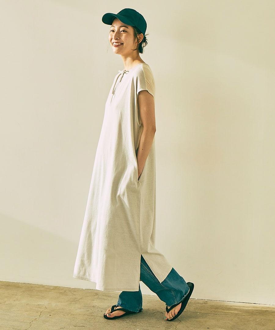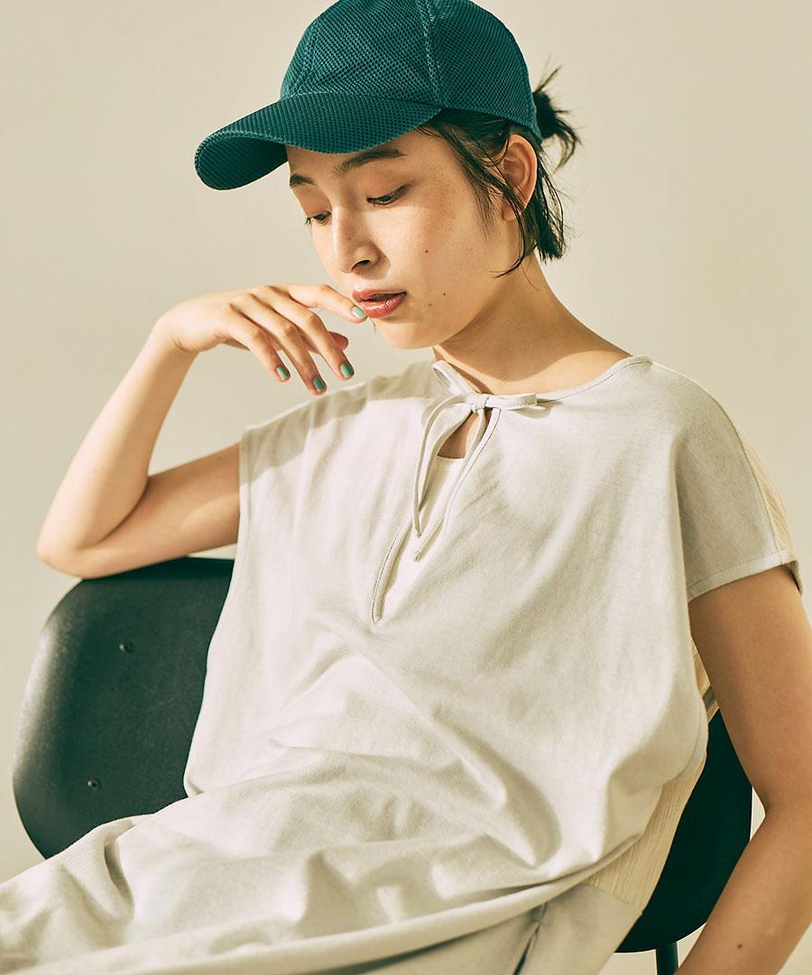 着画ではivory(キャップとデニムを合わせたスタイリング)に、コットンテレコタンクトップ sageにコットンテレコインナー キャミソール