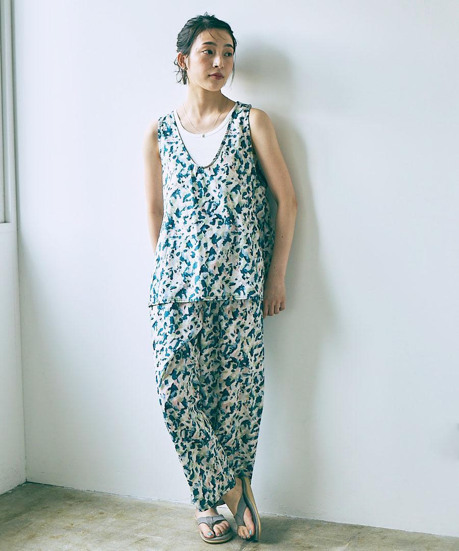 細番手のコットンローンに、印象派の描いた庭のようなプリントをのせた3型。