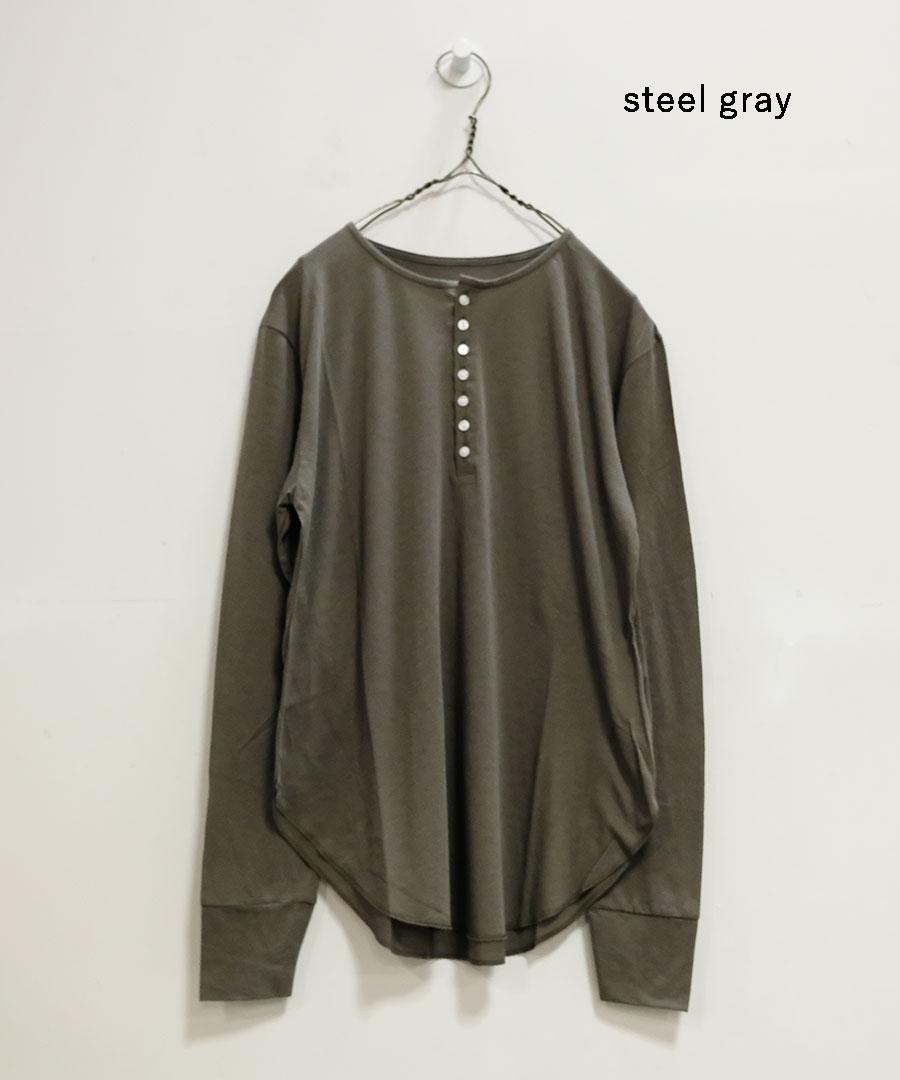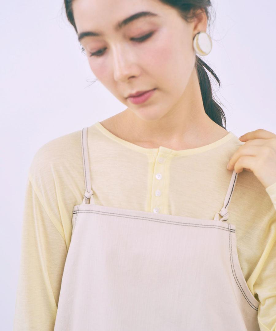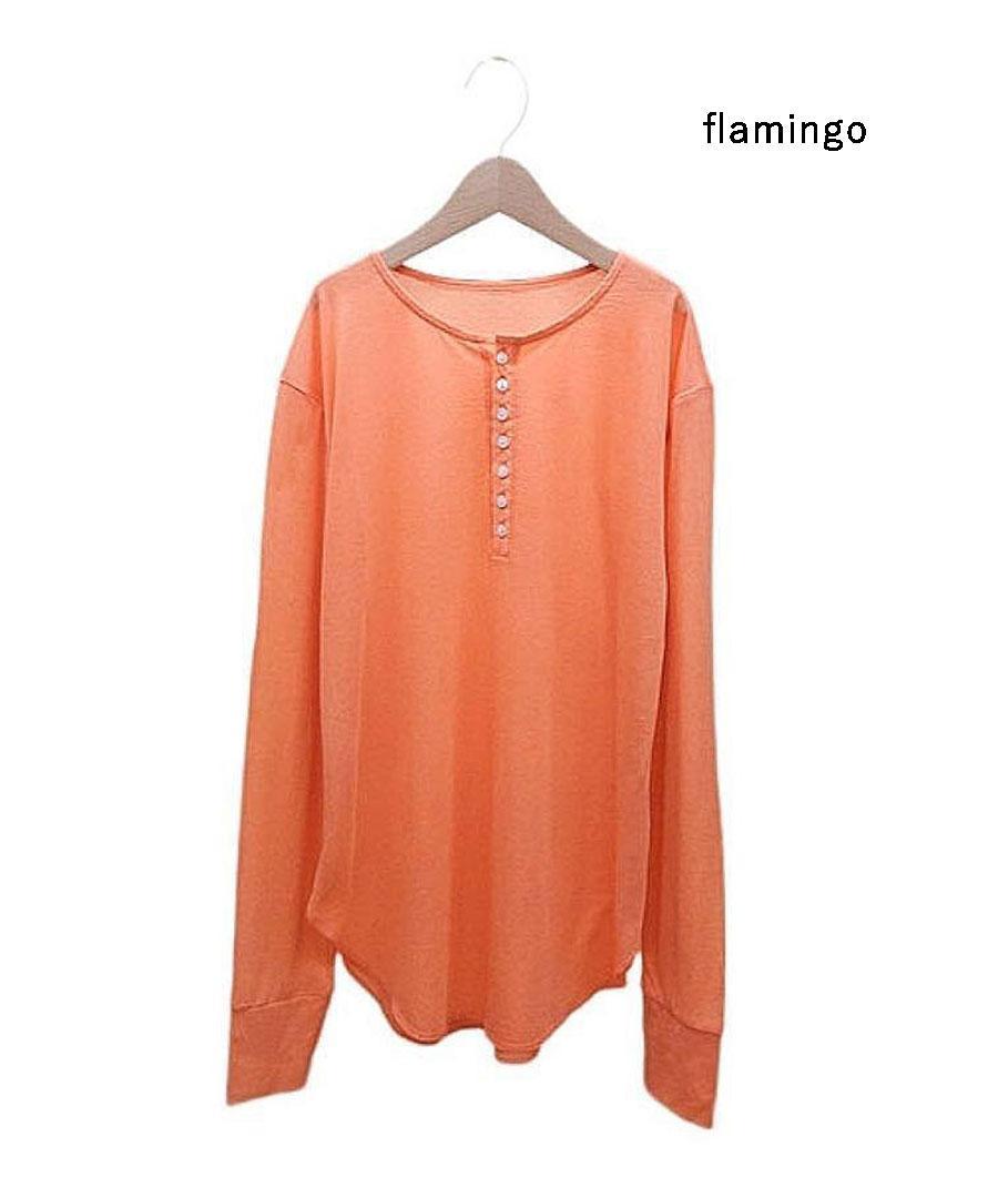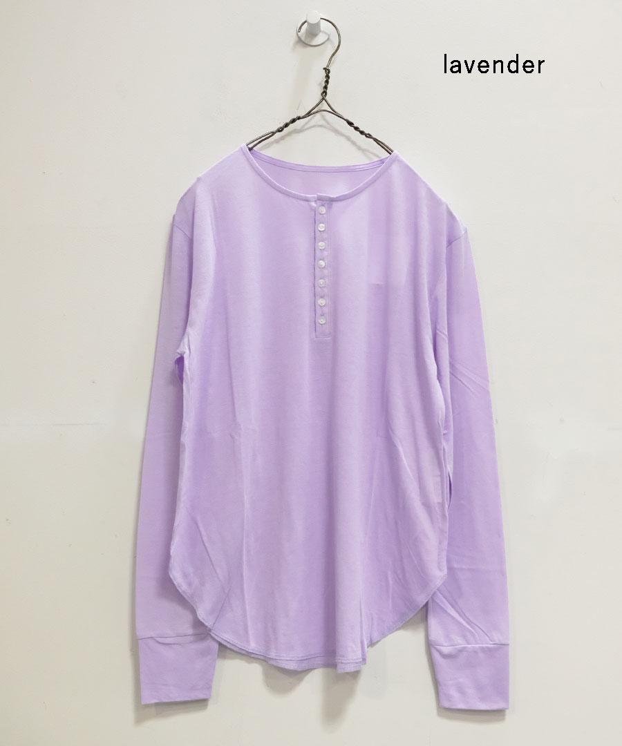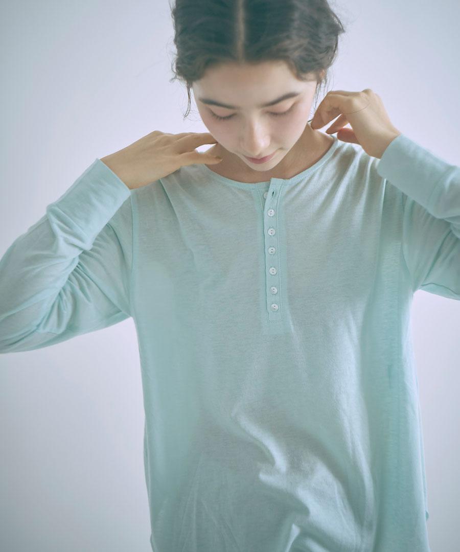 フロントに並んだ小さなボタンが可愛いヘンリーネックTです。