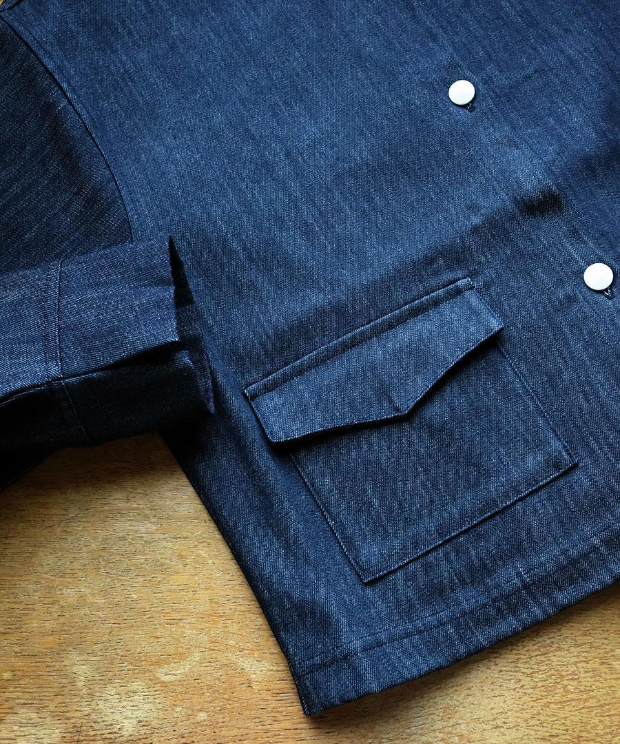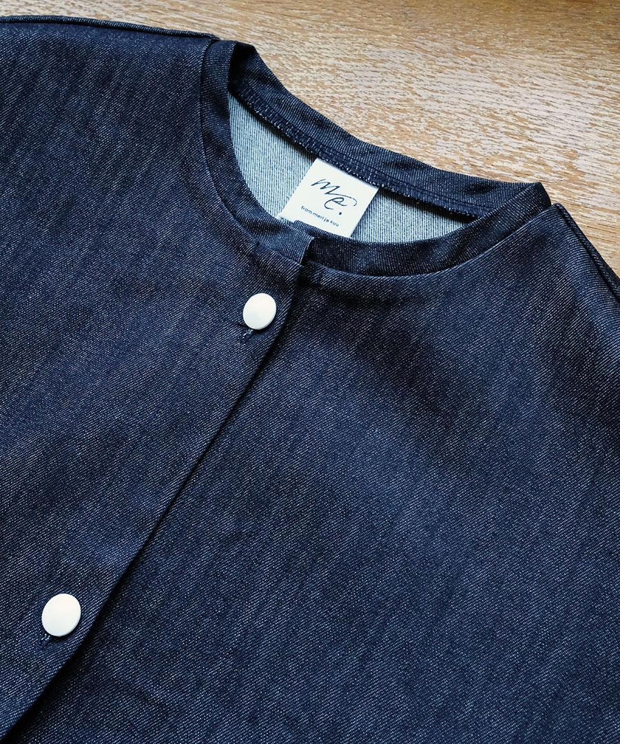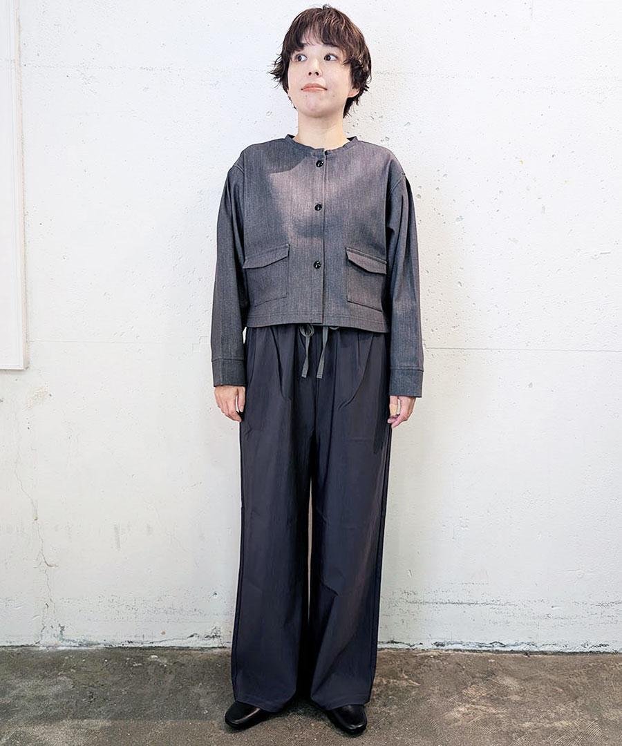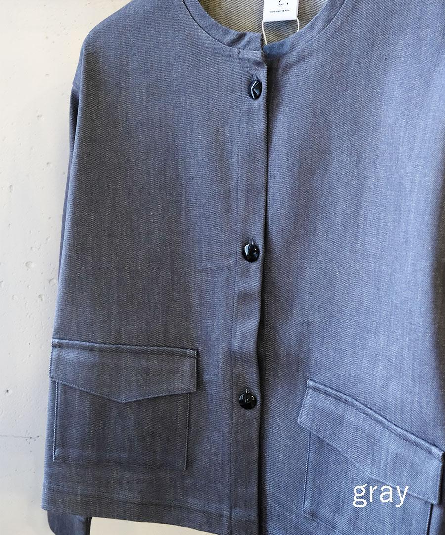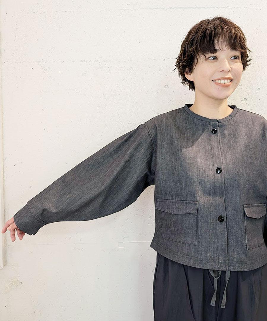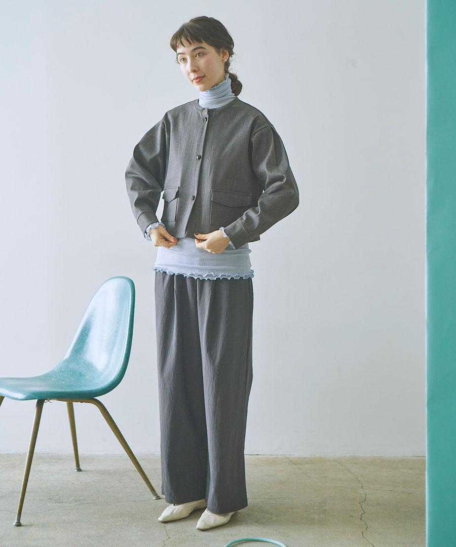 こちらはノーカラーでインナーに着るものを選ばないジャケットです。