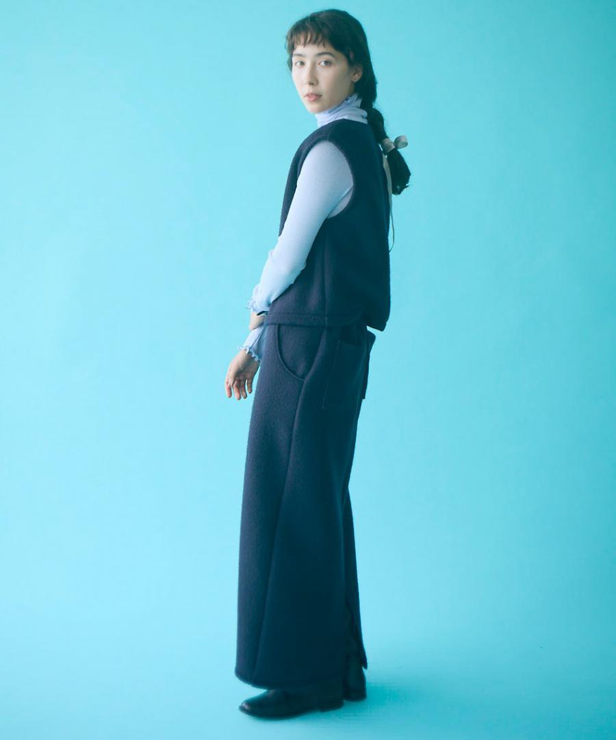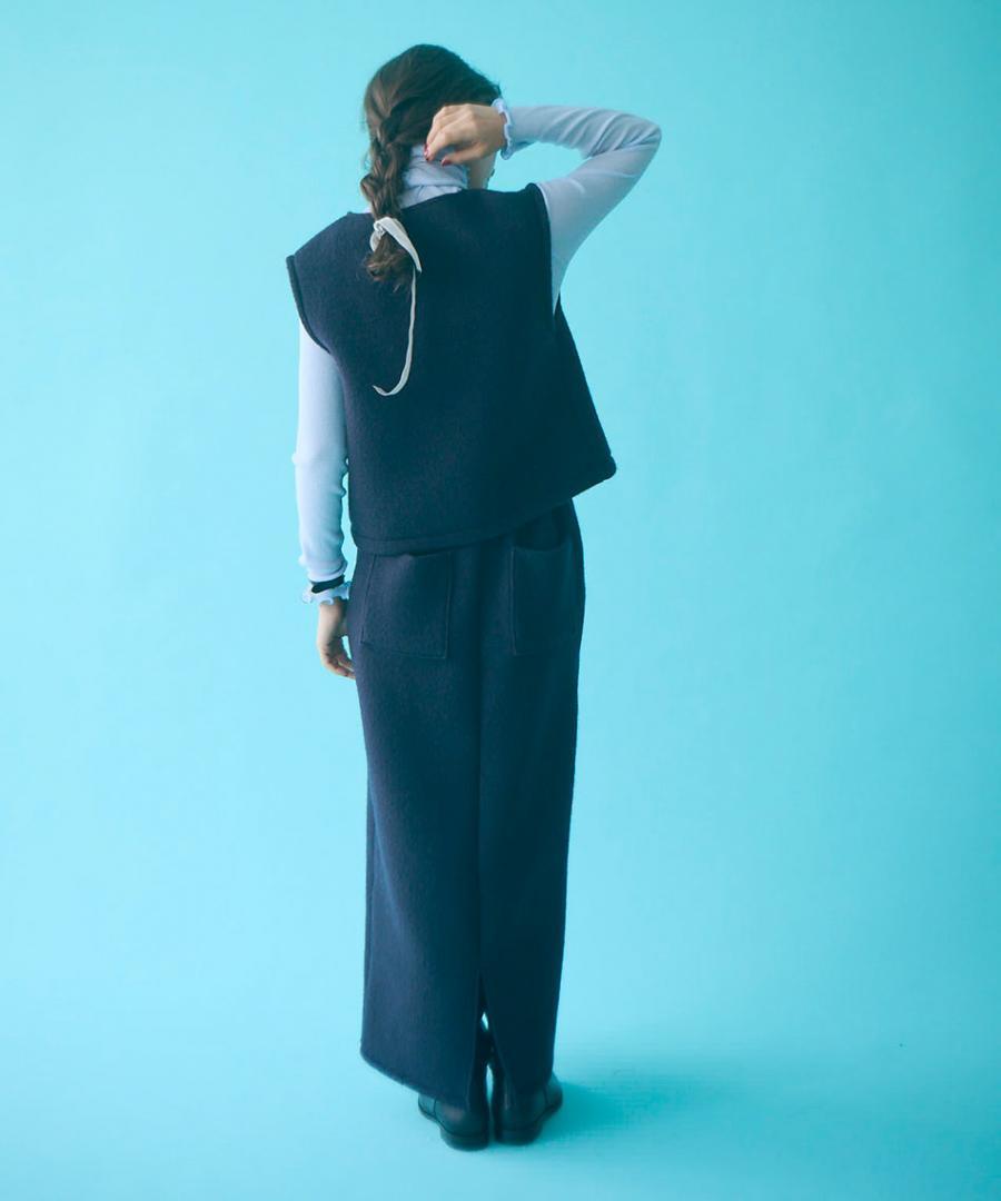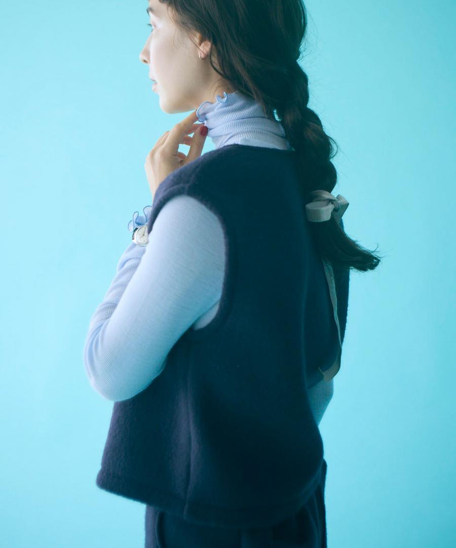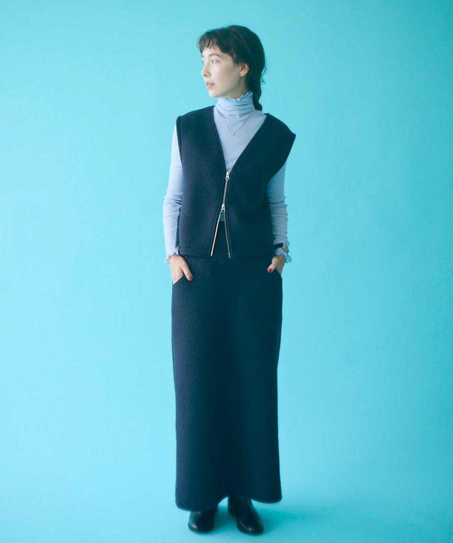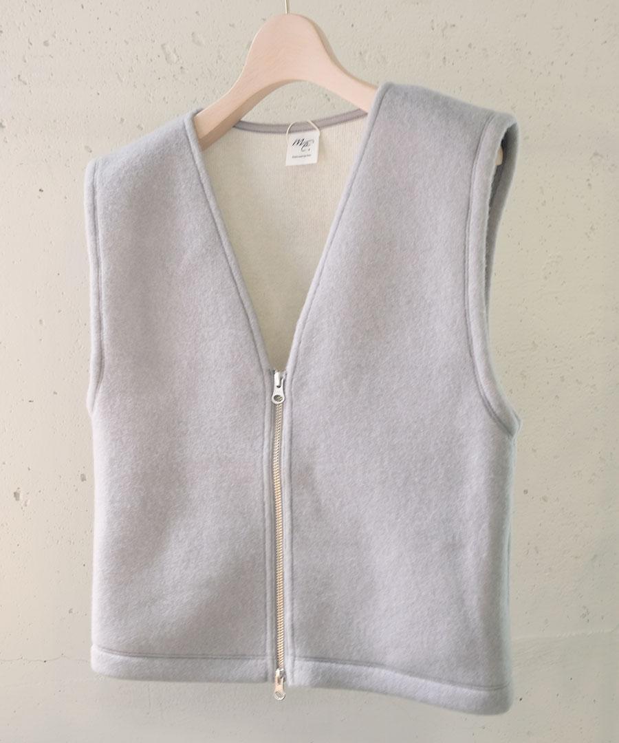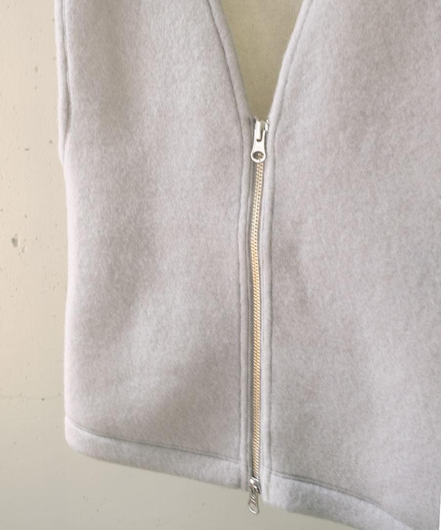 シンプルなVネックのベストはWジップのファスナー付きです。