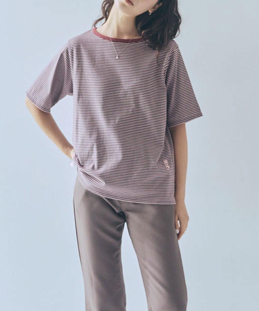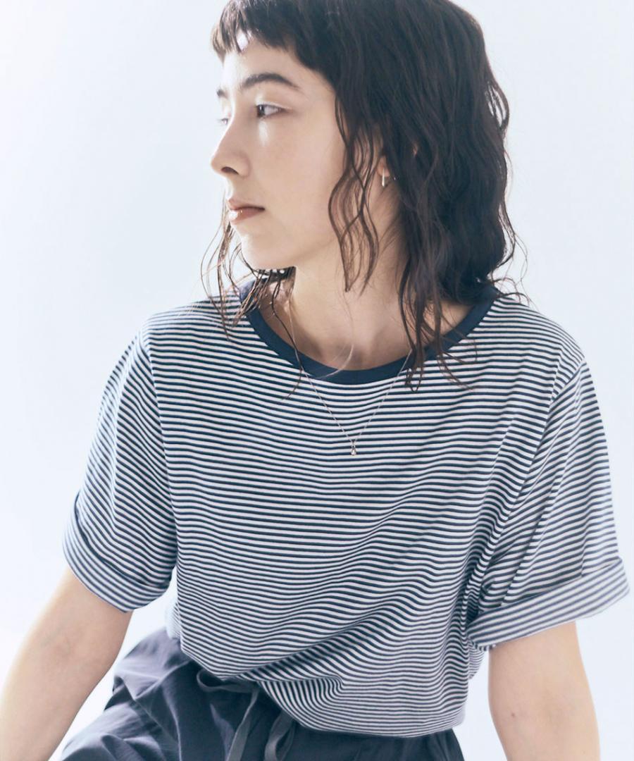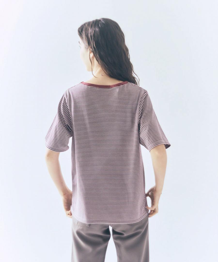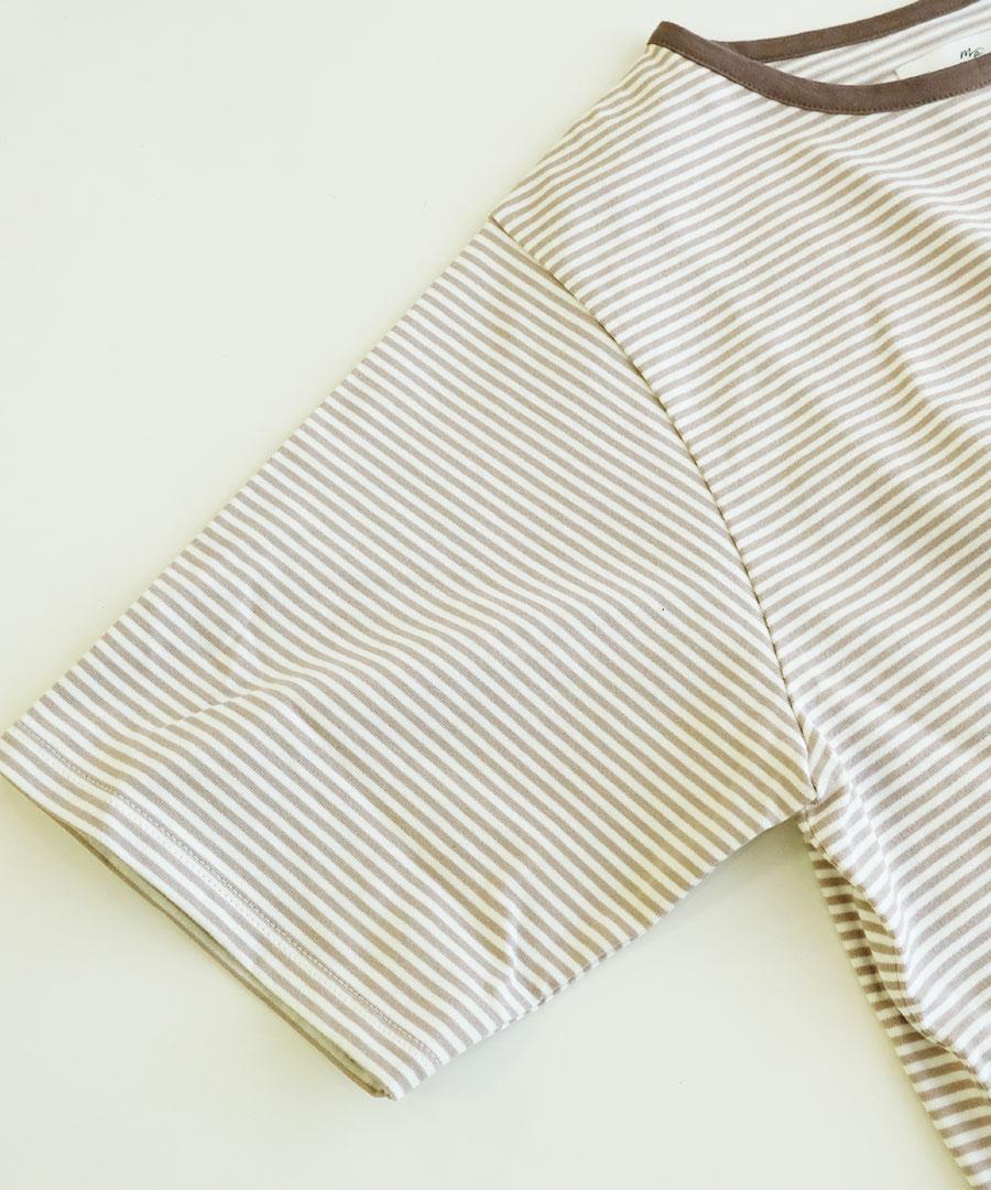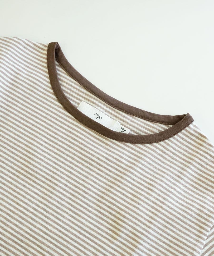 ダークトーンの細ボーダー3色に首元はパイピング、