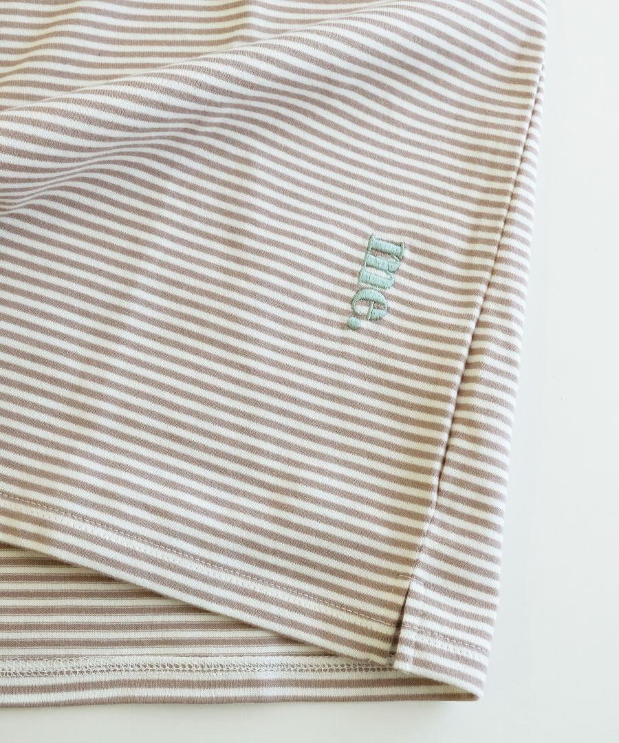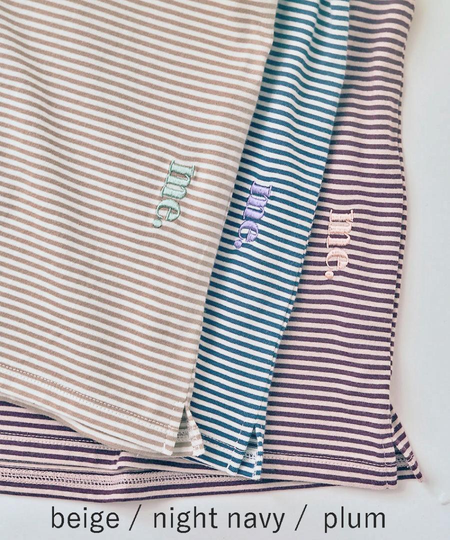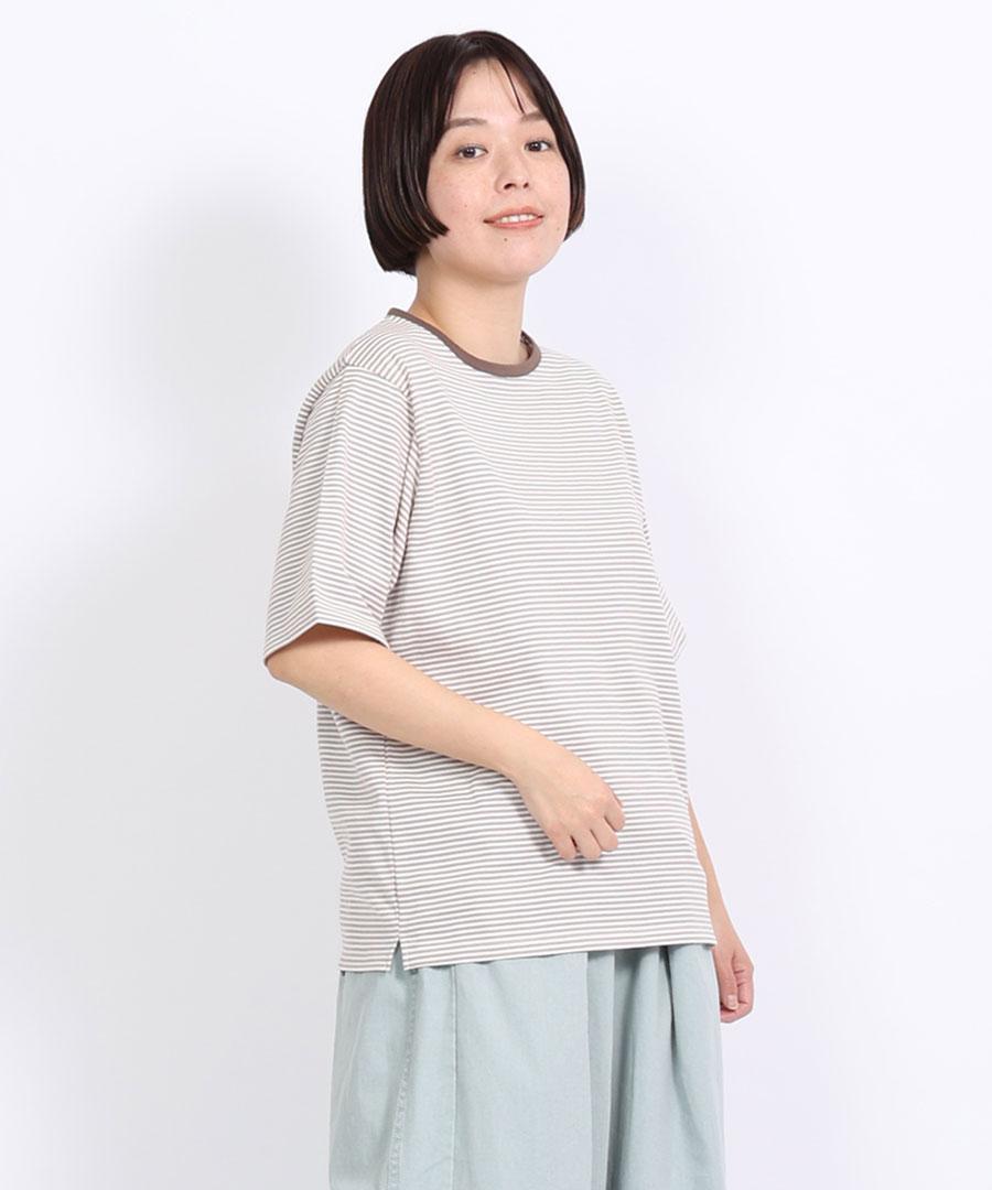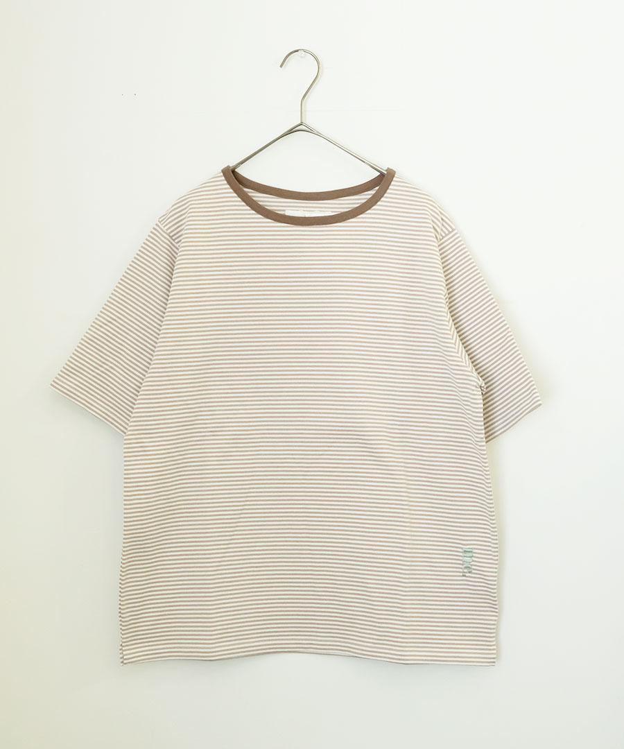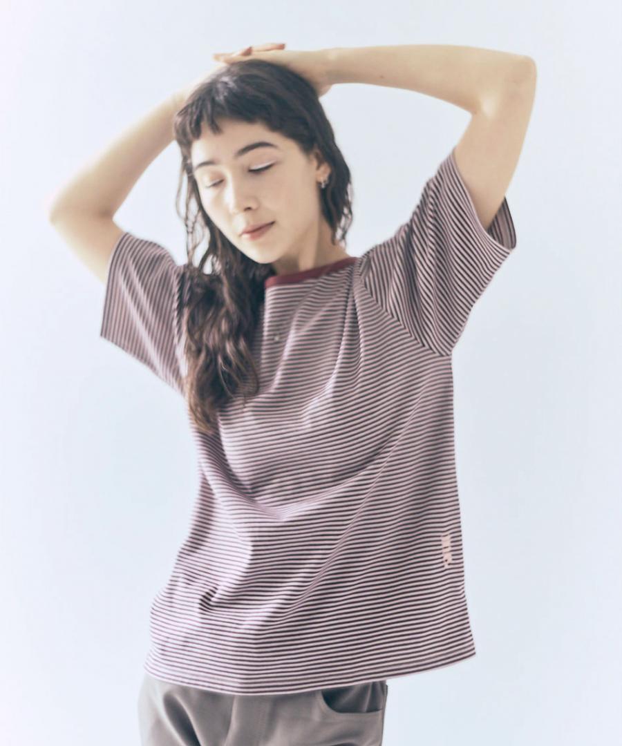 ダークトーンの細ボーダー3色に首元はパイピング、