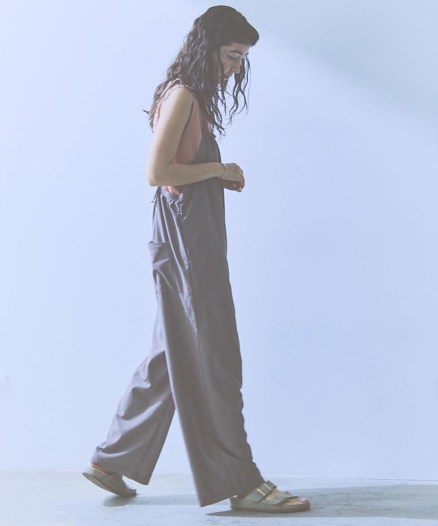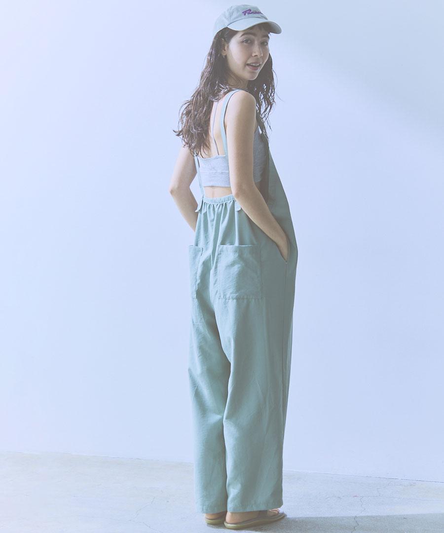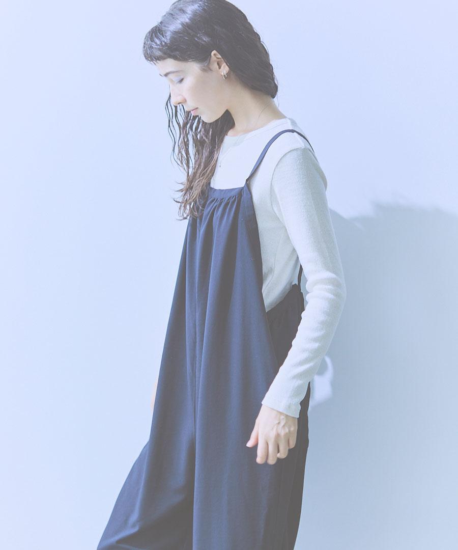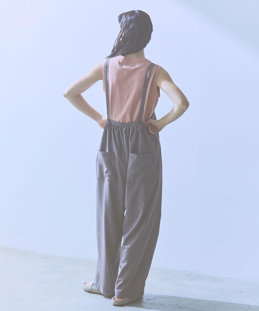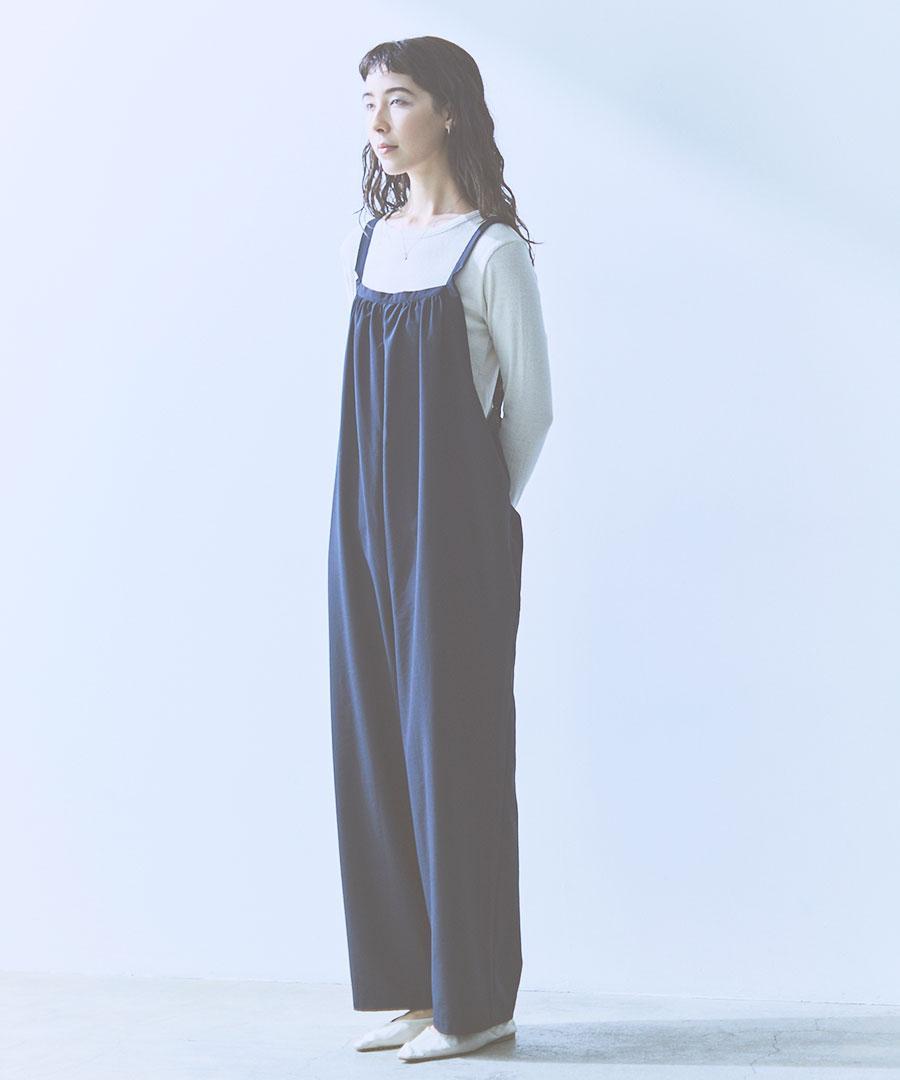 ストンと落ちるシルエットで、シワになりにくく着やすいサロペットです。