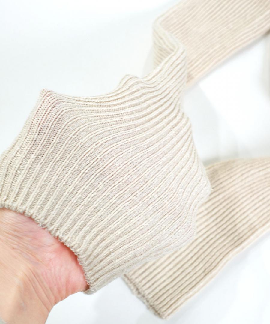 シルクの生成りとコットンのカラーが一緒に 編むことによって、カジュアルだけどカジュアルすぎない