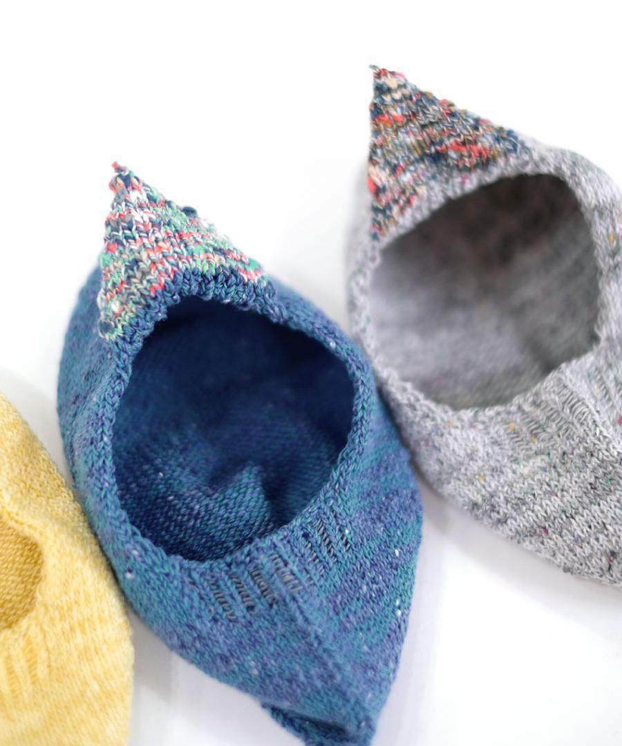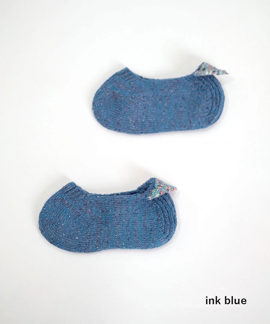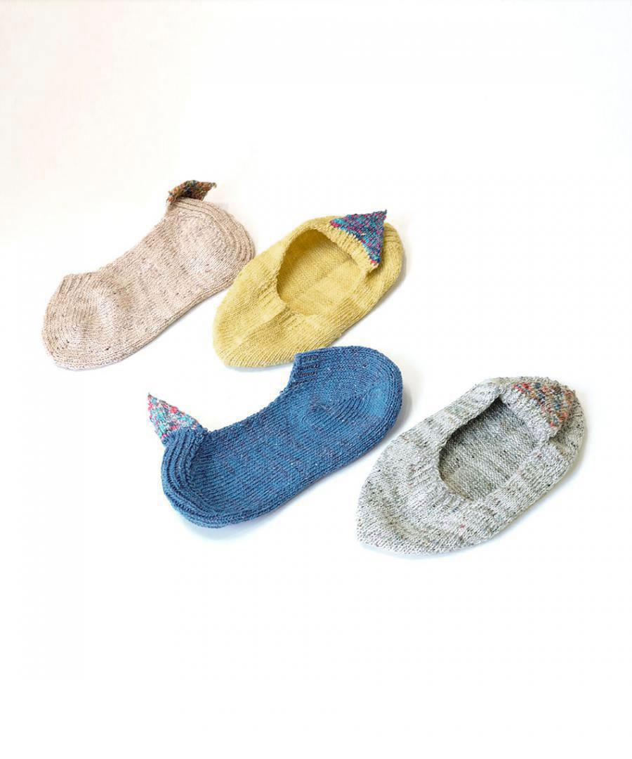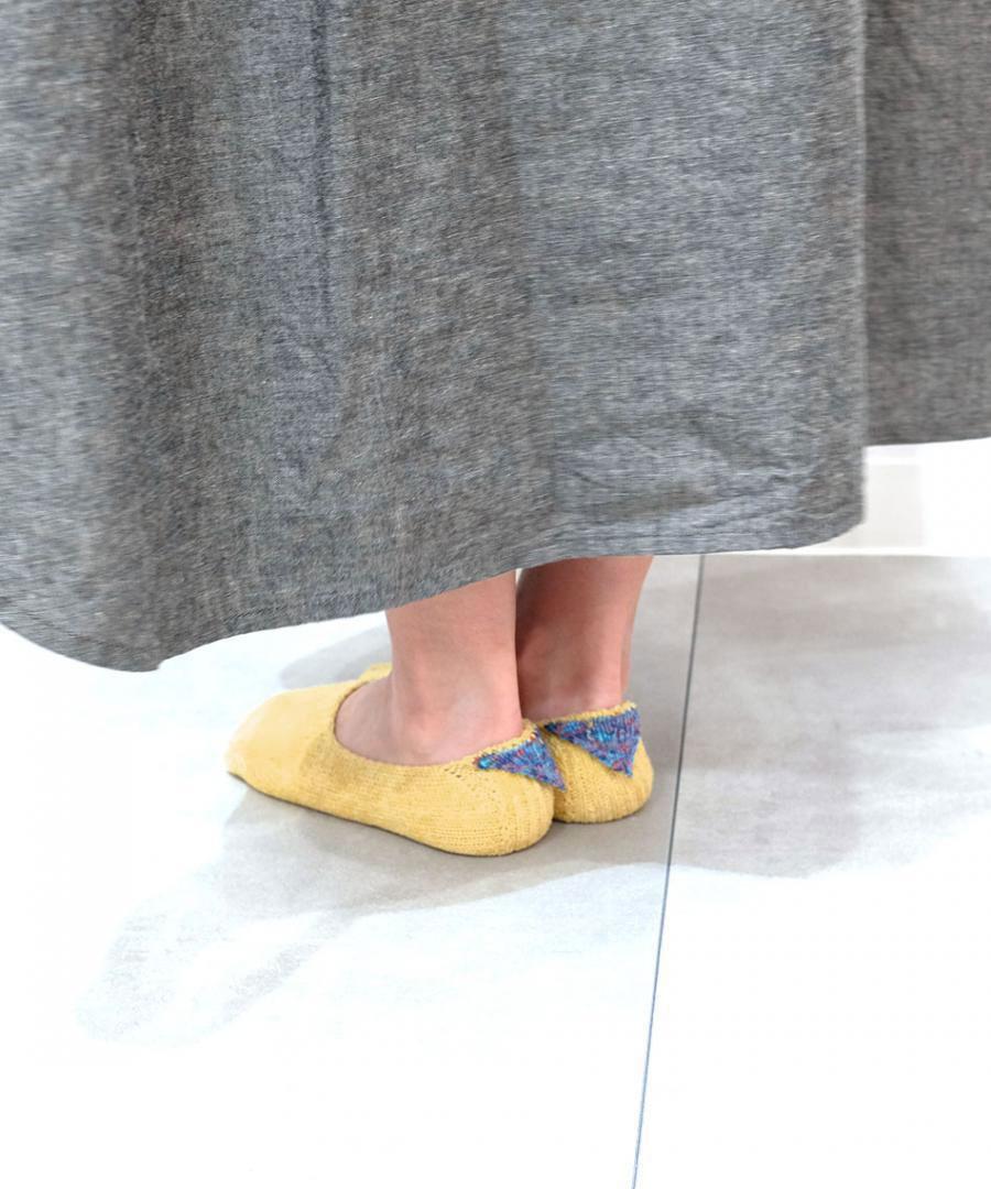 ネップ入りのシルク糸とコットン糸を引き揃え、カラフルな絣糸で 三角のモチーフをかかとに添えました。