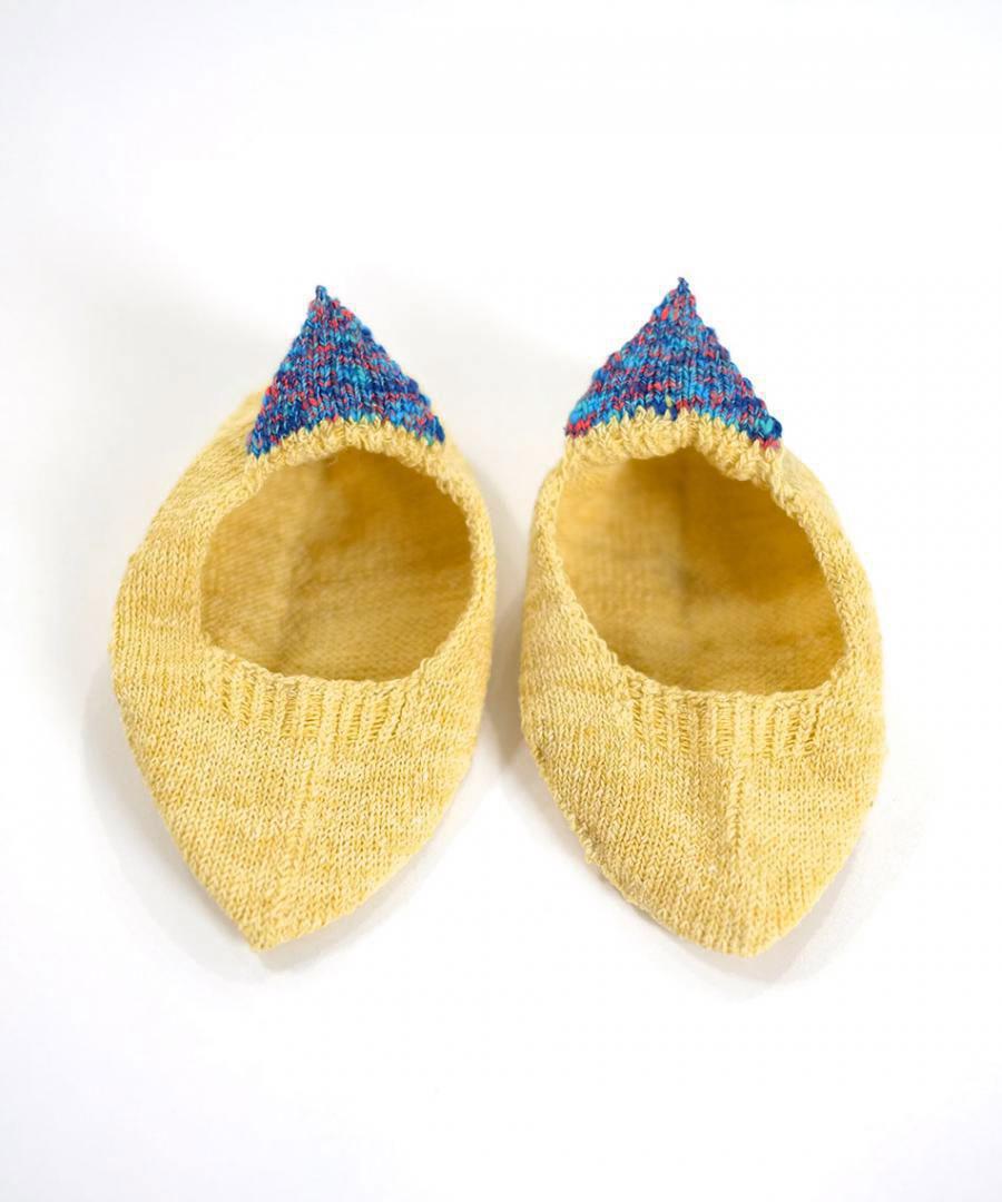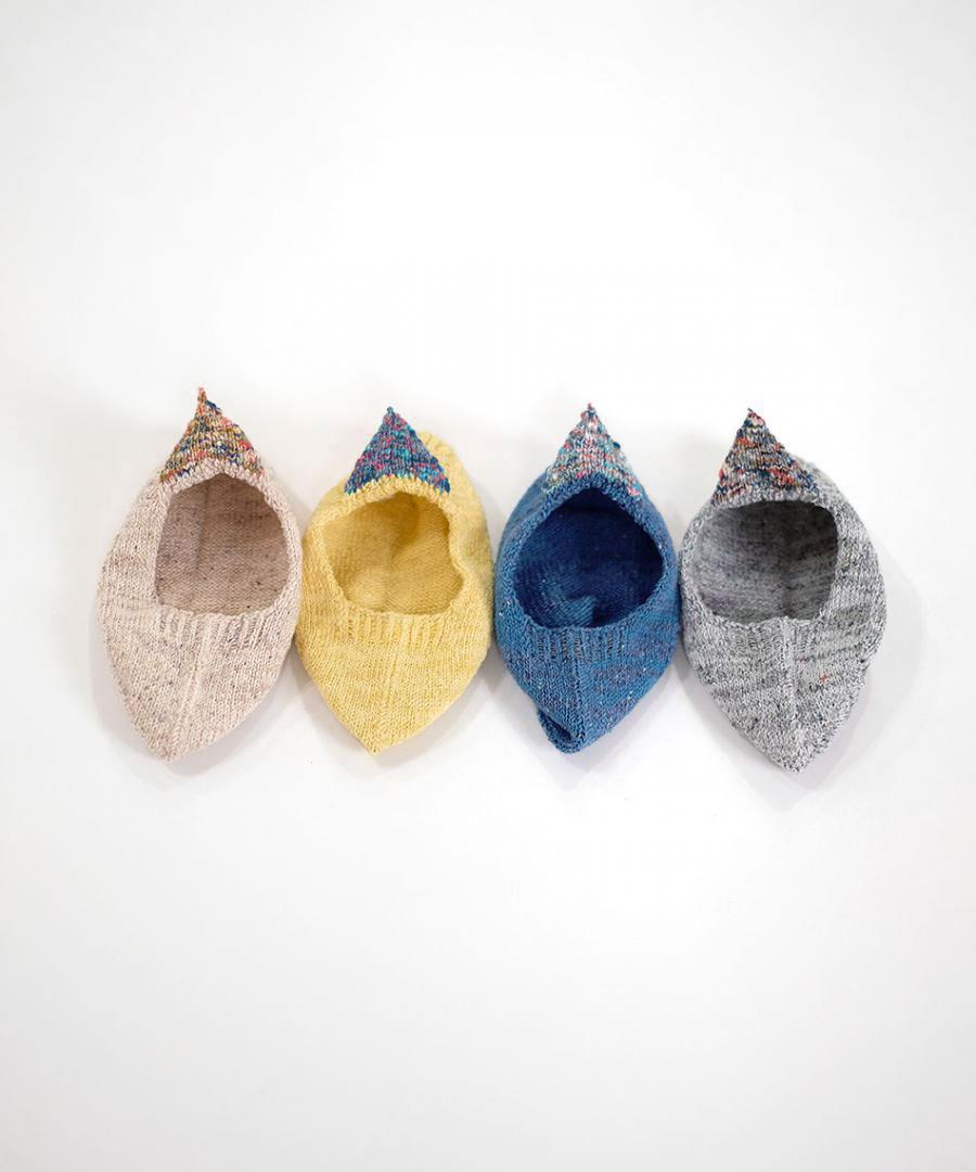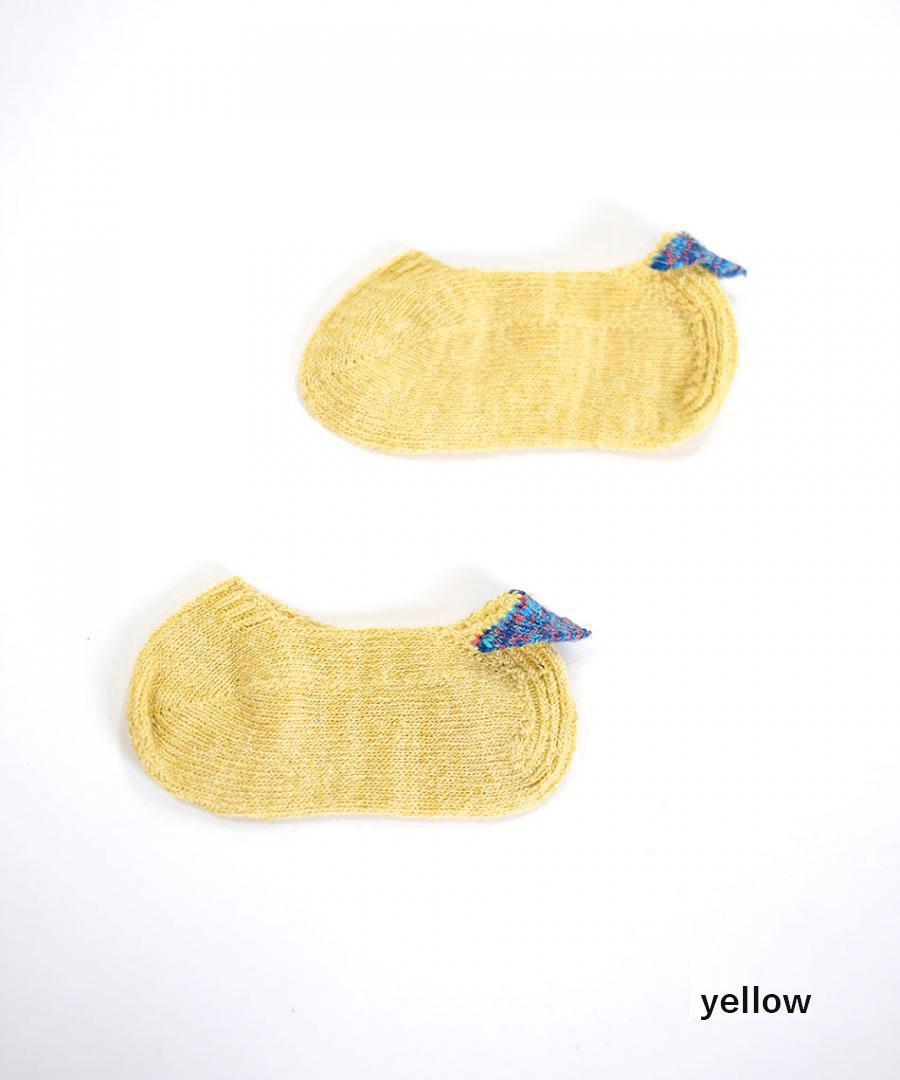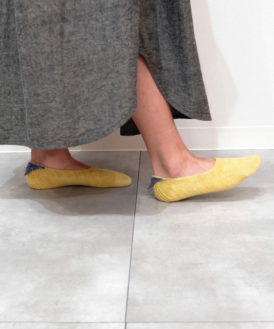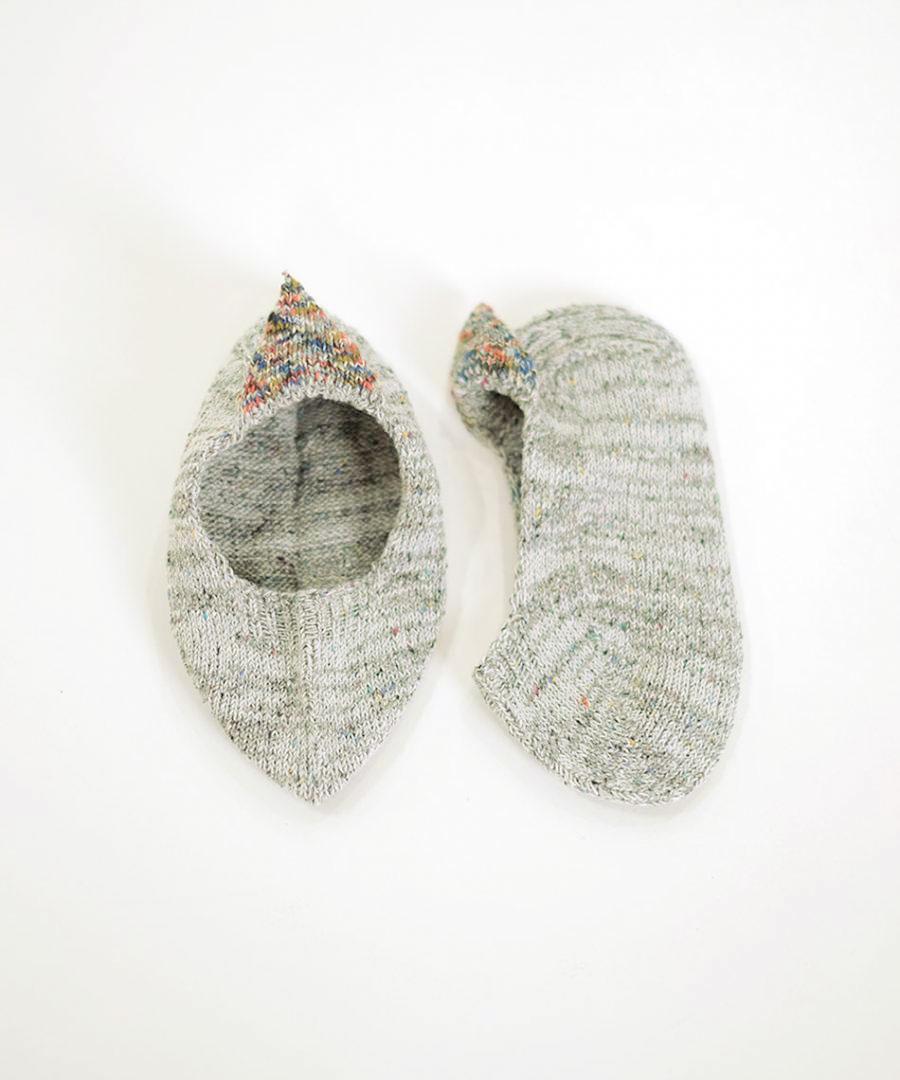 ネップ入りのシルク糸とコットン糸を引き揃え、カラフルな絣糸で 三角のモチーフをかかとに添えました。