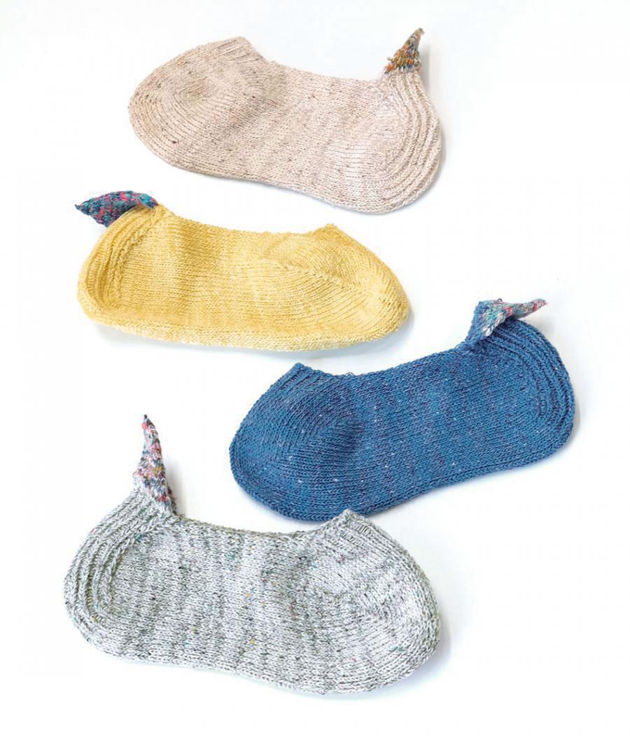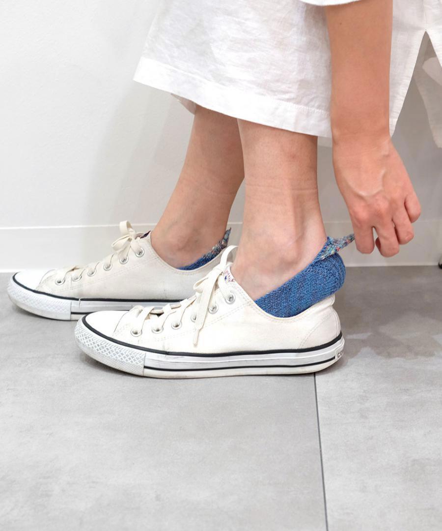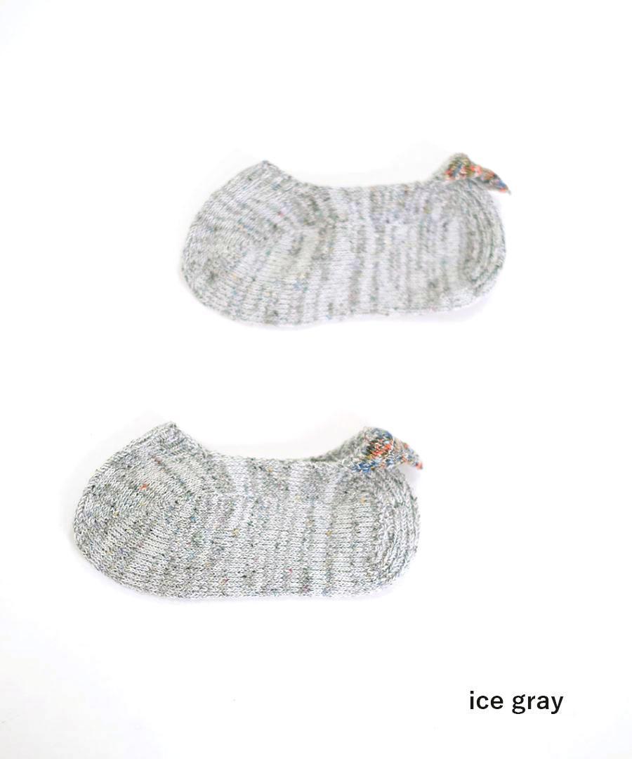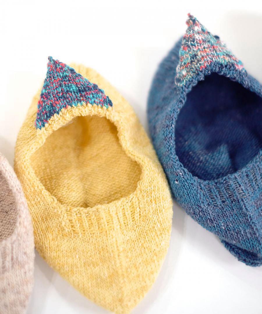 ネップ入りのシルク糸とコットン糸を引き揃え、カラフルな絣糸で 三角のモチーフをかかとに添えました。