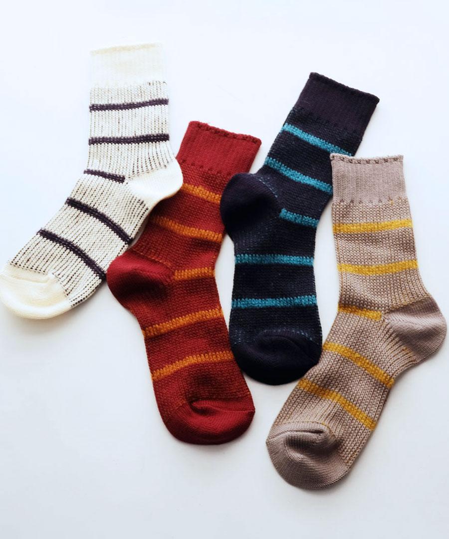 シンプルながらも、色や素材の組み合わせで変化する靴下たち。
