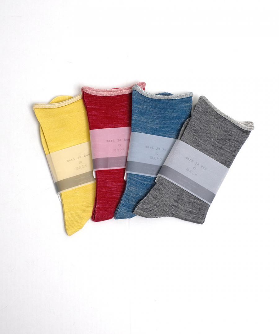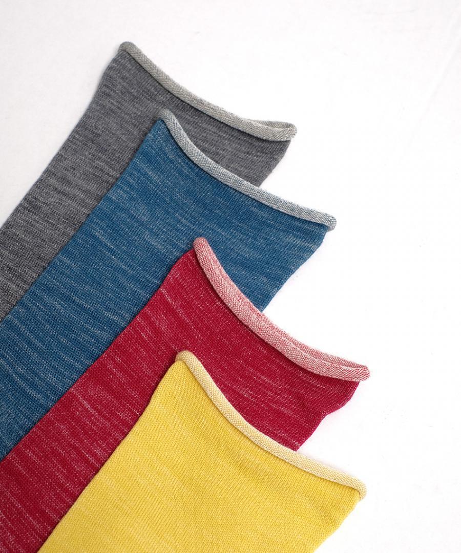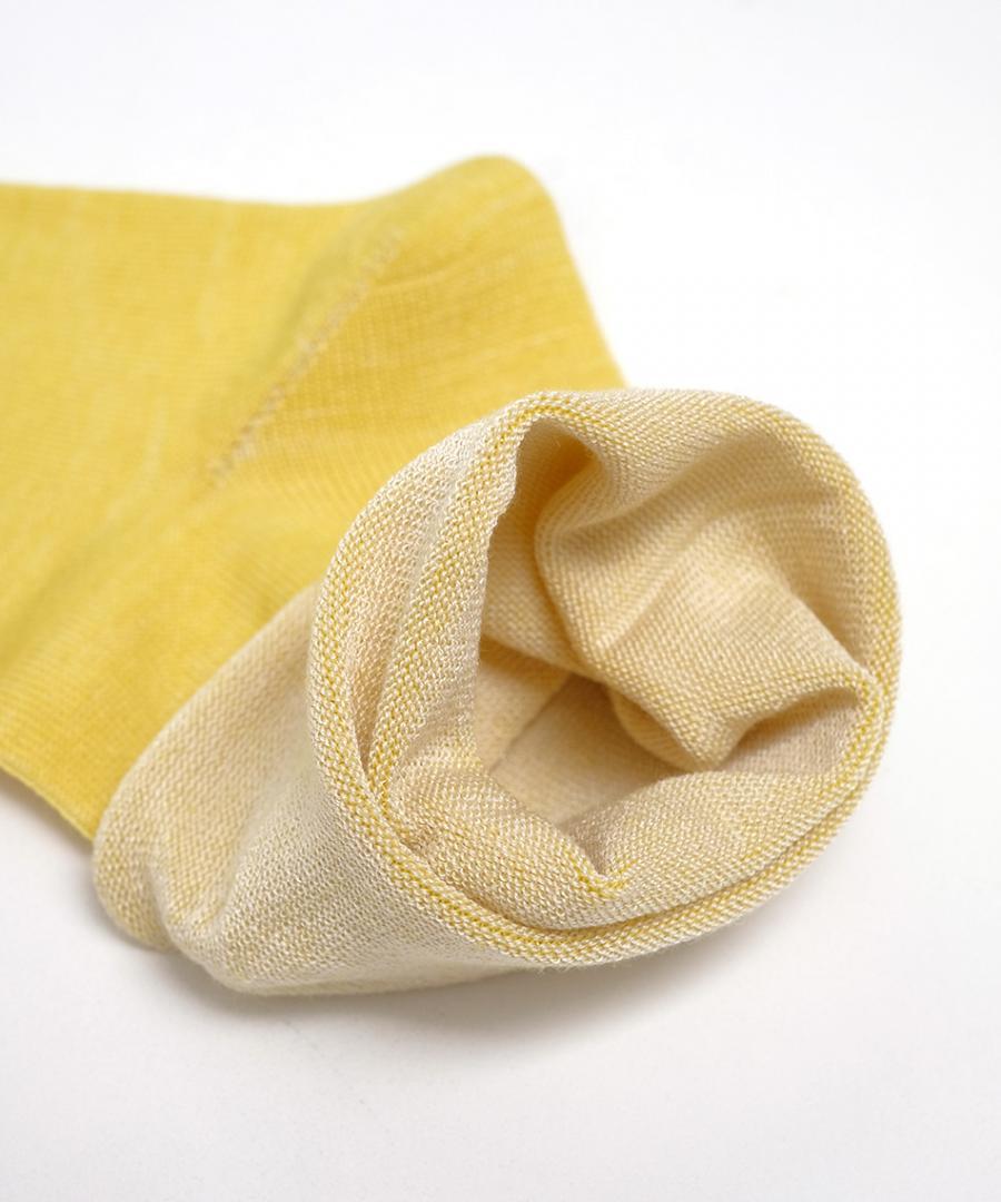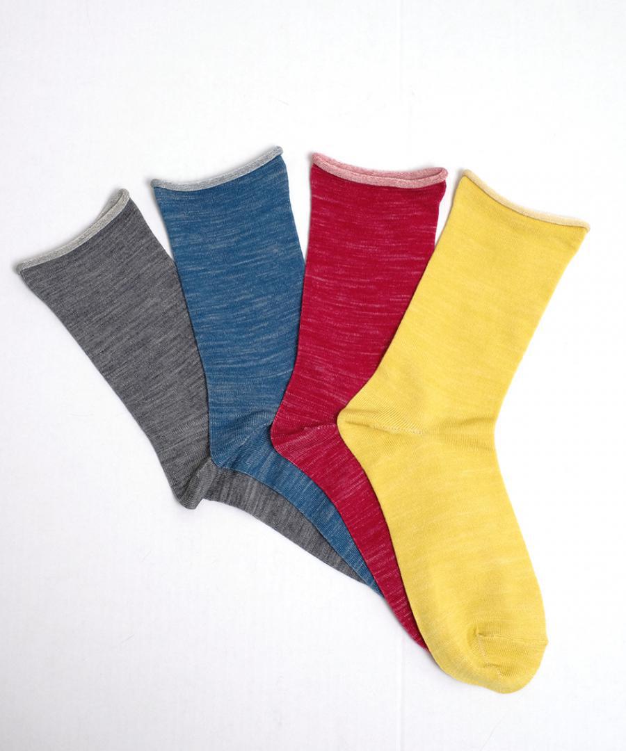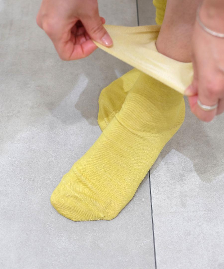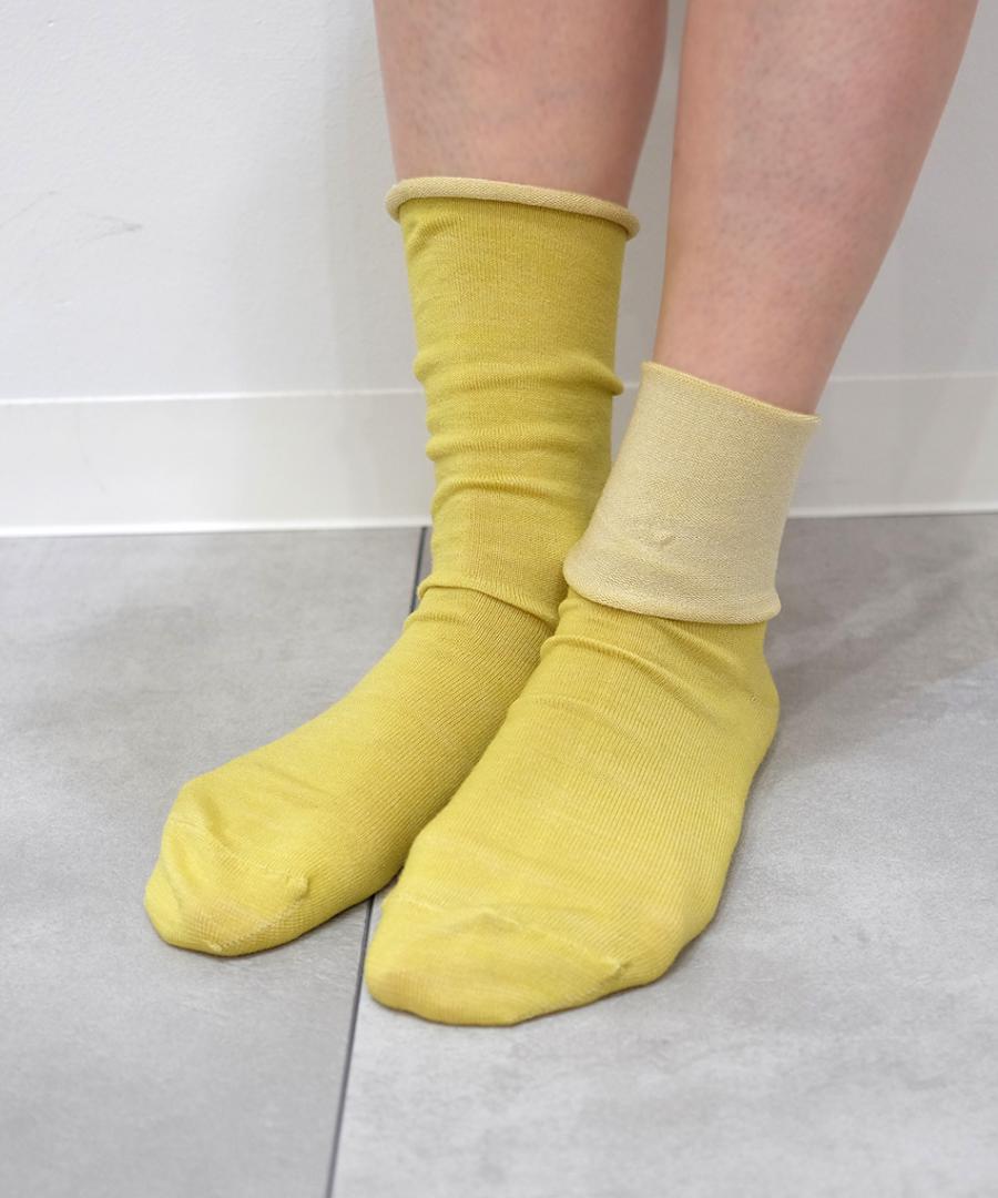 肌にあたる内側をシルク、外側をウールにして薄手に編み上げた、軽い履き心地の靴下です。