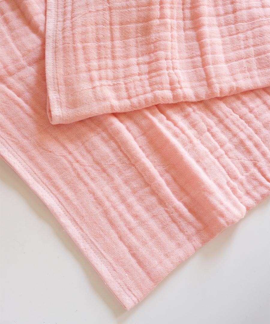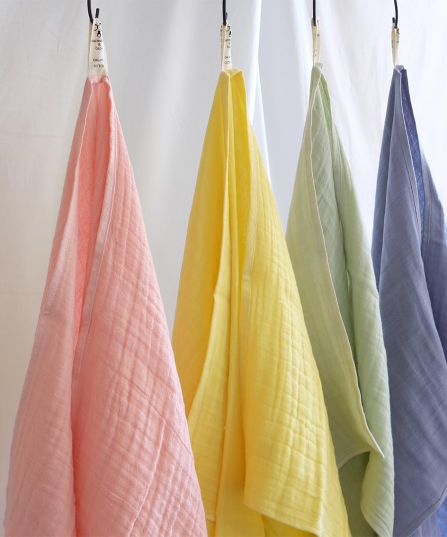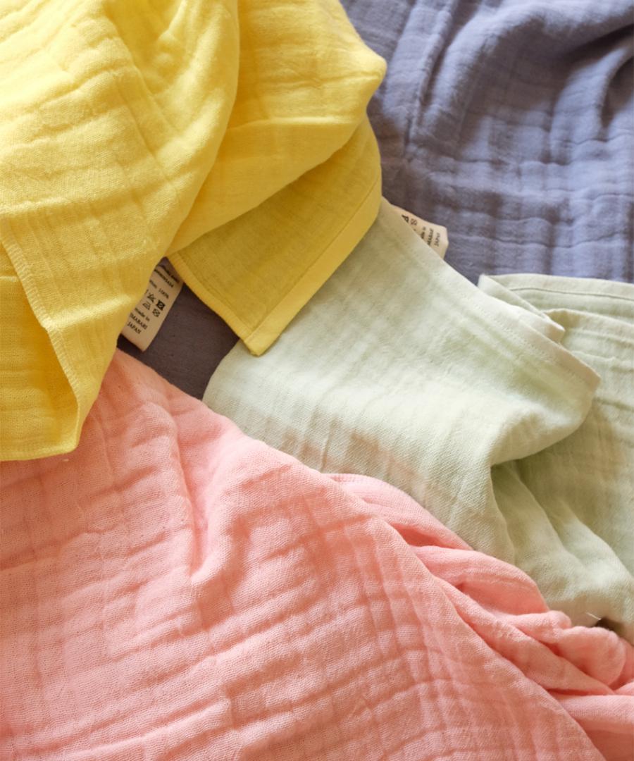 オーガニックコットンを使用したおくるみは、 愛媛県今治で丁寧に織った三層ガーゼ生地を使用しています。