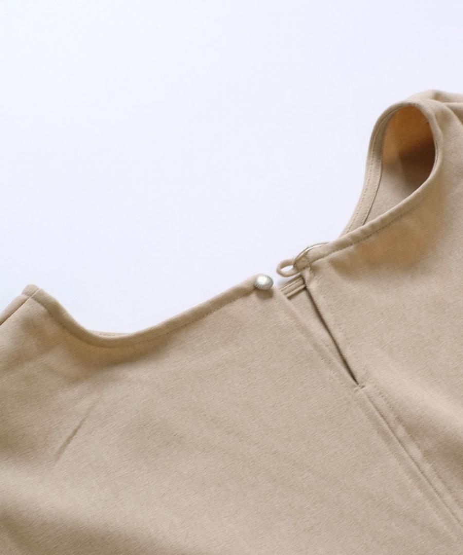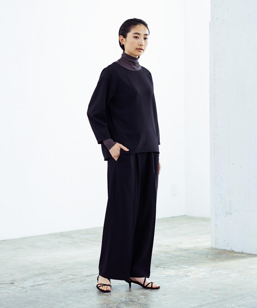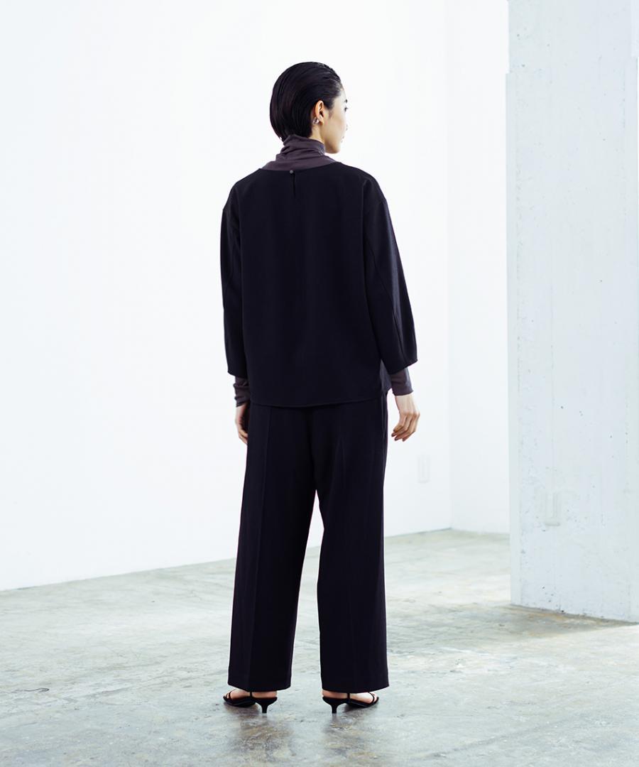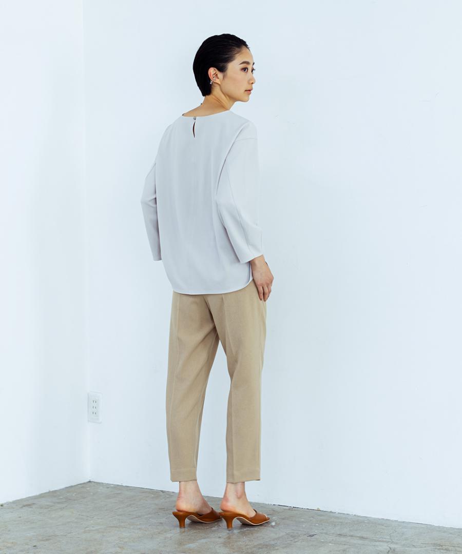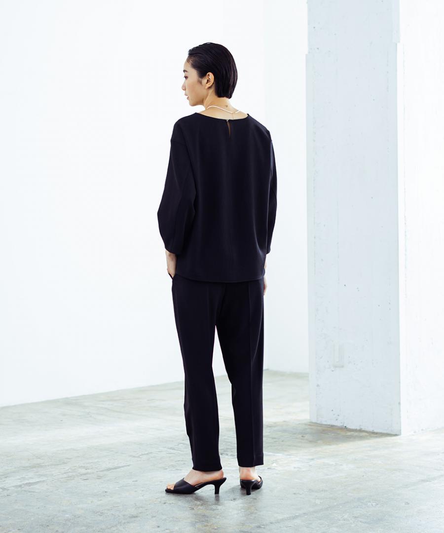 肩幅を少し広めにとり、上品なイメージは残しつつナチュラルなドロップショルダーで抜け感もプラス。