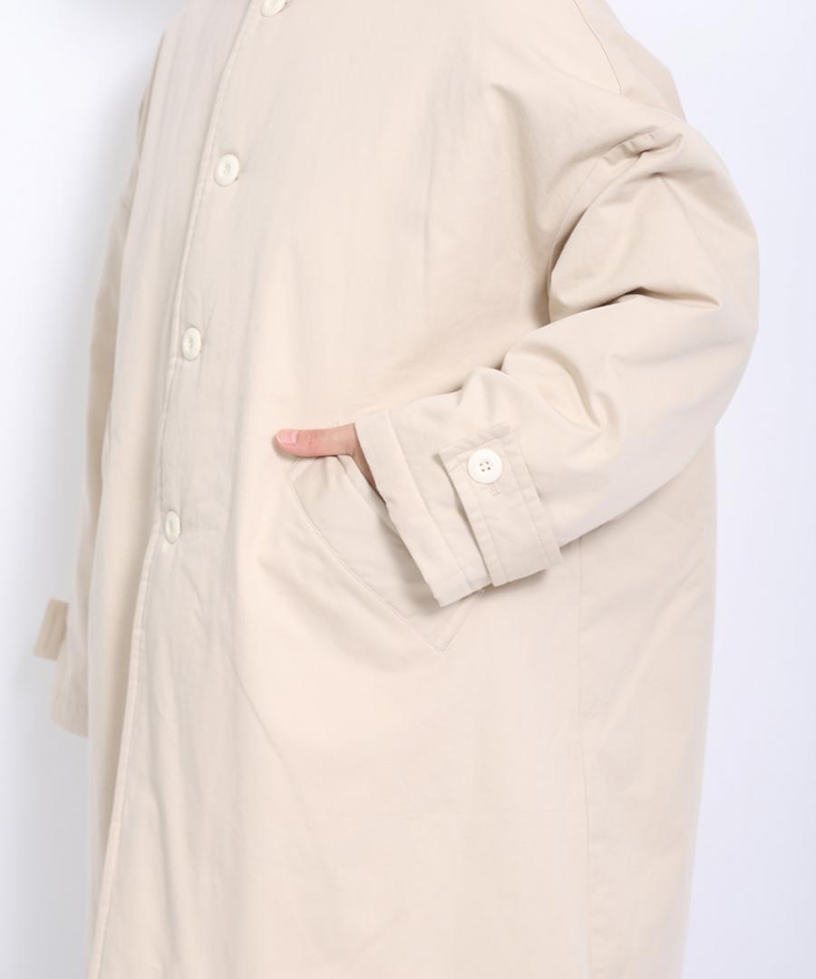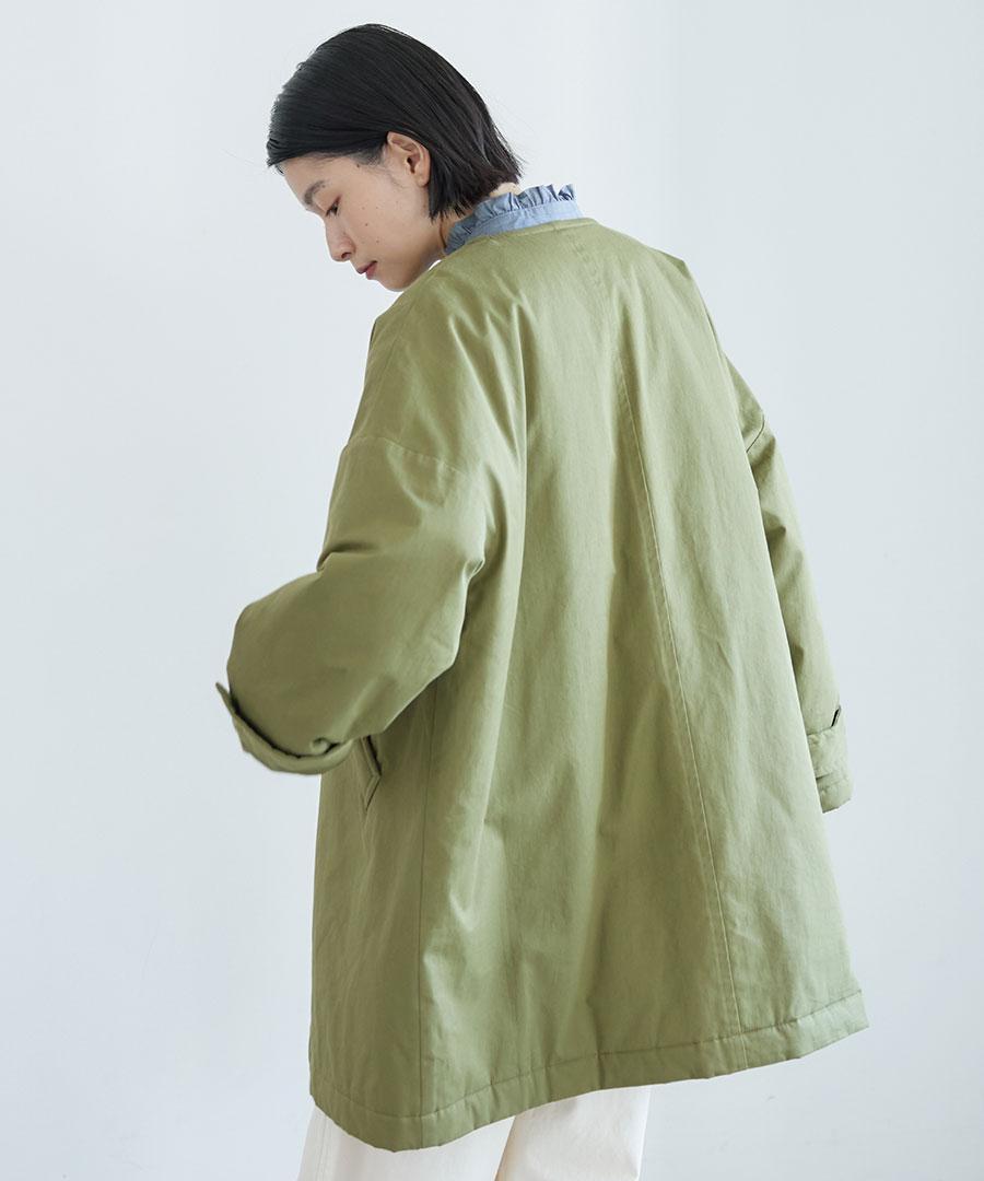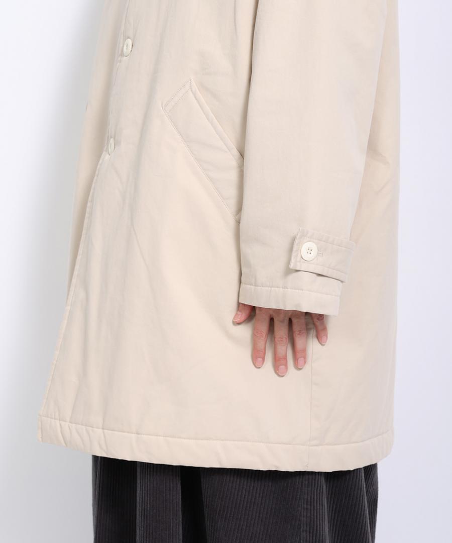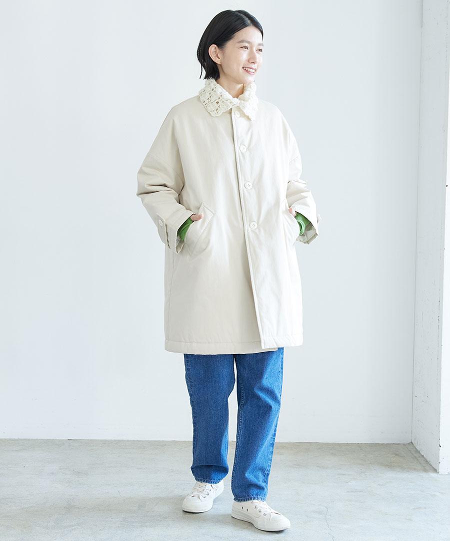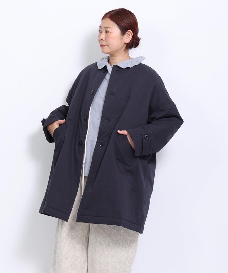 シルケットツイル生地に薄い中綿を内蔵したワイドコート。