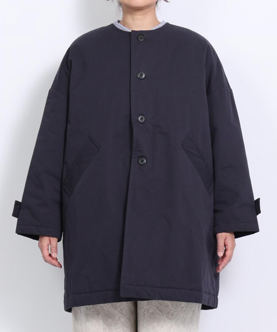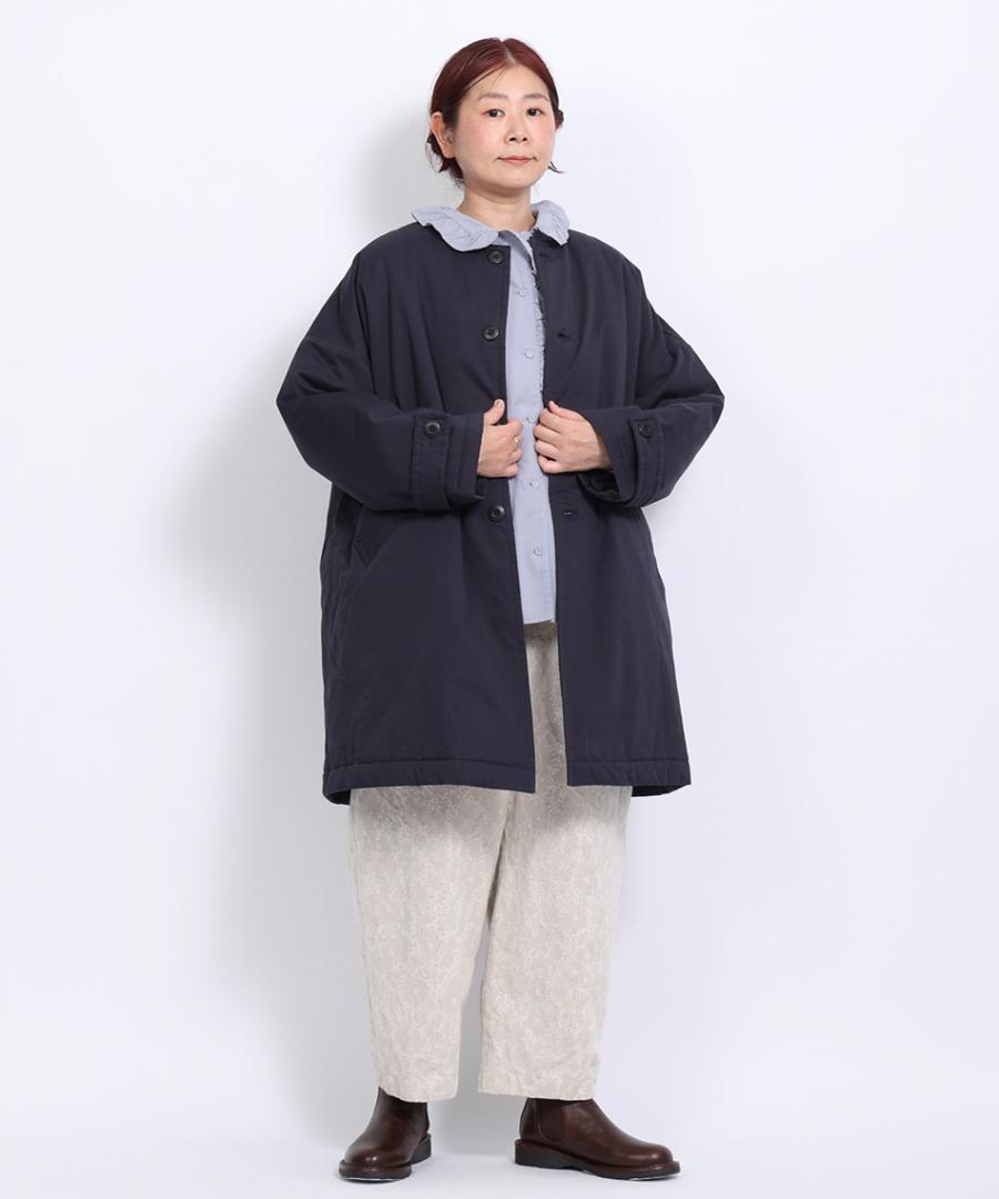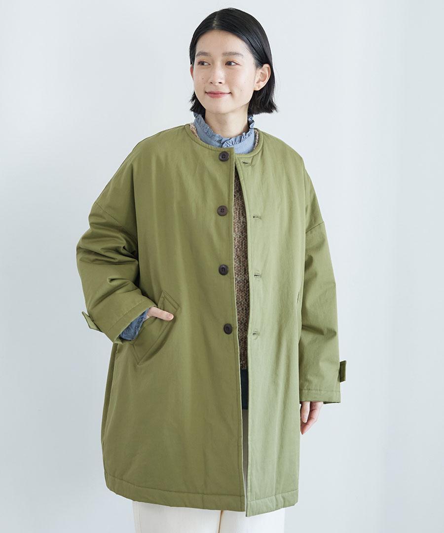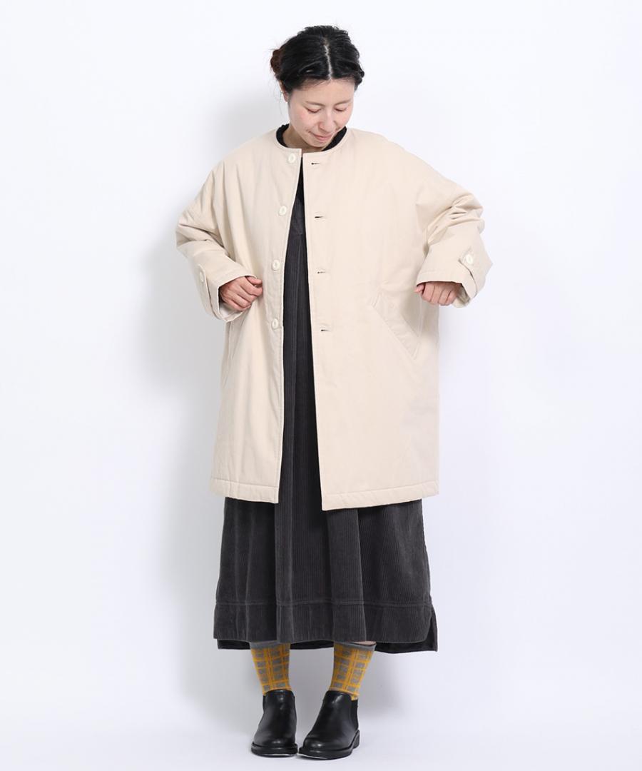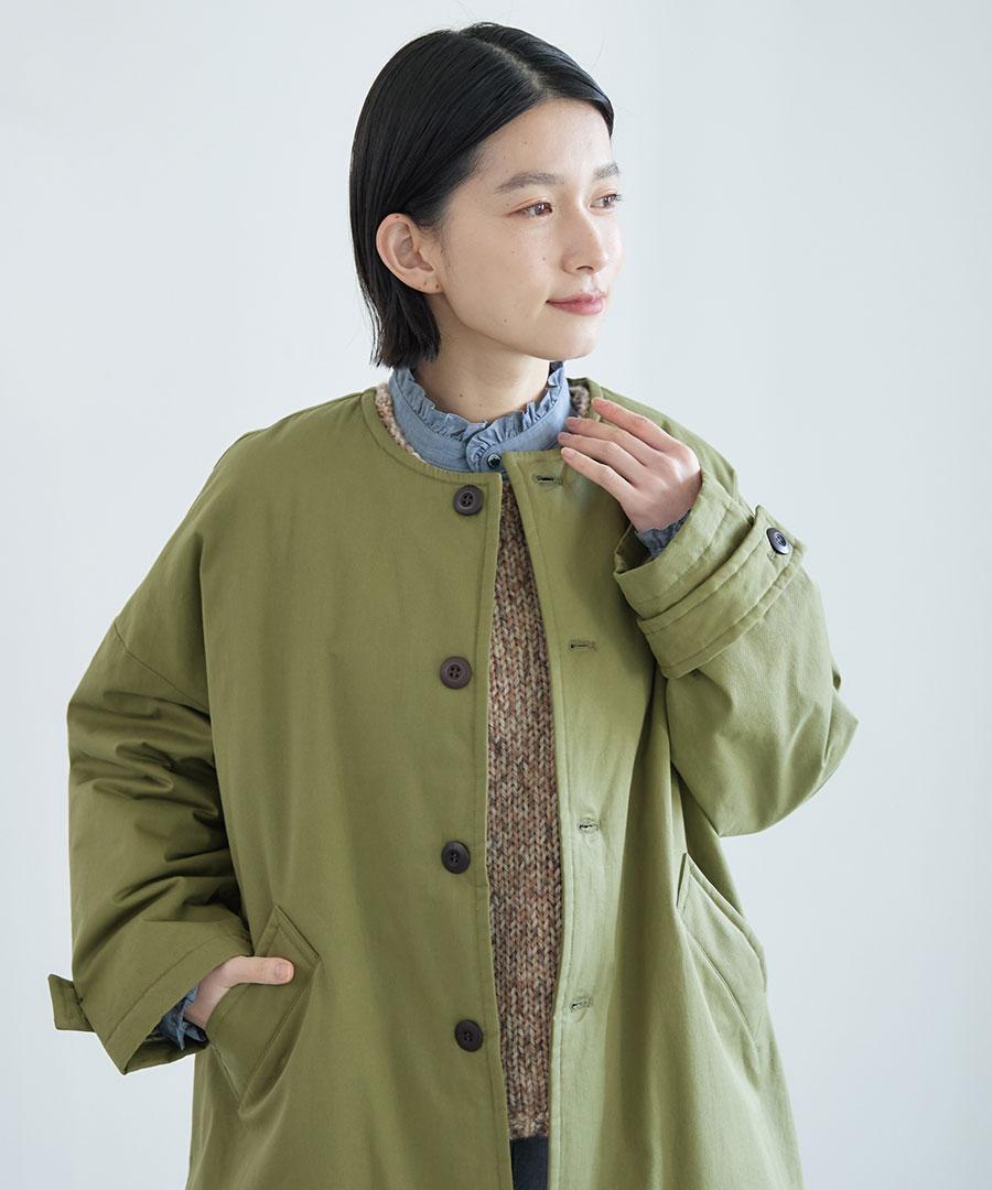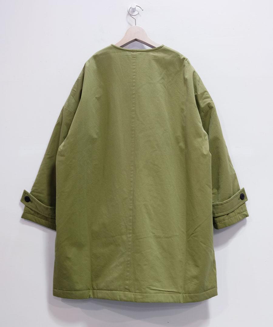シルケットツイル生地に薄い中綿を内蔵したワイドコート。