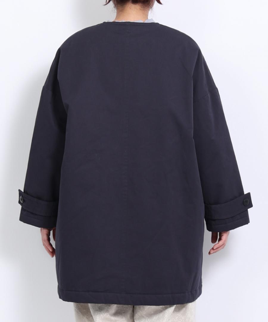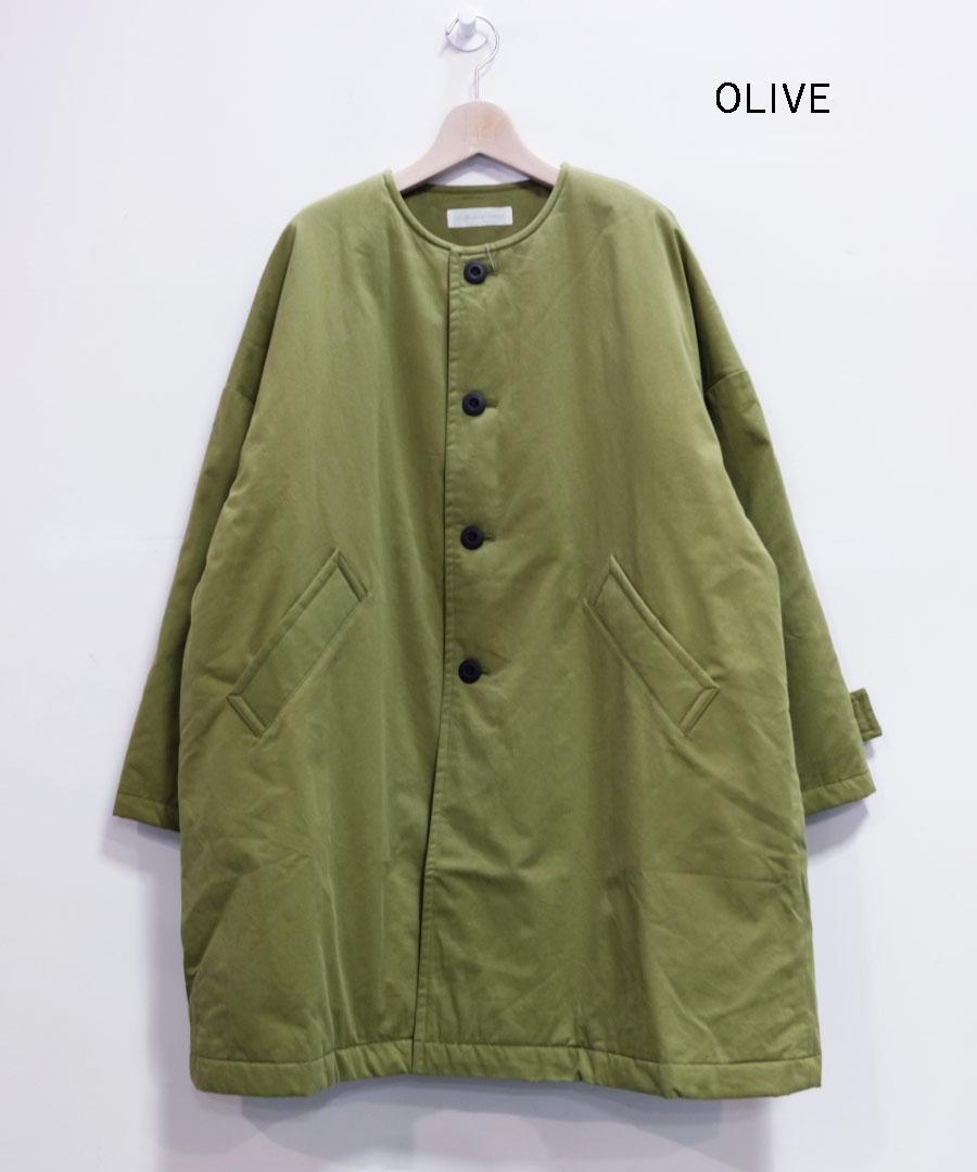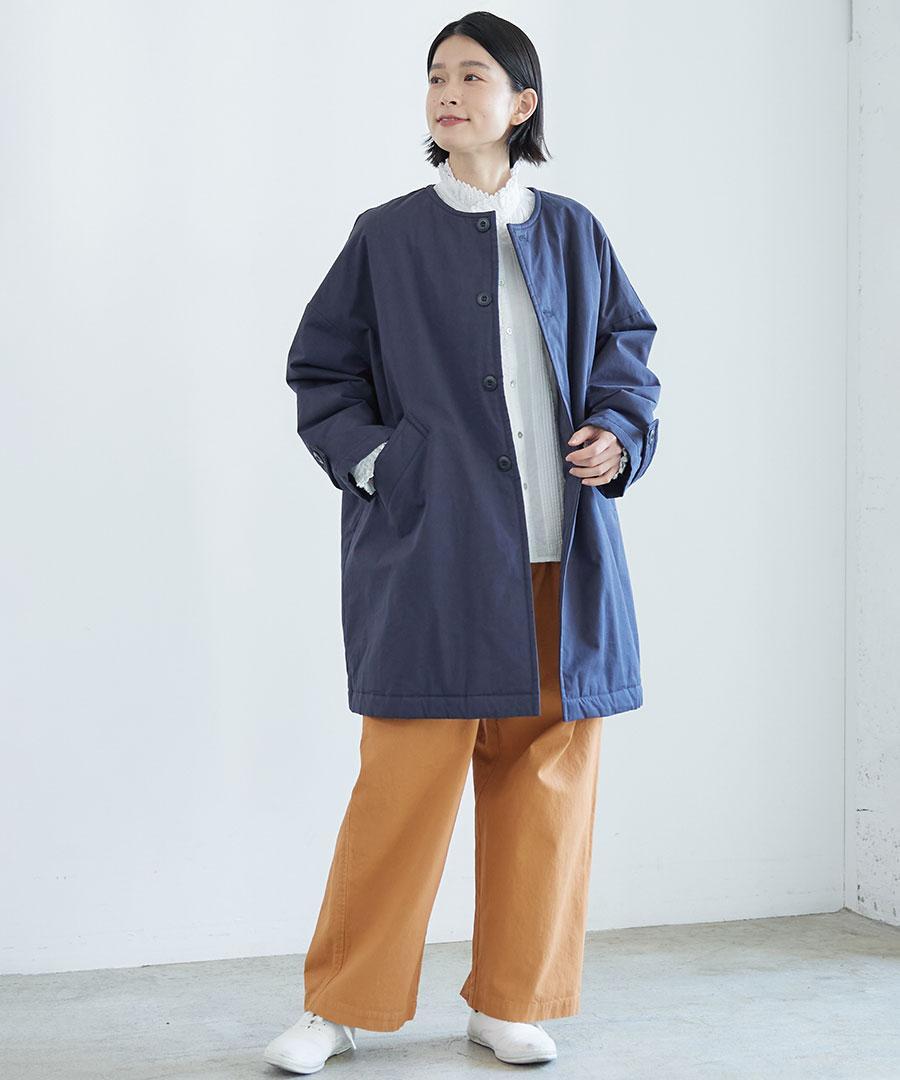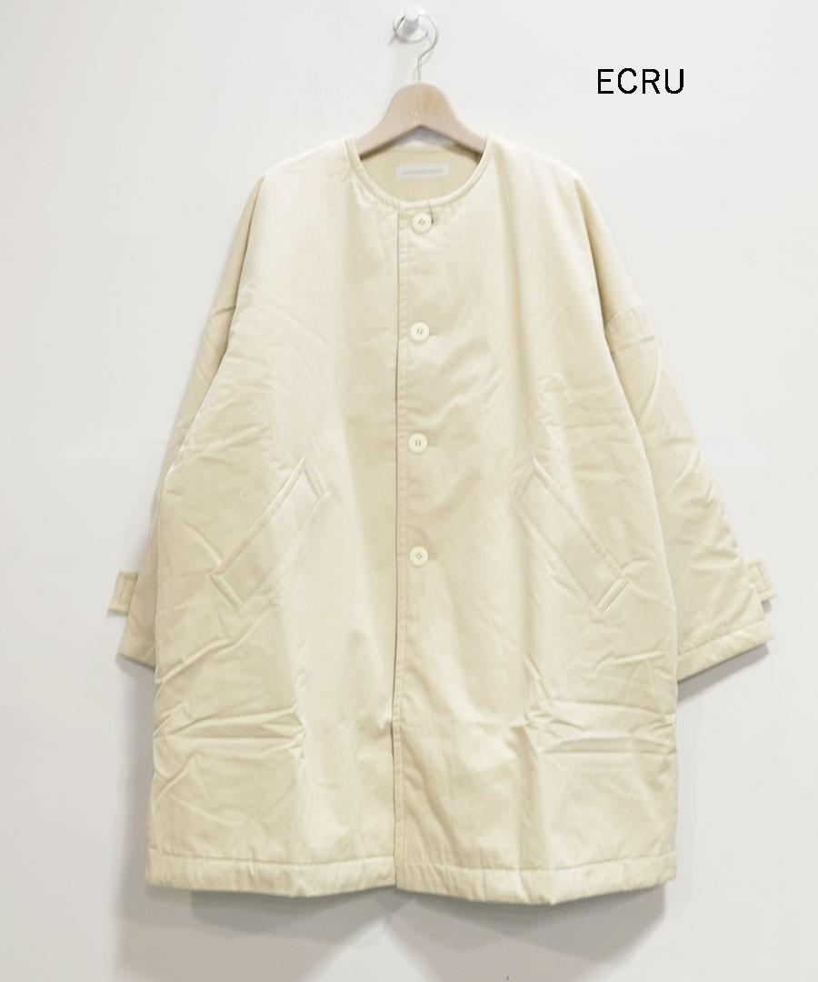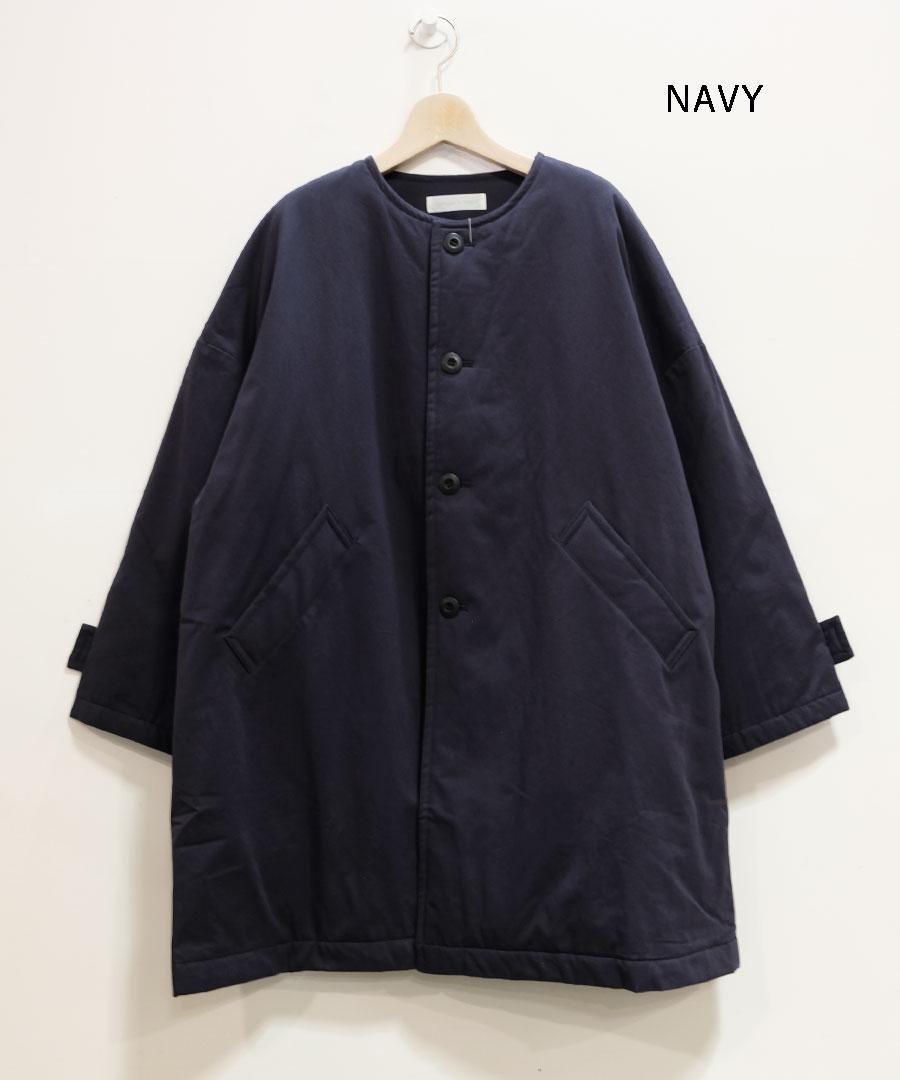 シルケットツイル生地に薄い中綿を内蔵したワイドコート。
