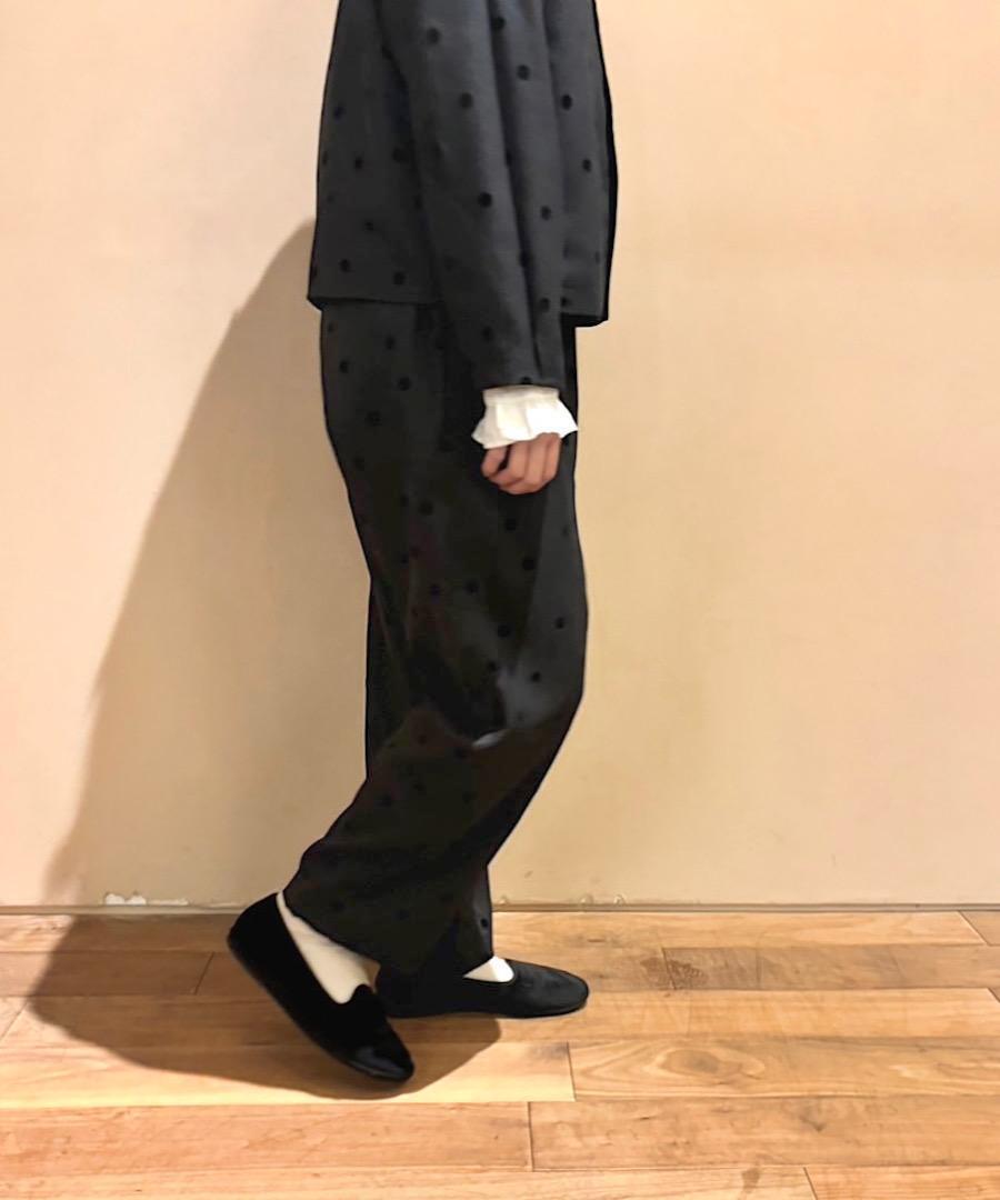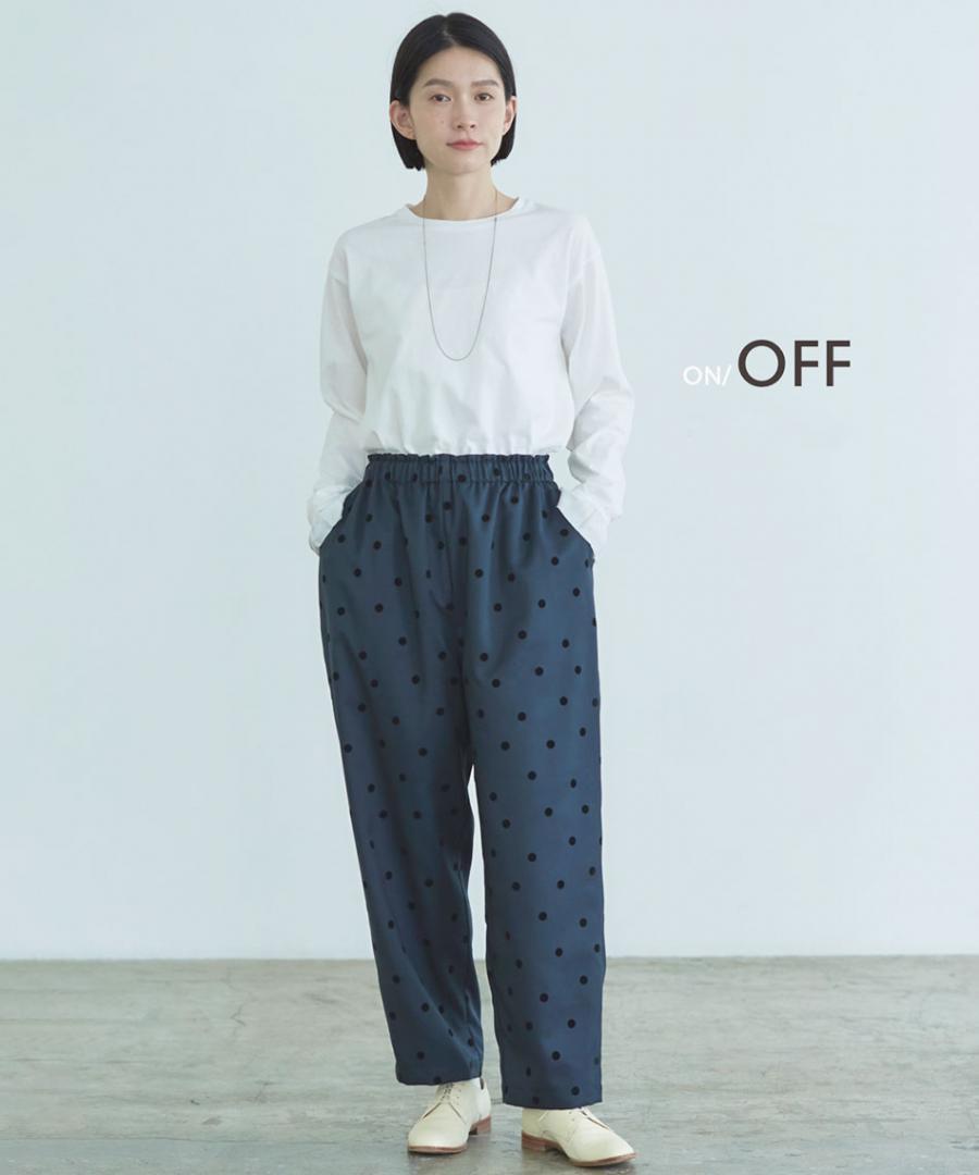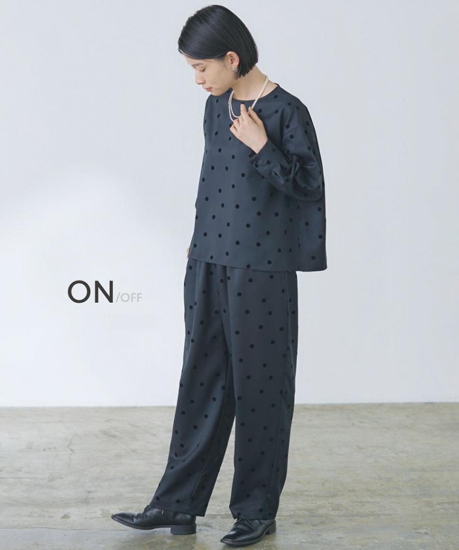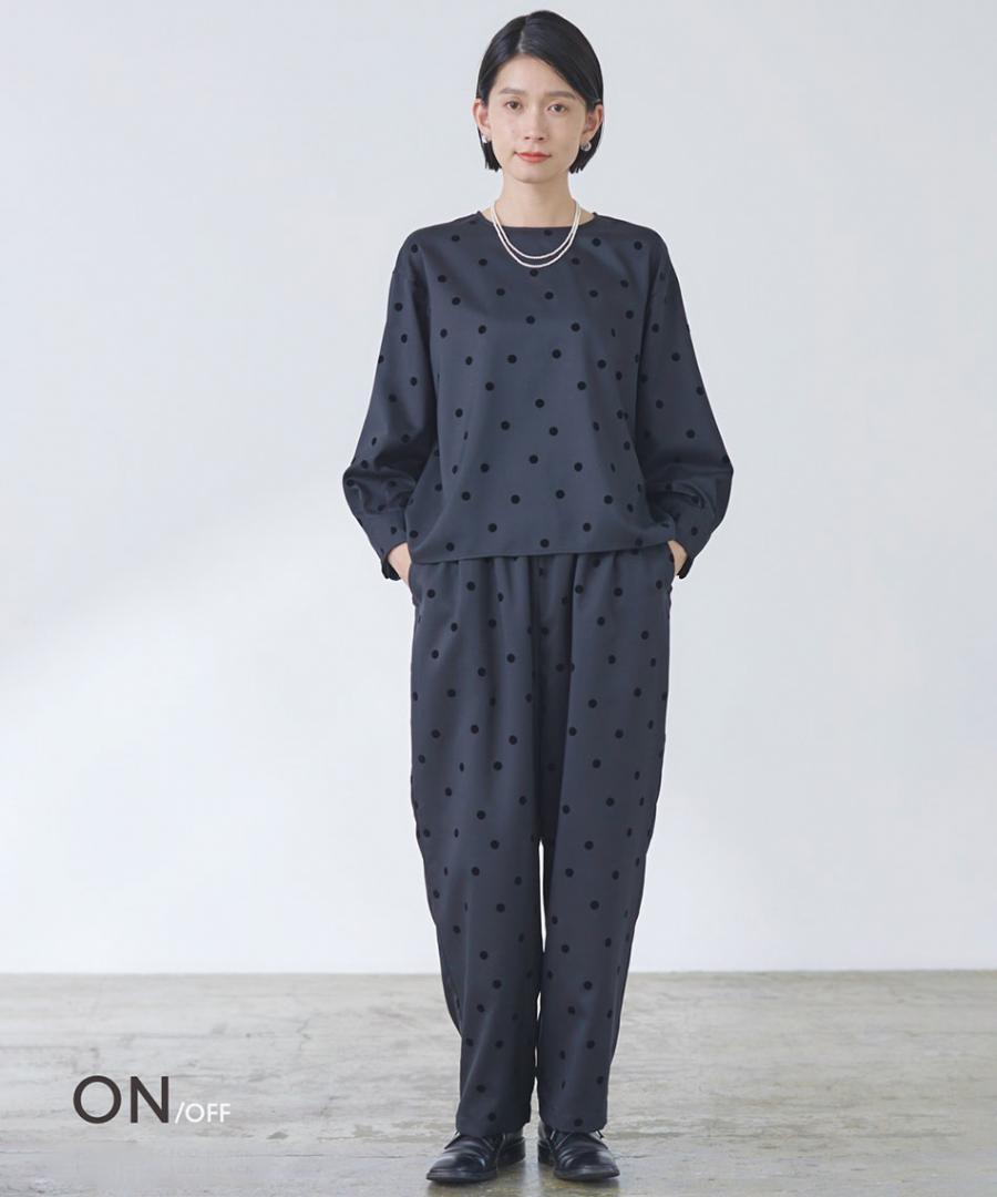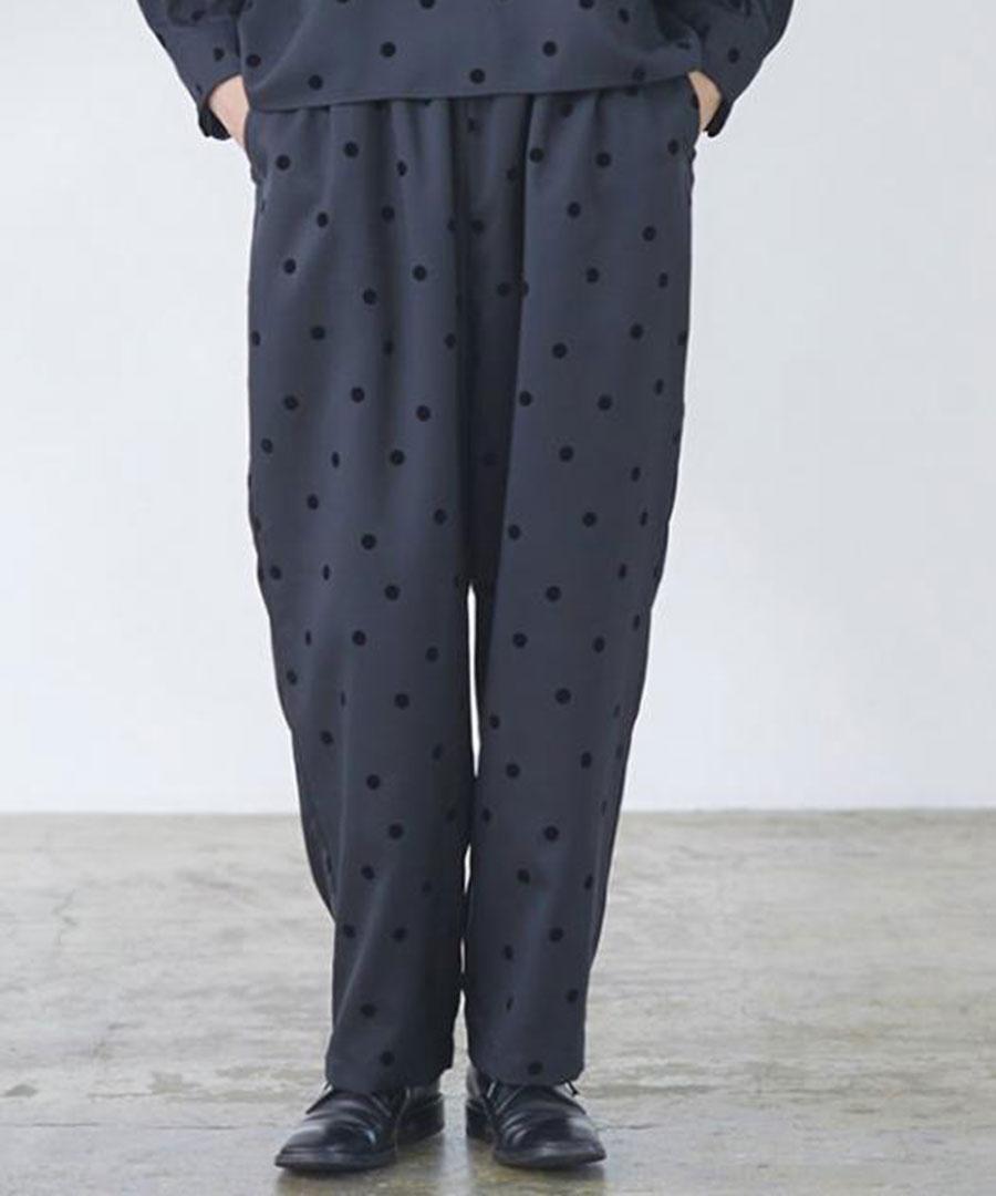 軽くてサラッとした肌触りが心地よいツイル生地にドット柄のフロッキー加工を施しました。