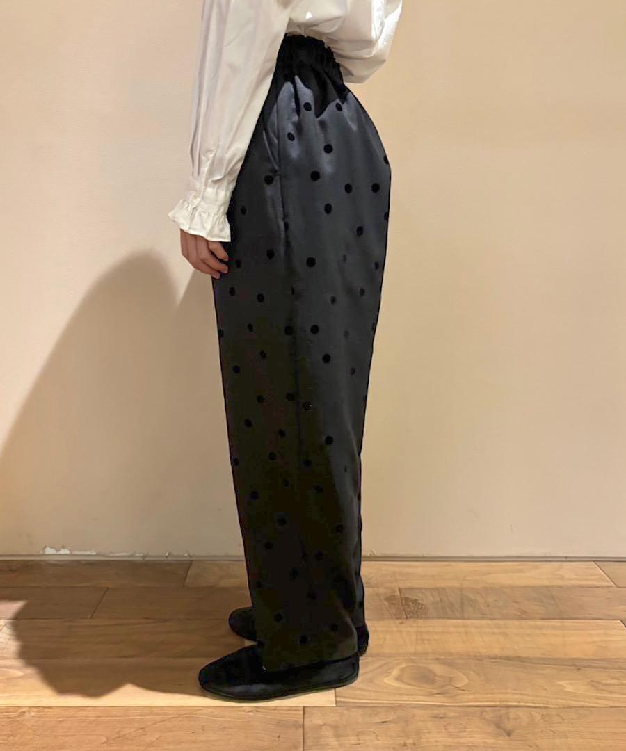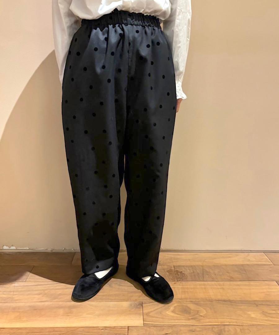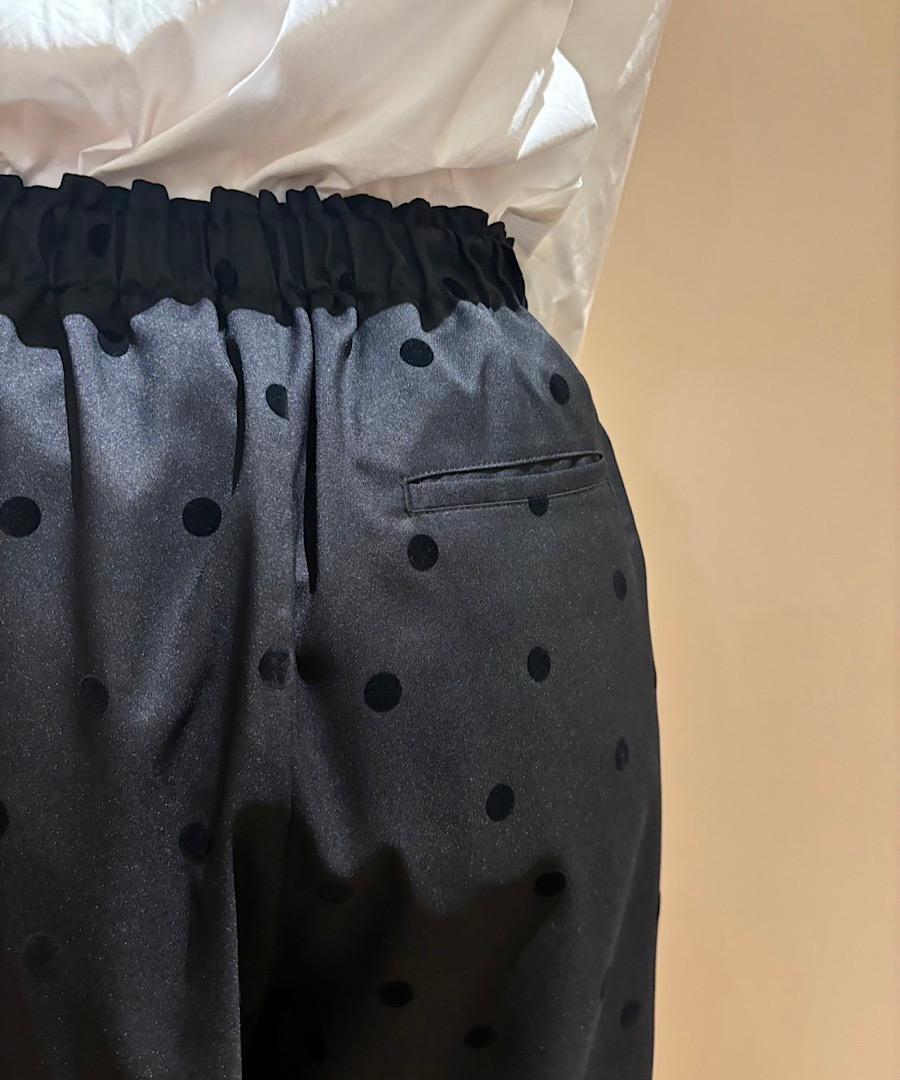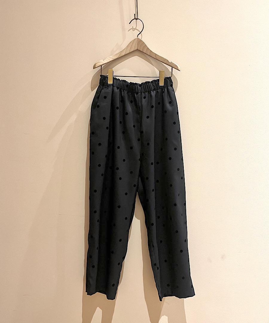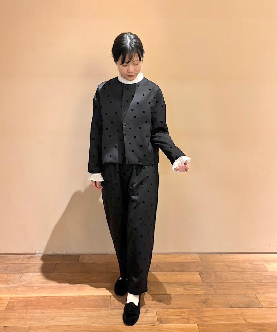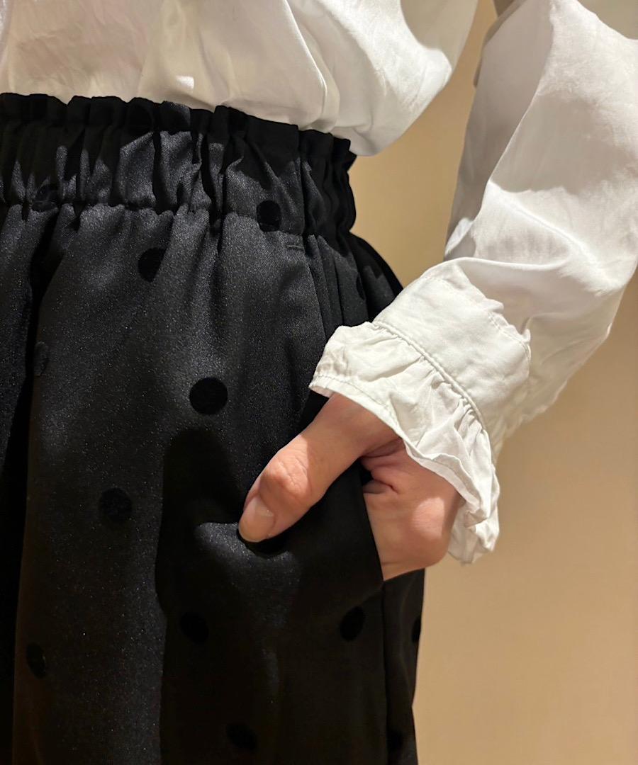 軽くてサラッとした肌触りが心地よいツイル生地にドット柄のフロッキー加工を施しました。