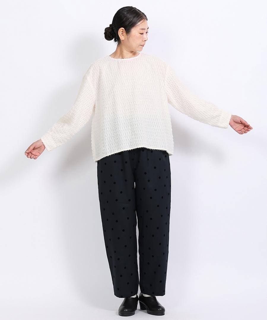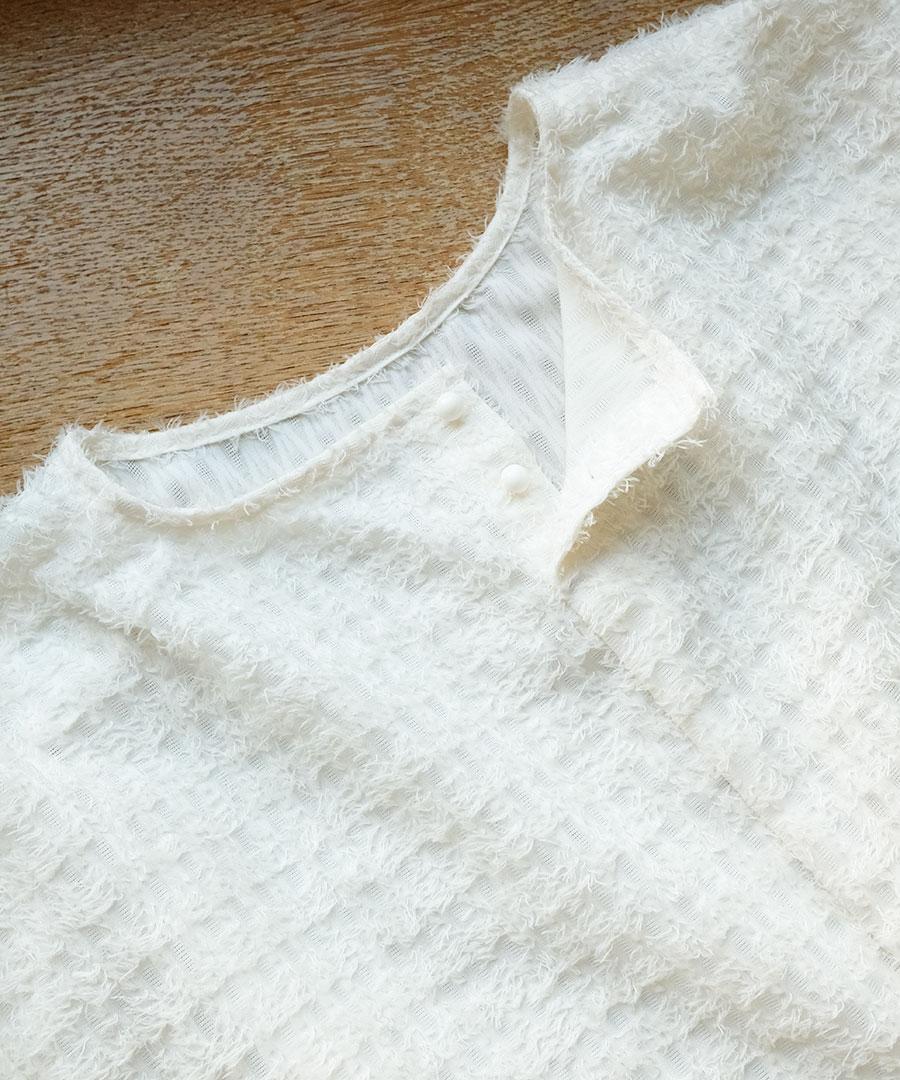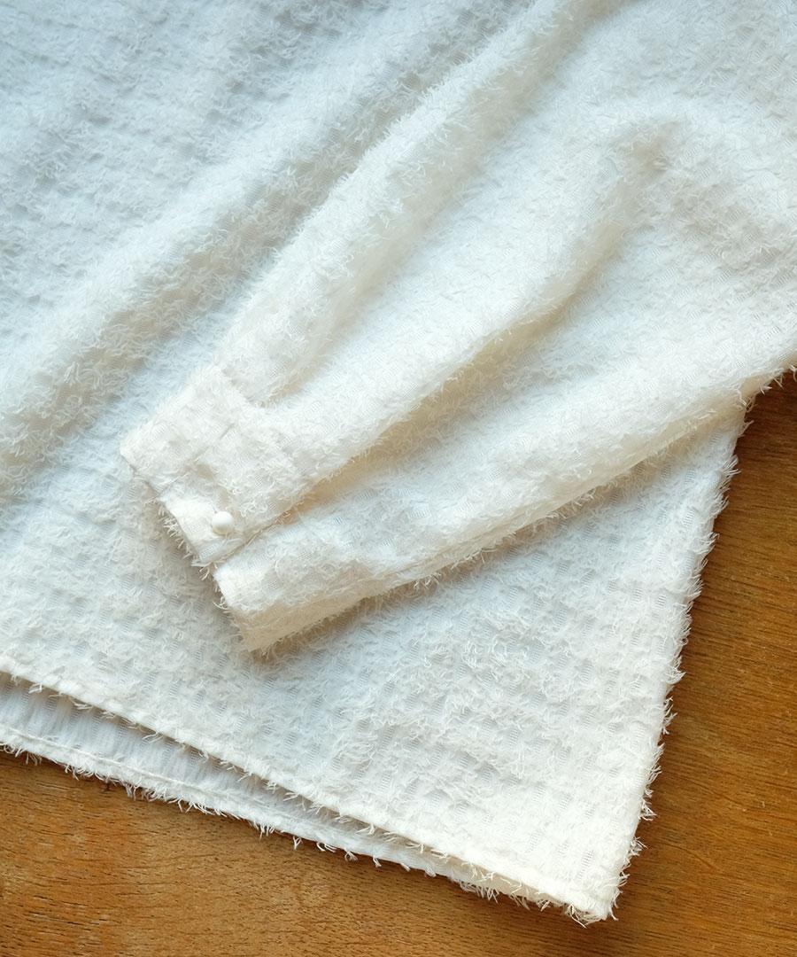 高密度に織り上げたジャガード生地を部分的にシアーにすることで、繊細ながらもハリのある風合いになっています。