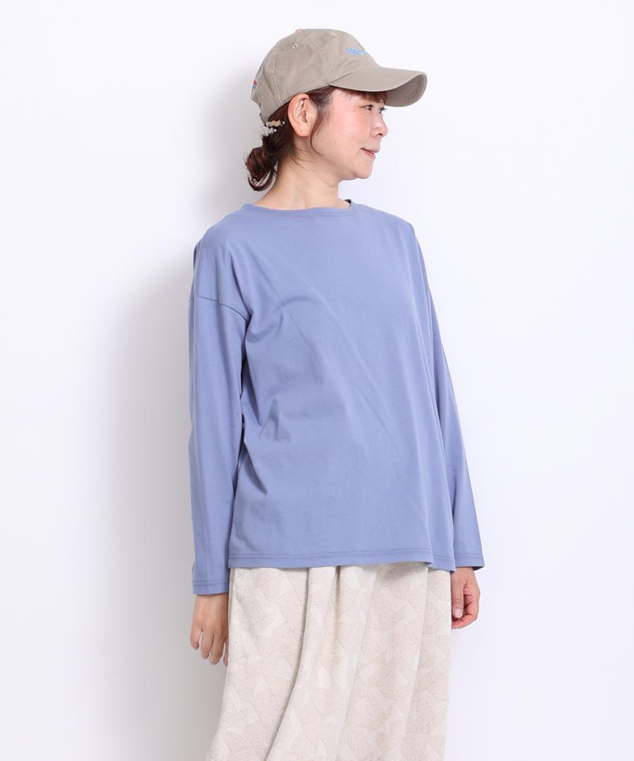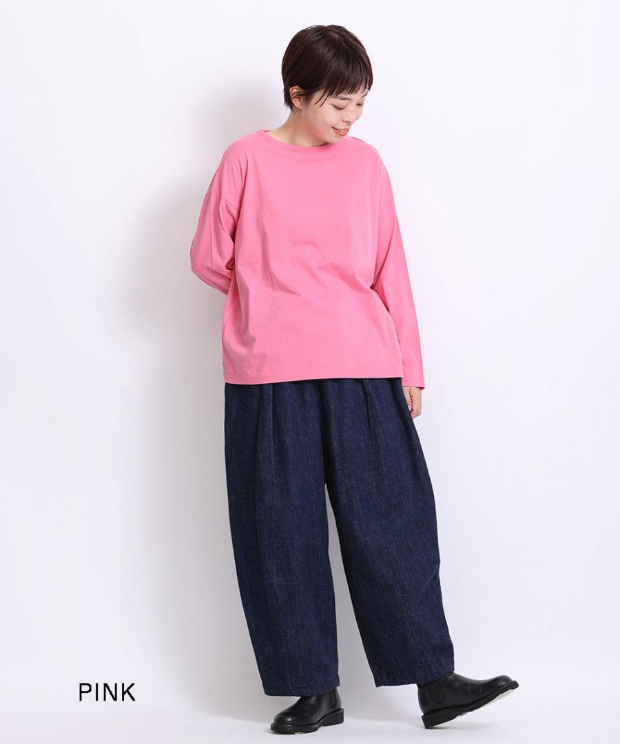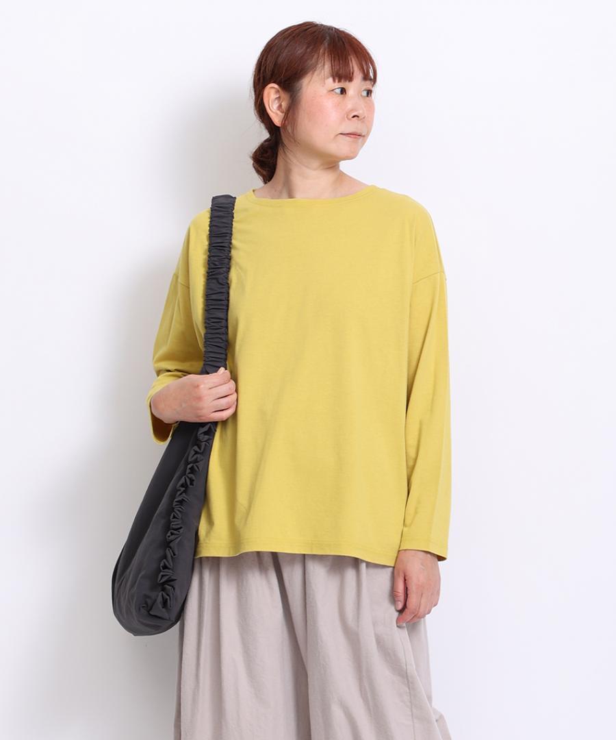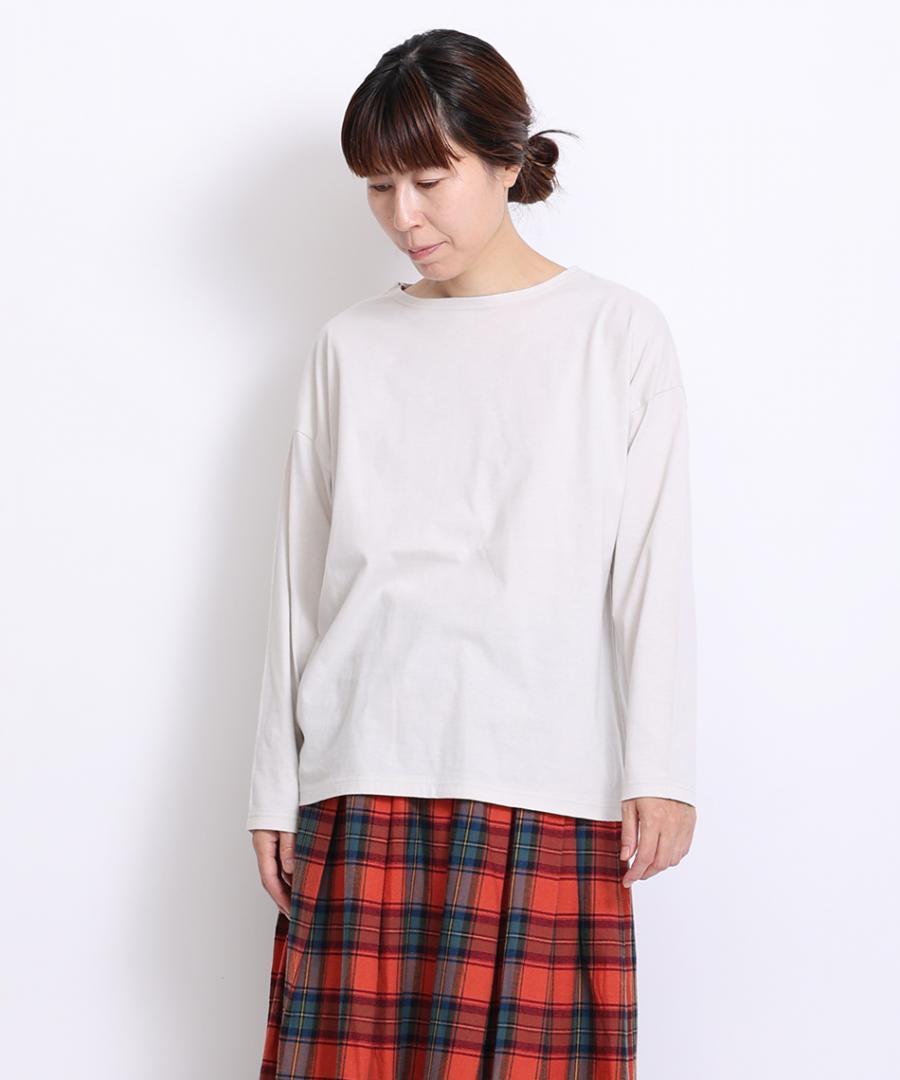 襟はボートネック、身頃幅を十分にとり、ゆるすぎずぴったりしすぎずなシルエットになっています。