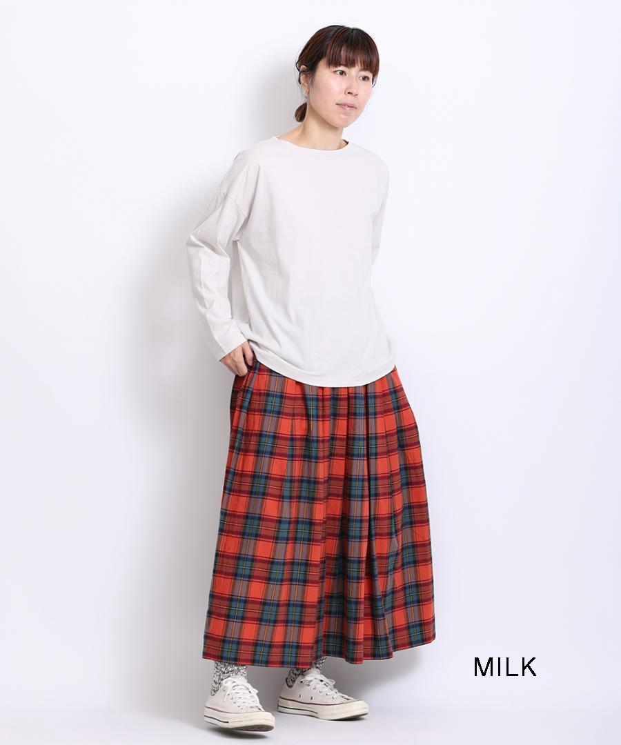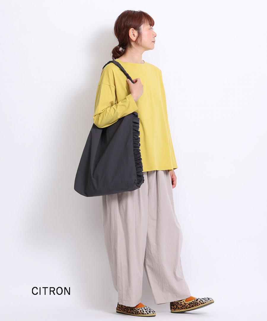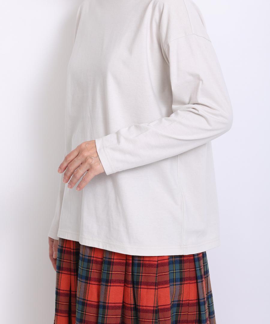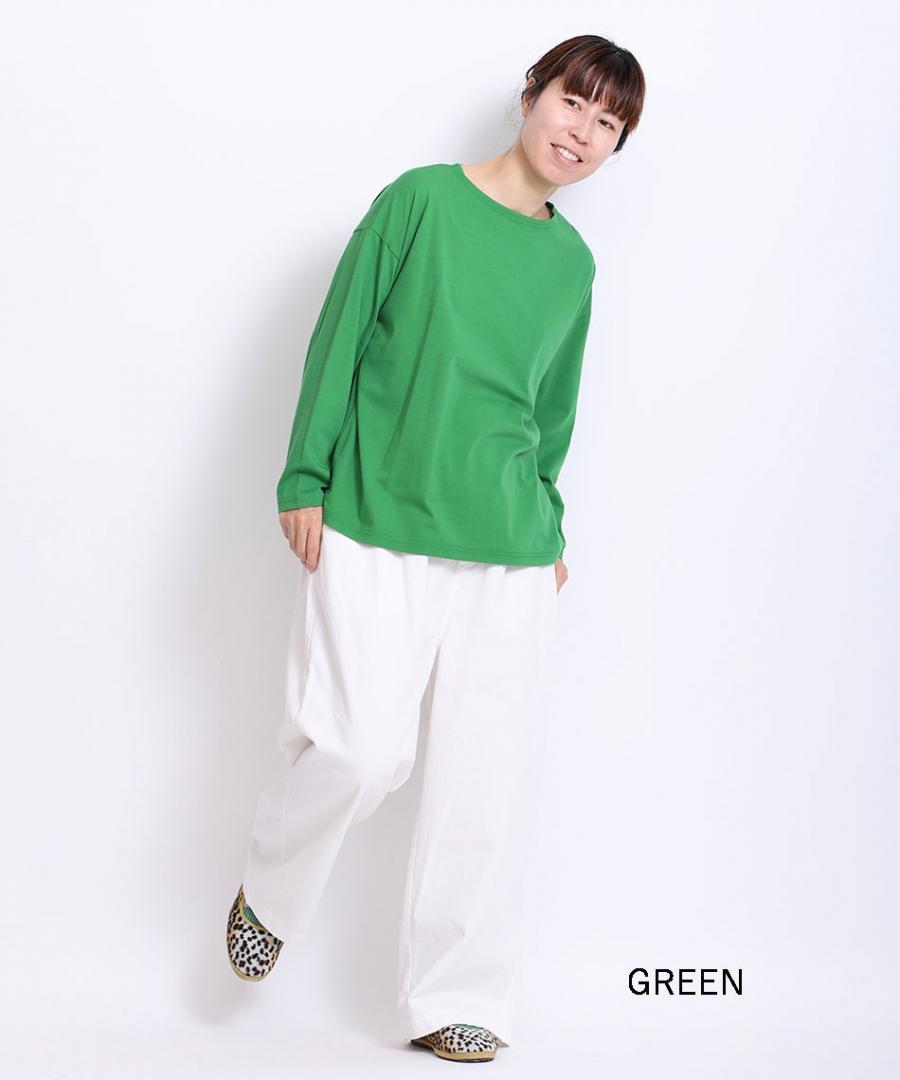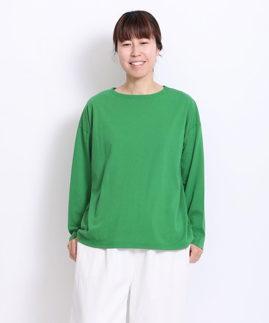 襟はボートネック、身頃幅を十分にとり、ゆるすぎずぴったりしすぎずなシルエットになっています。