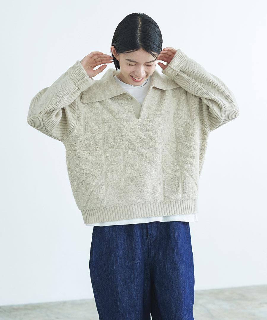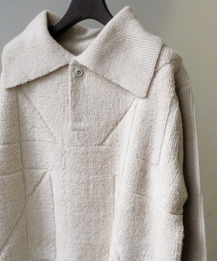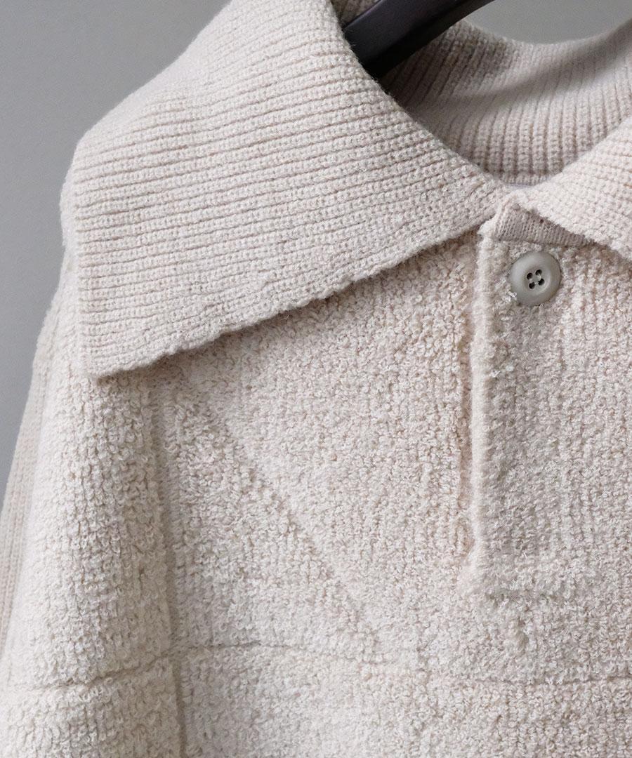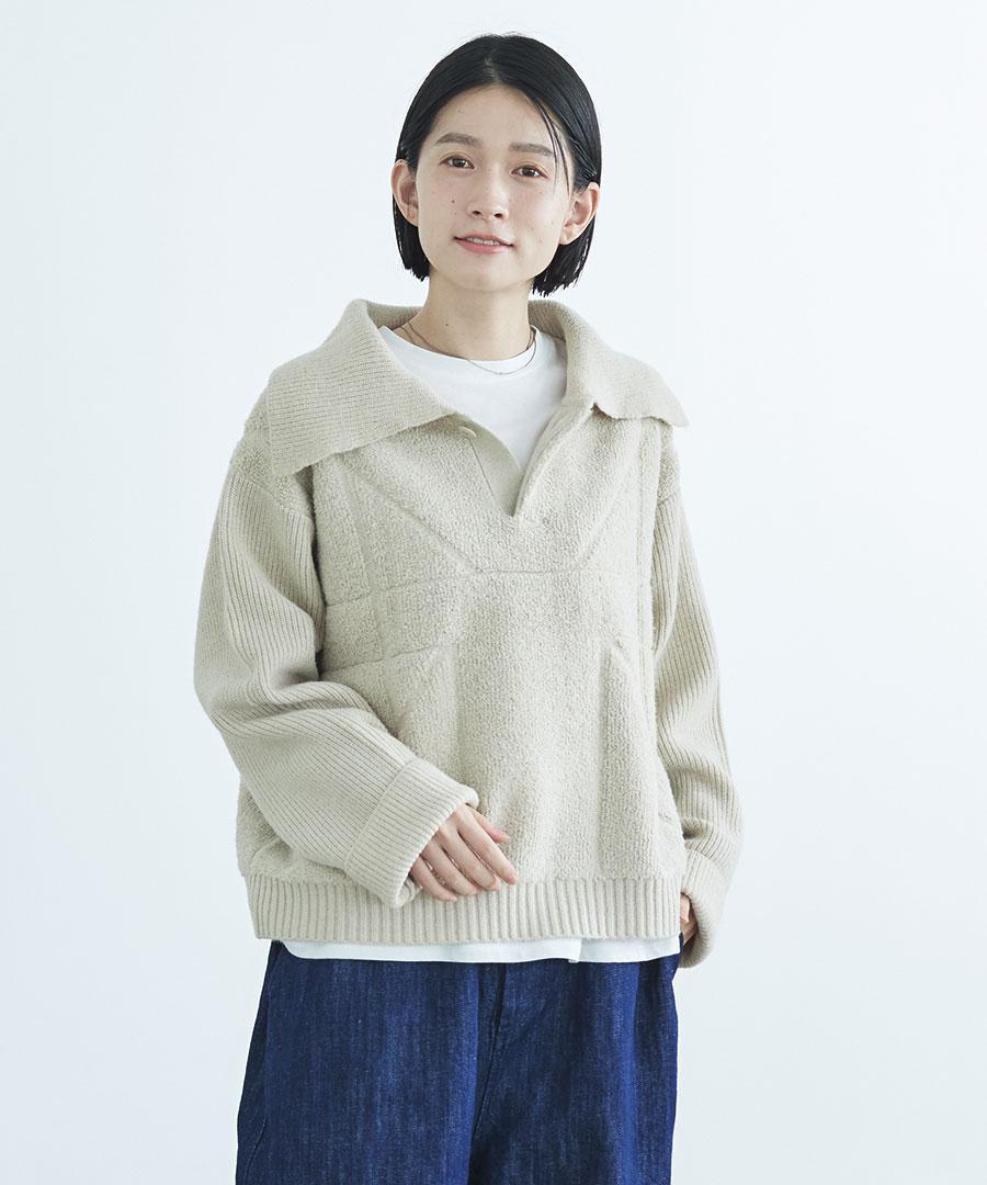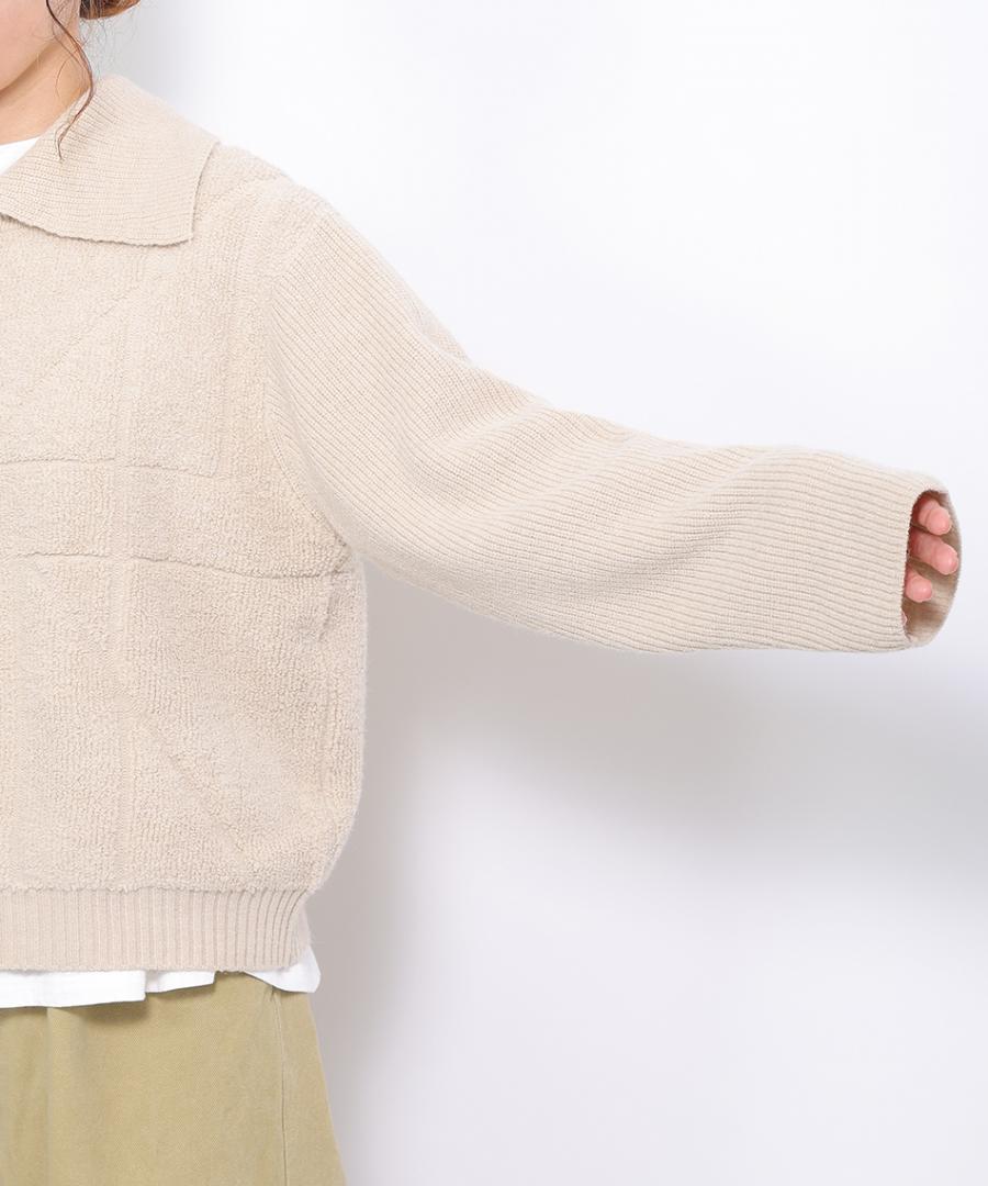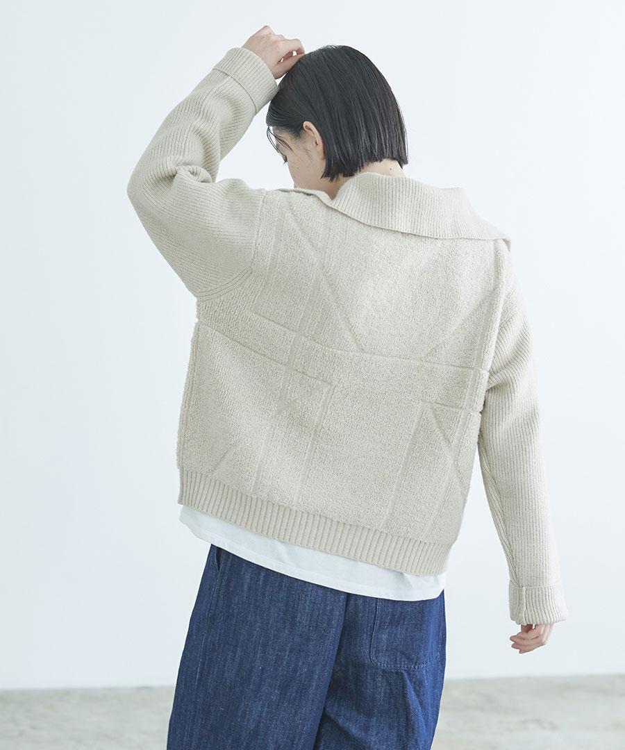 キルト風の柄をパイルジャガードで表現し、ポコポコとした表面感が魅力的なニット。