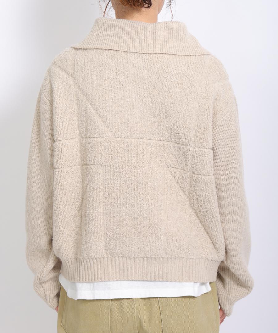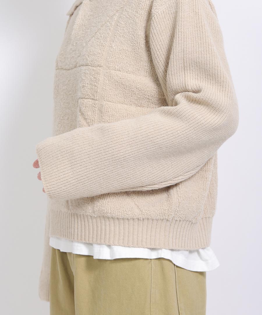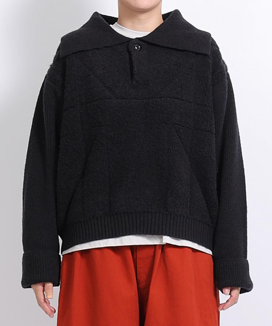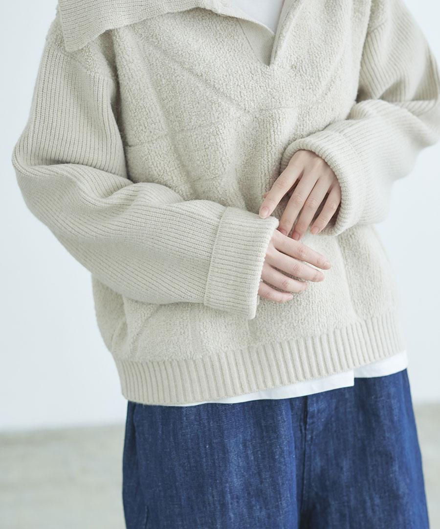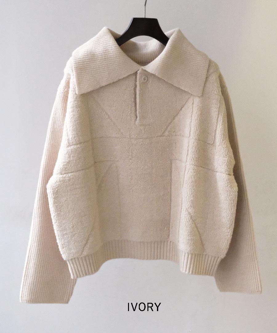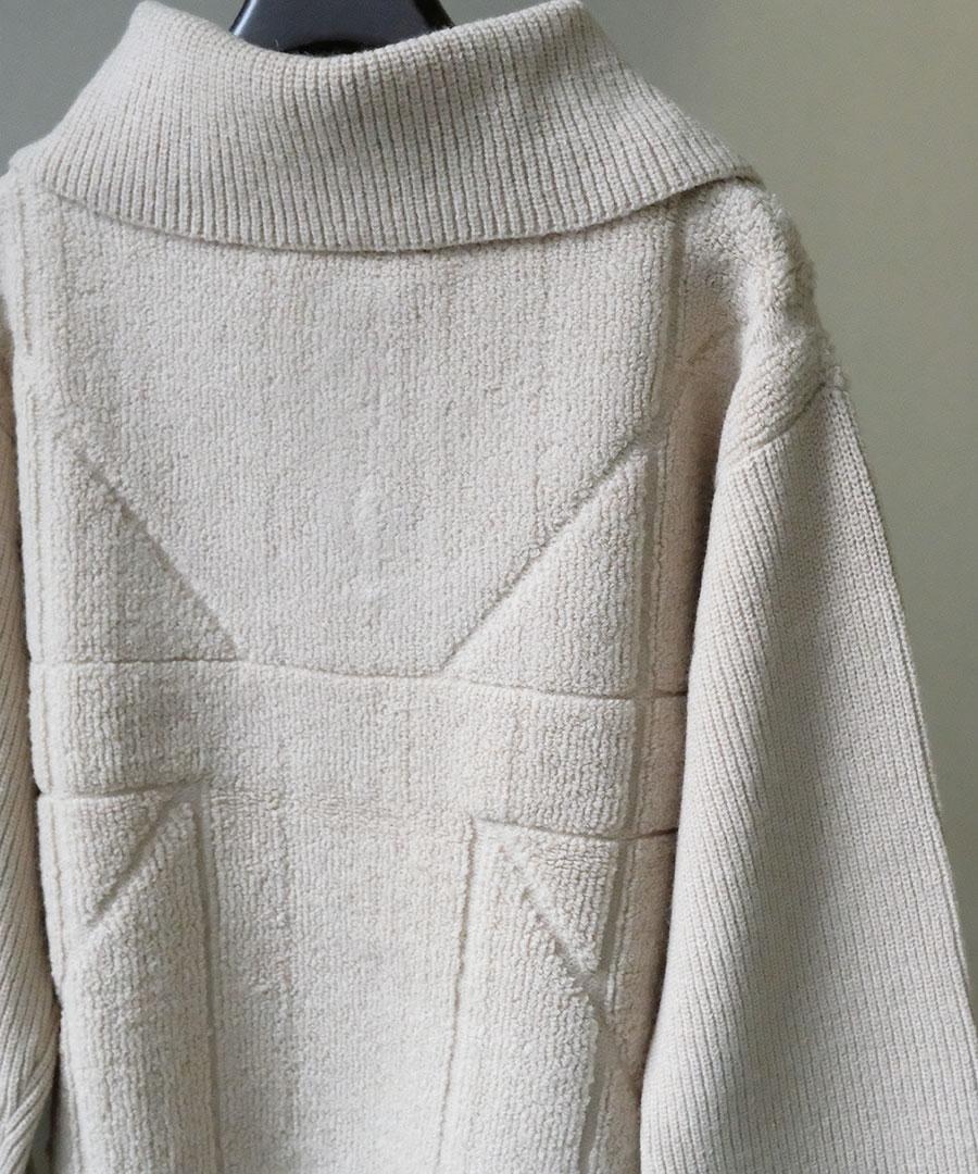 キルト風の柄をパイルジャガードで表現し、ポコポコとした表面感が魅力的なニット。
