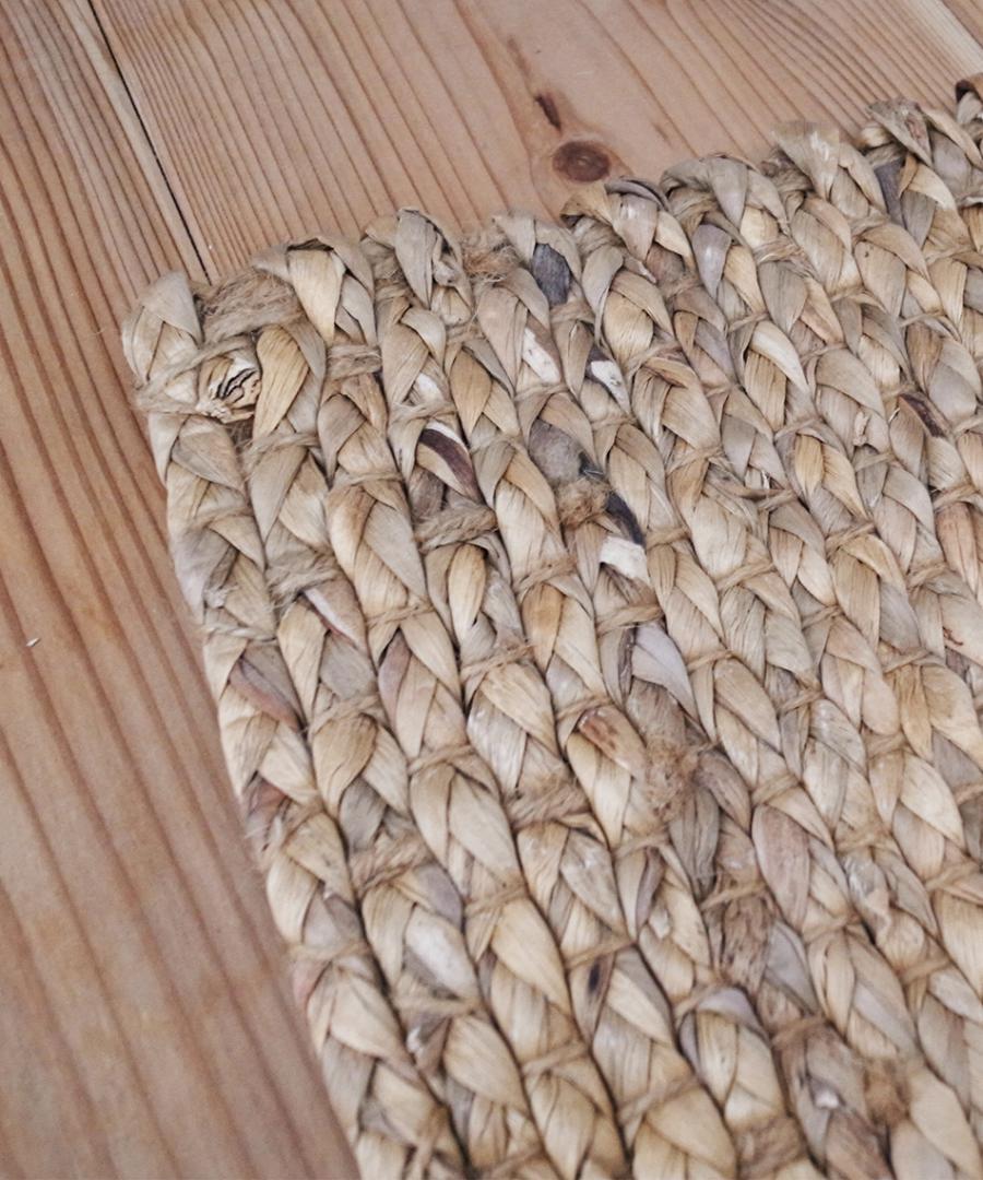 アジアン家具などにも使われているウォーターヒヤシンスで、 しっかりと編み込まれているので丈夫で、柔らかです。ウォーターヒヤシンスは水草ですが、この茎を乾燥させたものを織ってつくっています。