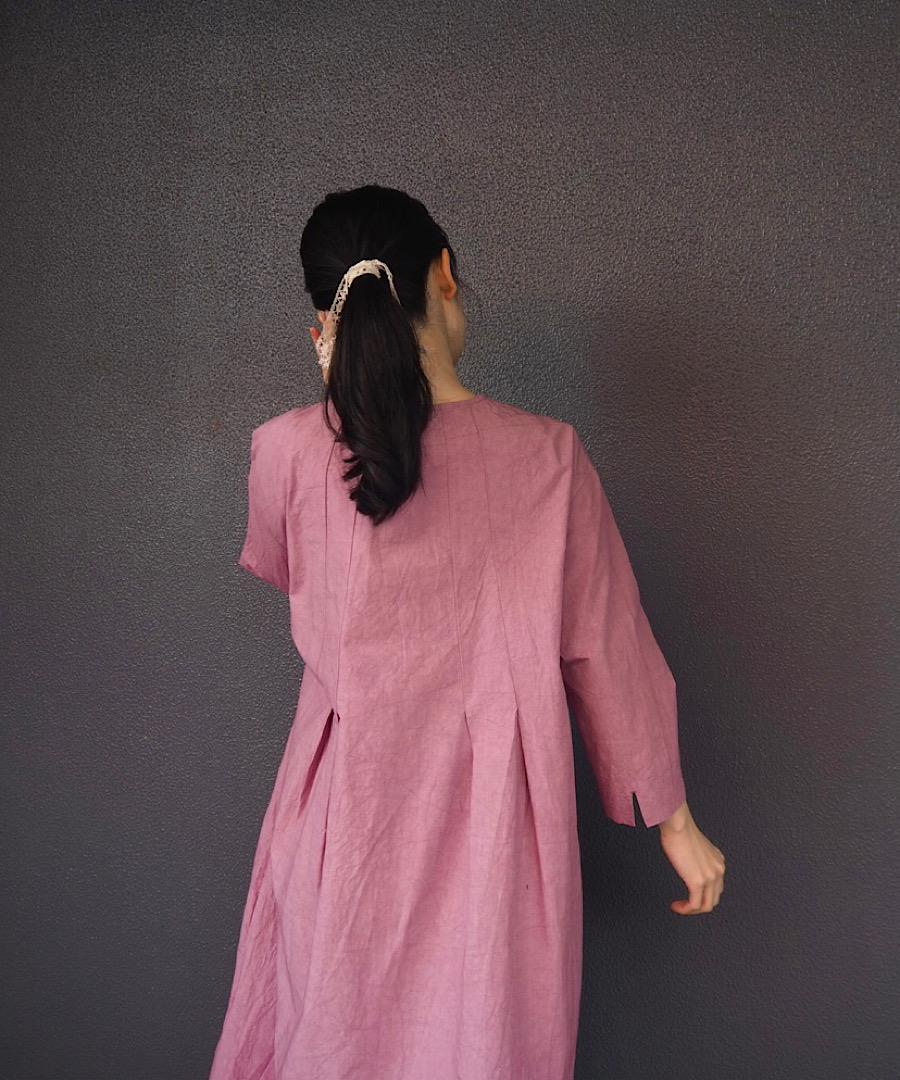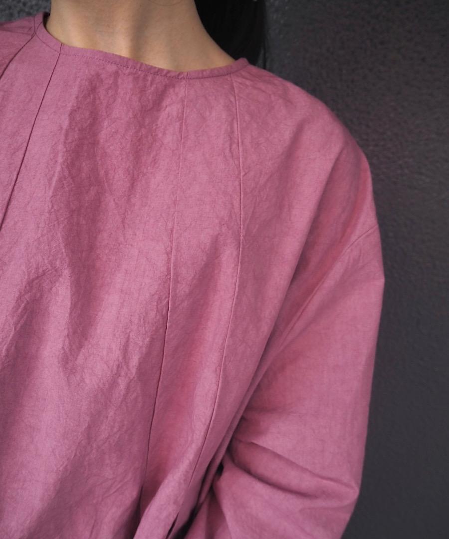 高密度に織られたコットンリネン生地は、膨らみとムラ感を宿した染めの風合いが、シンプルな佇まいにこなれた余韻を添えます。