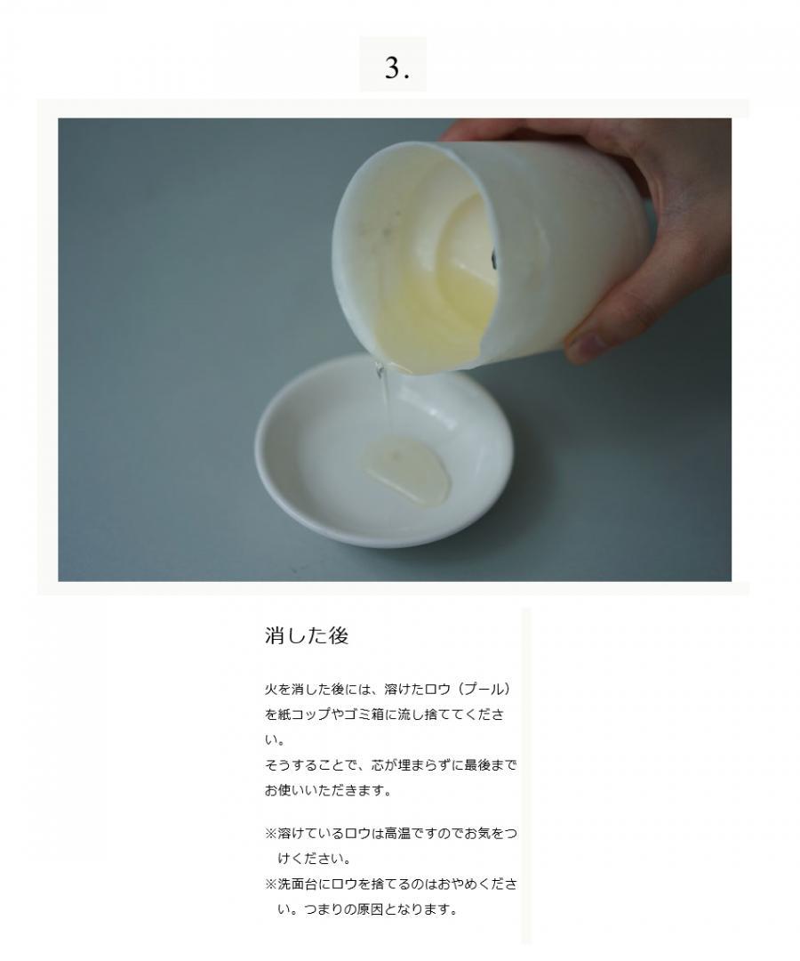 ※消火後はロウは温かいうちにゴミ袋などに捨ててください。そうすることで芯が埋まることを防ぐことができます。