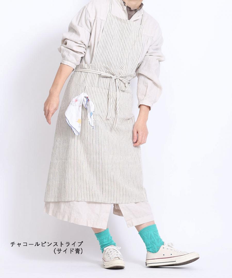 男女兼用でつけられるサイズ感のエプロンは胸当て部分を折り曲げても使えます。