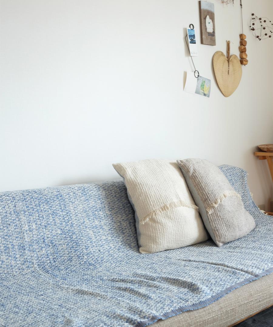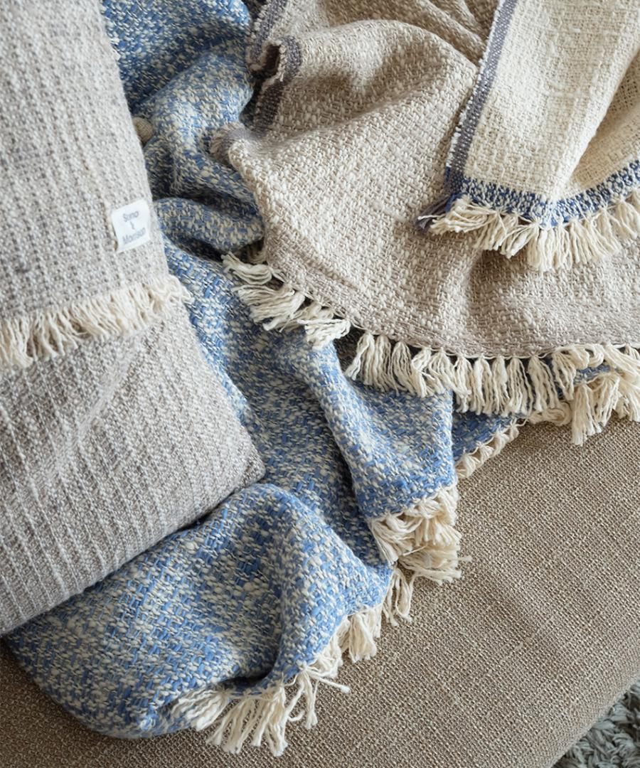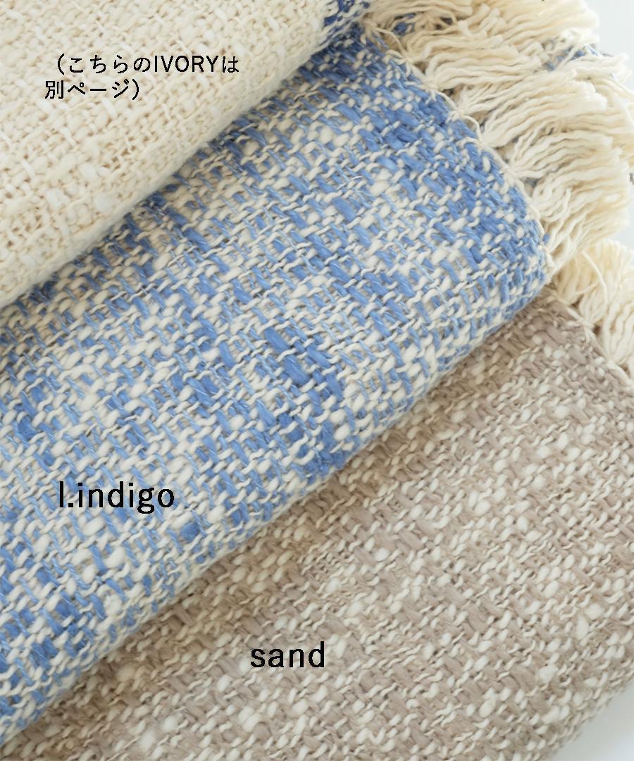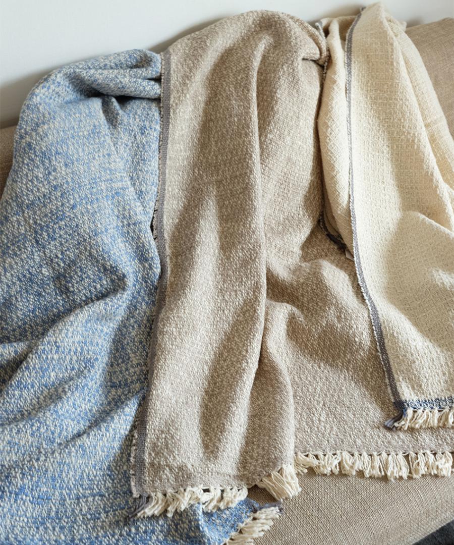 こちらは表と裏のカラーが異なるダブルフェイスという織り方をしていますお色はサンドとライトインディゴの2色、100×190の大判サイズです。
