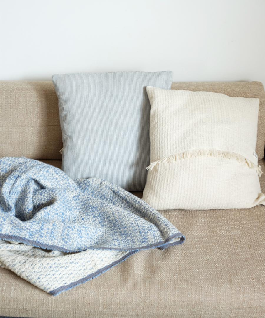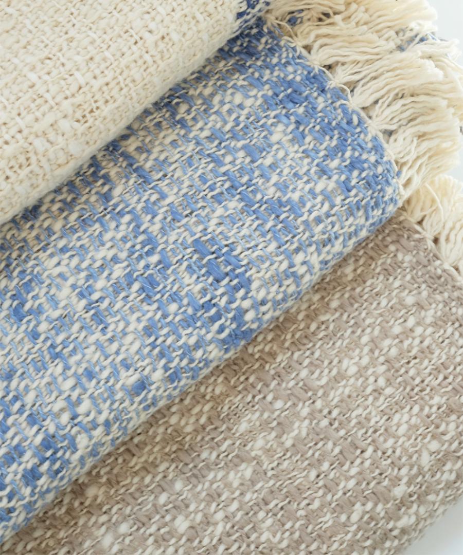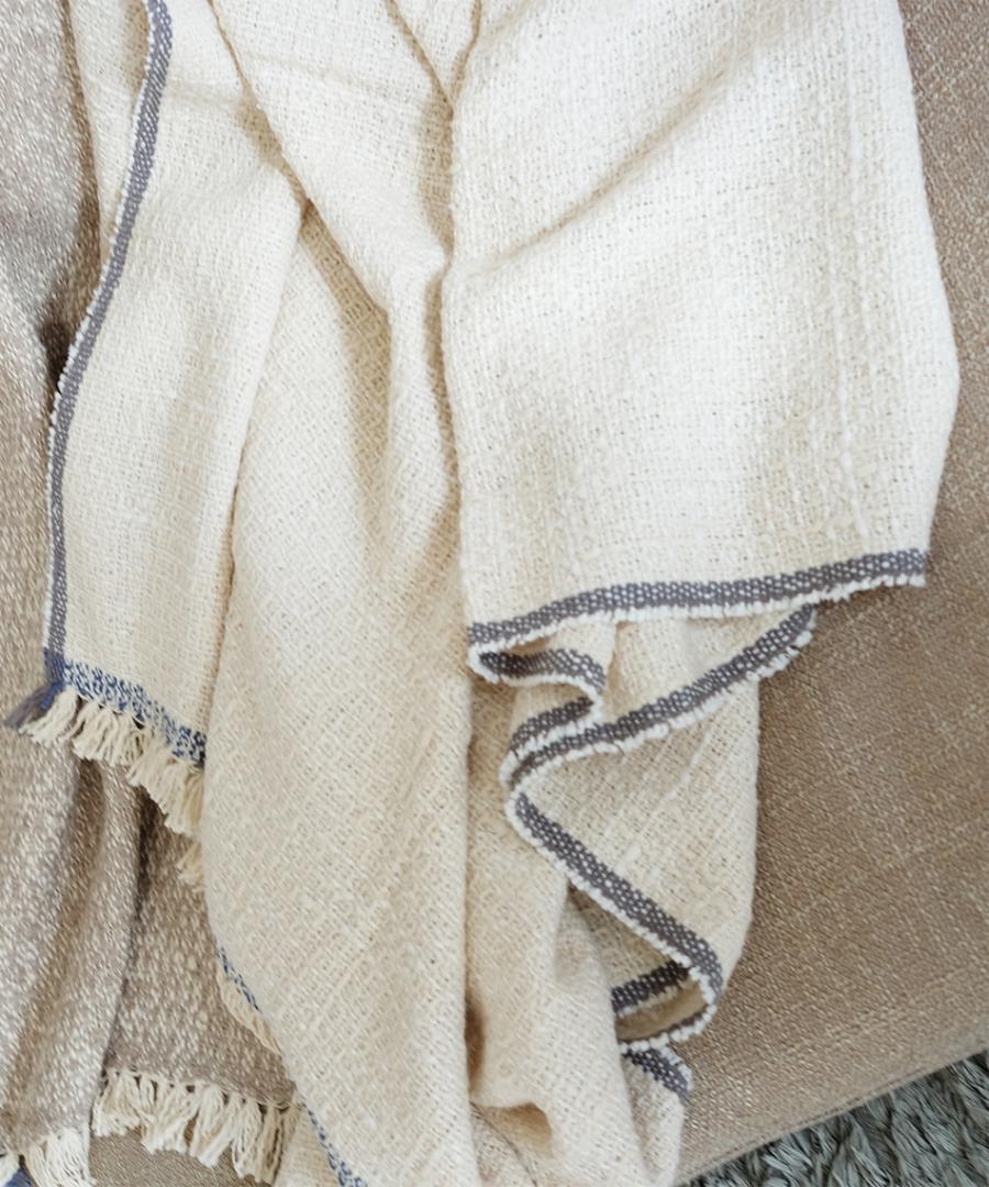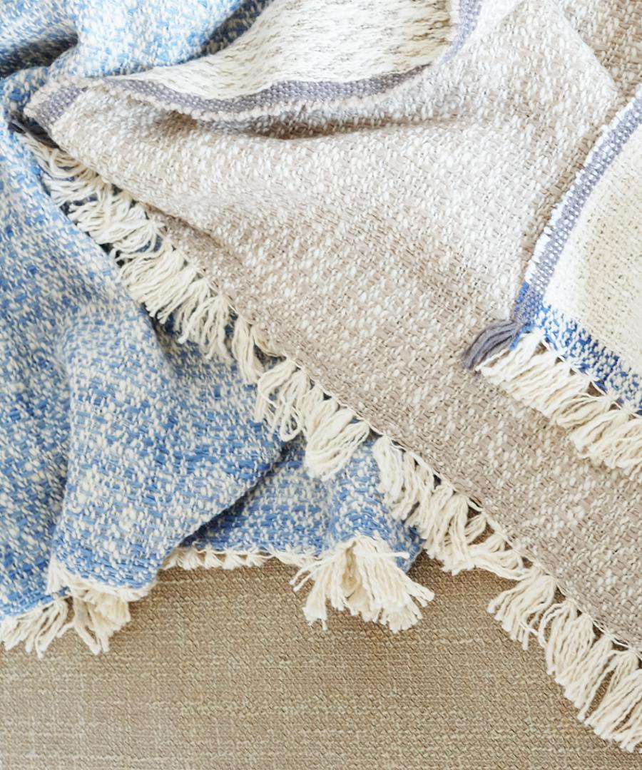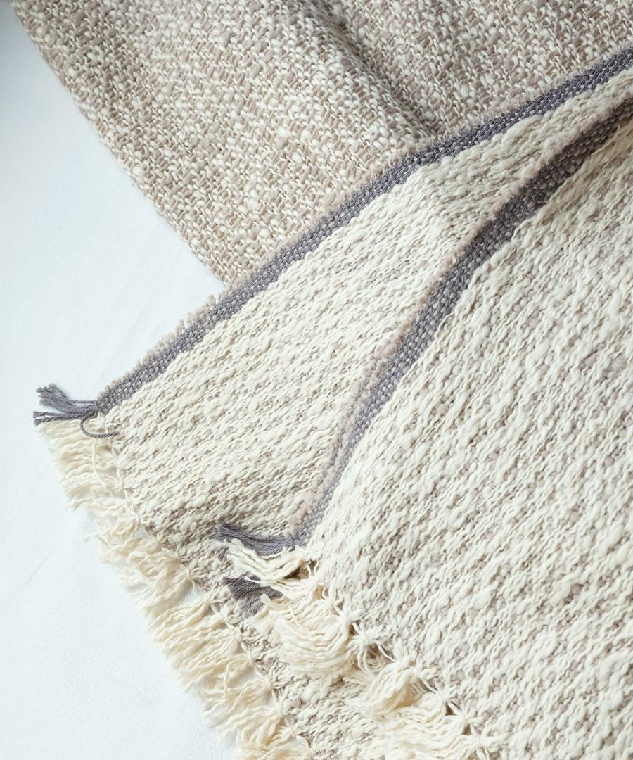 こちらは表と裏のカラーが異なるダブルフェイスという織り方をしていますお色はサンドとライトインディゴの2色、100×190の大判サイズです。